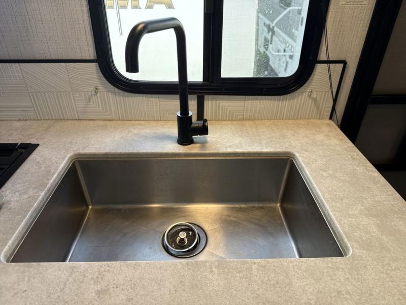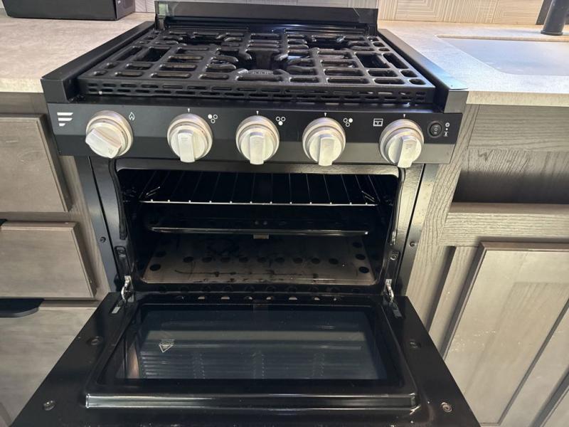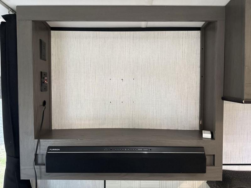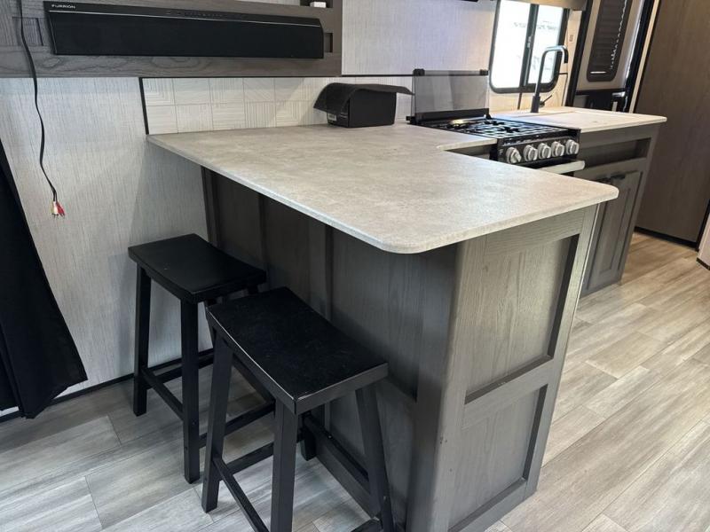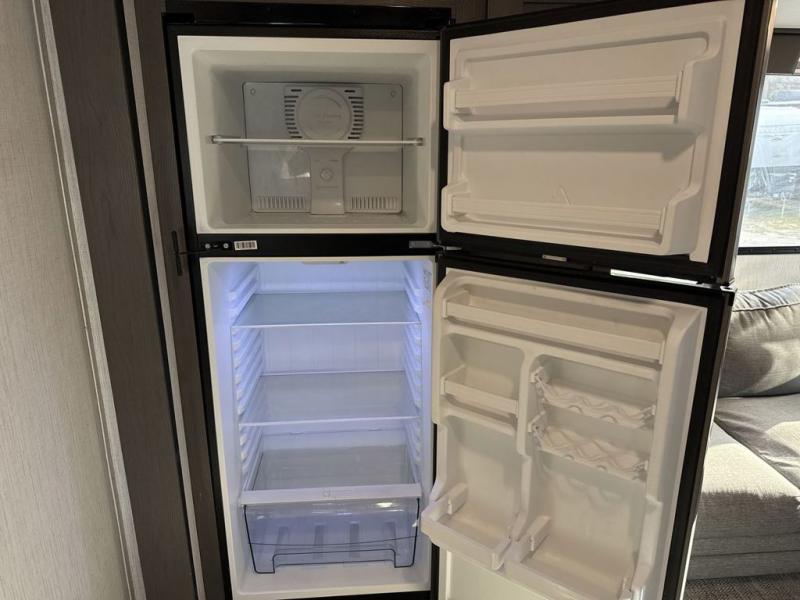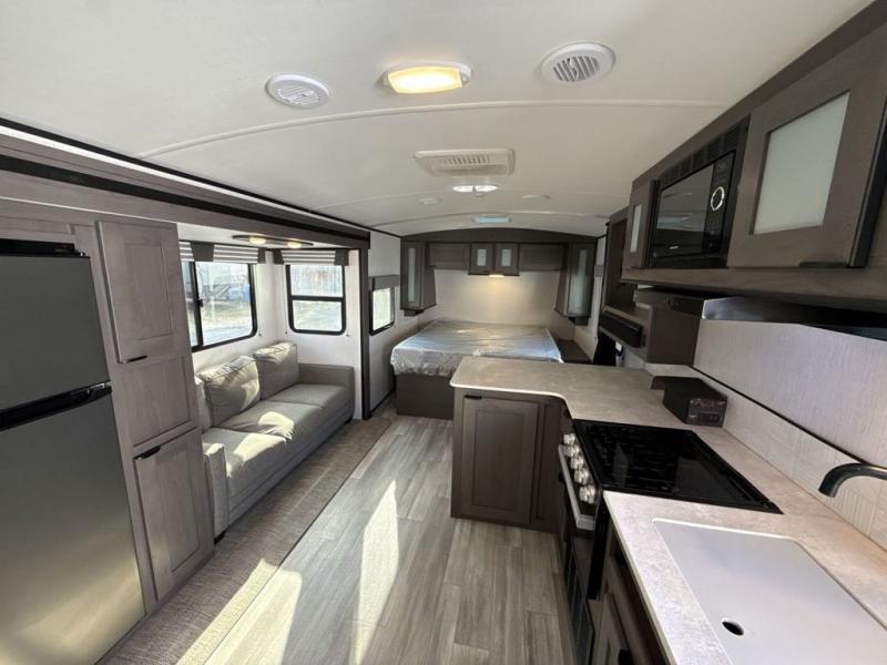This is the perfect couple's trailer with space for an overnight guest on the sofa within the large slide out. You will enjoy the sliding king bed in the front bedroom, plus there are dual wardrobes for your clothes. The kitchen includes a counter with two stools for breakfast in the morning, two pantries, plus a 10.7 cu. ft. double door refrigerator. A rear corner full bath on board allows you to freshen up each day, and the exterior full belly storage system will be great for fishing poles, lawn chairs, and luggage!