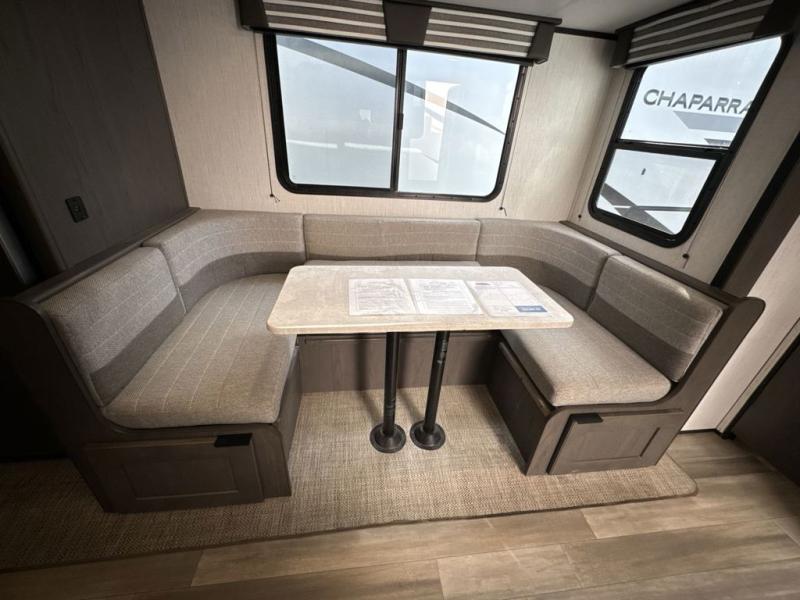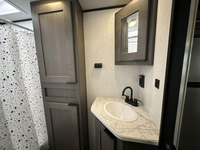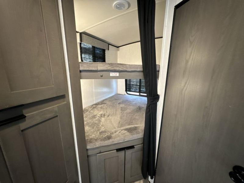 The whole family will love camping in this spacious travel trailer! There are double-size bunks for the little ones or your guests, a sliding king bed in the front private bedroom for you, plus a U-shaped dinette within the large slide out in the main living area to dine at or even sleep on. The chef can cook indoors on the three burner cooktop, or outdoors at the outside kitchen. And the rear corner full bathroom will keep everyone refreshed after being outdoors all day. There is a 19' patio awning to relax under and a full belly storage system to store the yard games in.