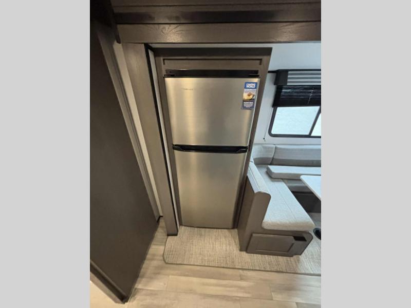 With any MPG travel trailer or toy hauler by Cruiser you will find a 6' 11" barrel roof, Azdel composite laminated walls, and a two-tone fiberglass front cap with LED lighting for a sleek look. There are seamless kitchen countertops and plywood flooring that will be easy to clean, plus residential hardwood cabinets with hidden hinges for a more at-home feel. The slam latch baggage doors with magnetic latches will make loading up easier than ever, plus the full belly storage system includes LED lights you are sure to appreciate. Each model also includes multiple charging stations with 12v and USB ports, a four speaker soundbar system to listen to your playlists, and a dual ducted 14,500 BTU A/C to keep you cool during those hot summer months!