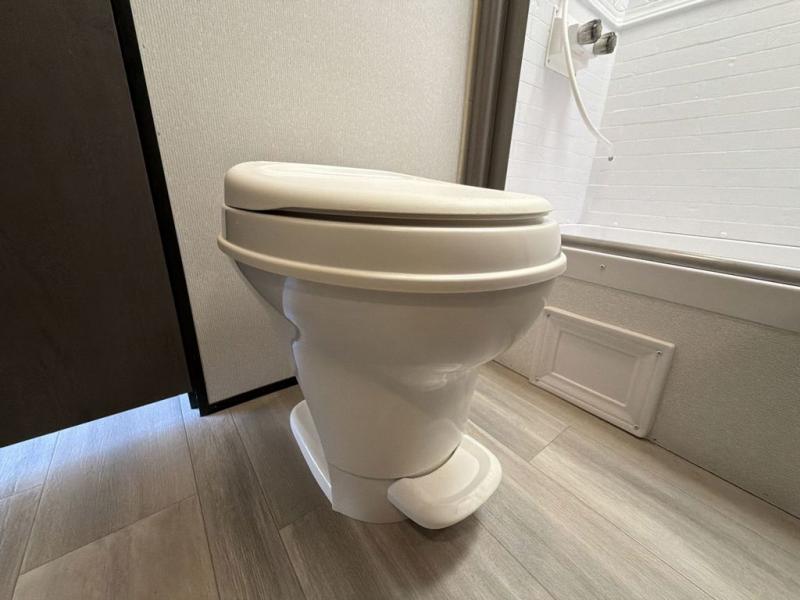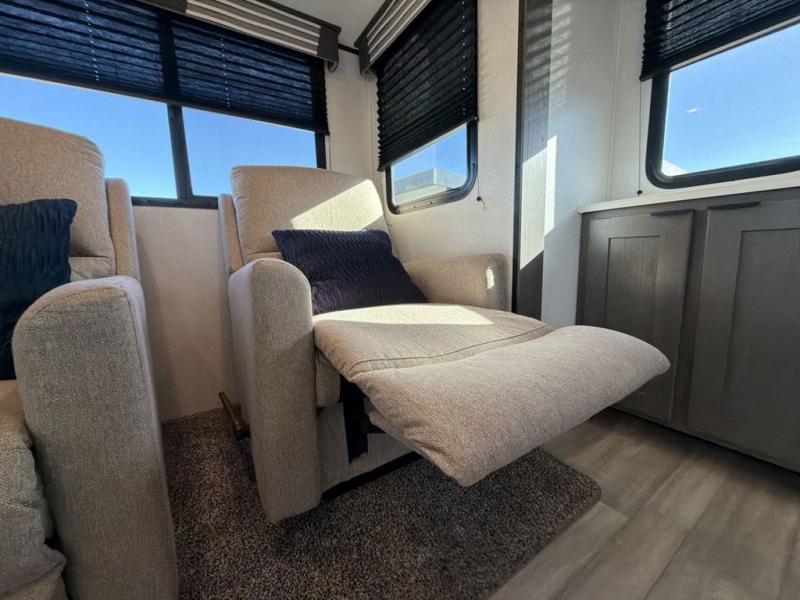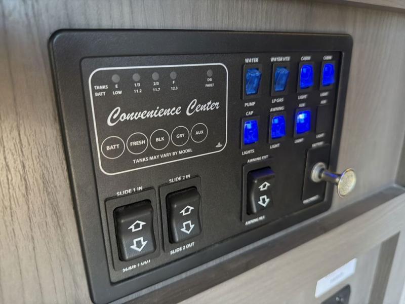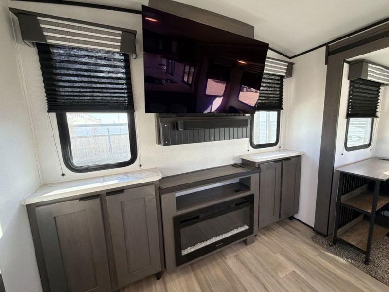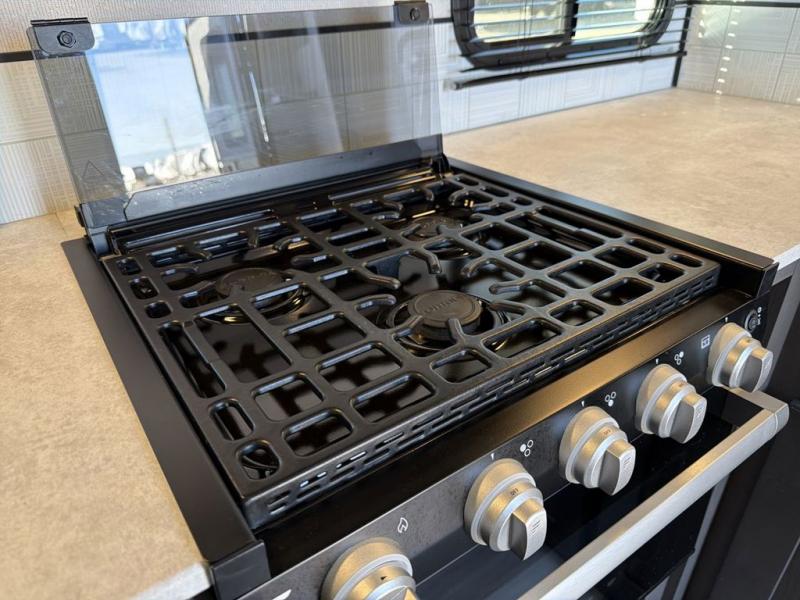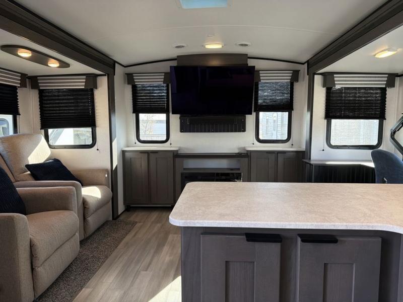This model will feel just like home with its spacious living area and front private bedroom. There is a rear entertainment center, and you can add the optional LED TV here for movie nights. Your crew can visit on the two sofas, plus one sofa includes a table where you can play a game of cards or dine together. The chef will love the kitchen that includes tons of counter space, a three burner cooktop, plus a 10.7 cu. ft. double door refrigerator. And don't overlook the walk-through bath and front master bedroom!