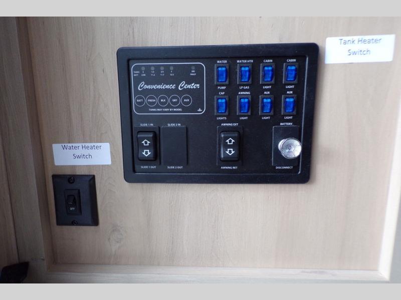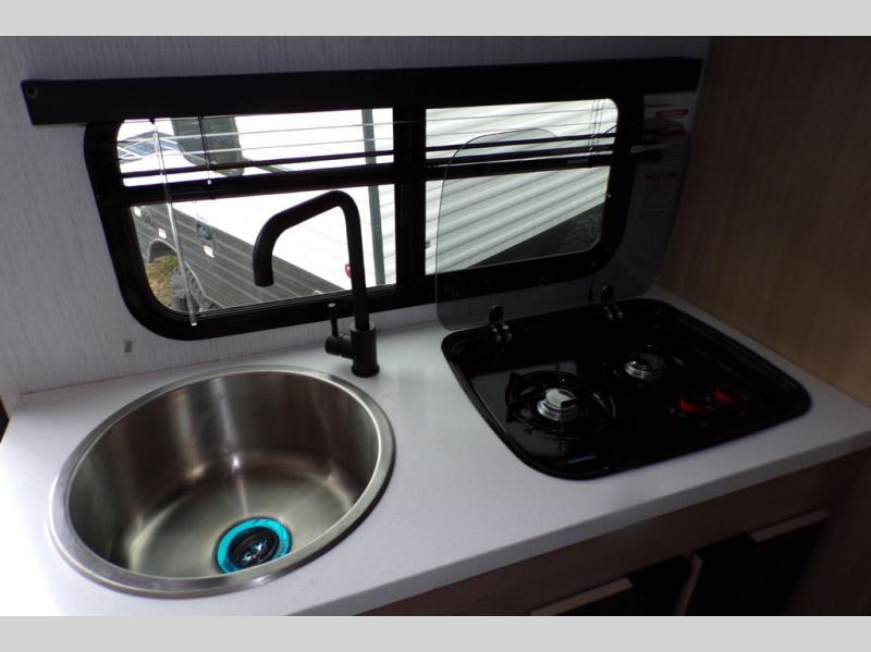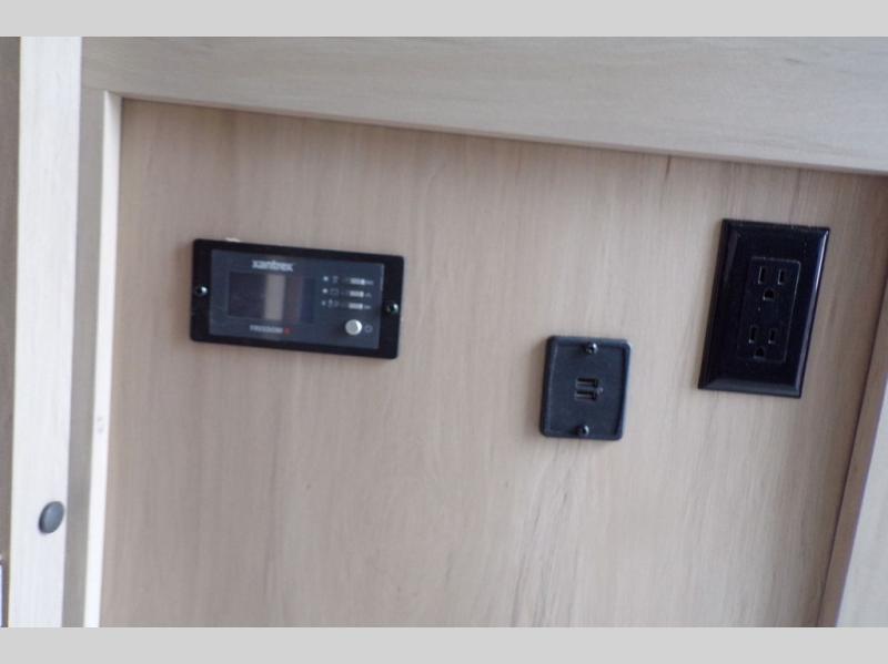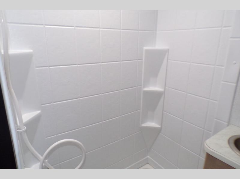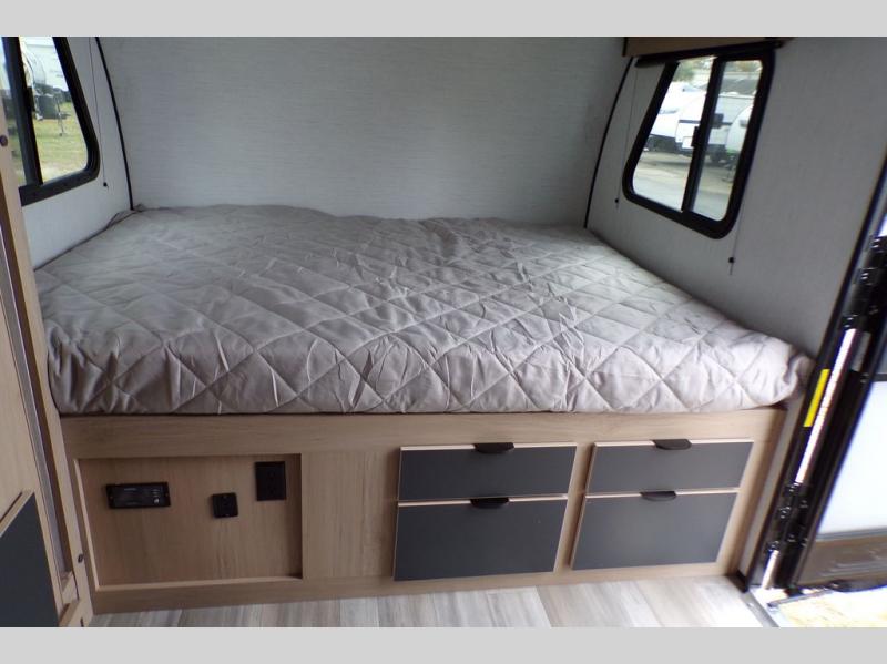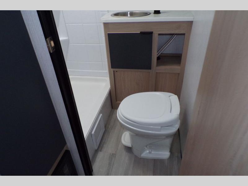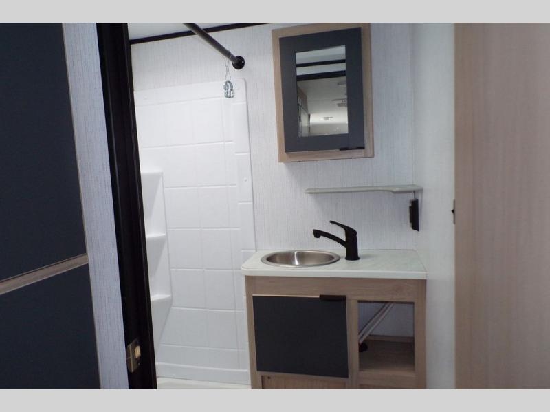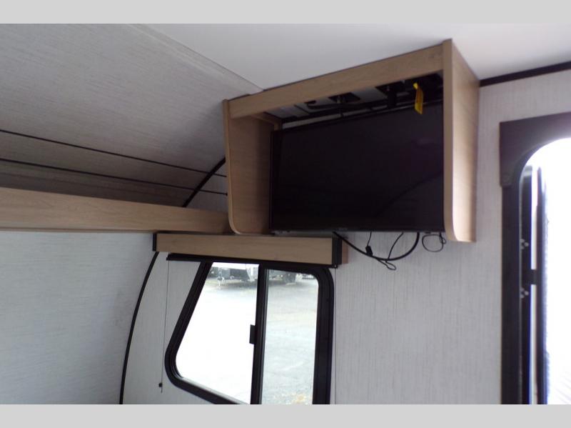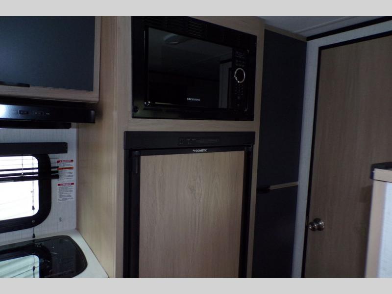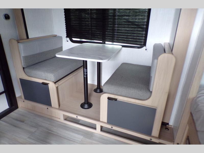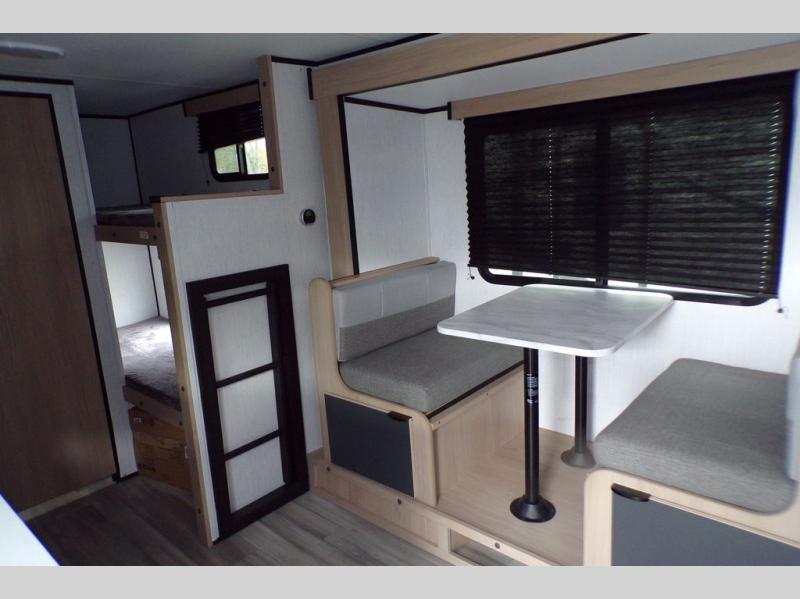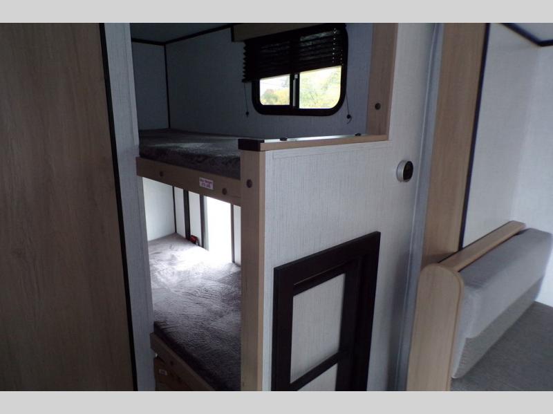 Load up the whole family and comfortably camp together in this travel trailer! There is a set of double bunk beds for the kids to sleep and the lower bunk can flip up for bike storage with a door to easily load and unload your bike. You will get a good night's rest on the front queen bed with drawers underneath to store your necessities. Plus, the booth dinette slide could even be transformed into an extra sleeping space when it's not being used to enjoy a delicious meal prepared with the two burner cooktop and 5 cu. ft. refrigerator. Everyone can freshen up in the rear corner bathroom with the shower/tub surround with a skylight above to let in some natural lighting!
