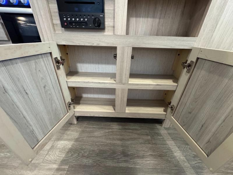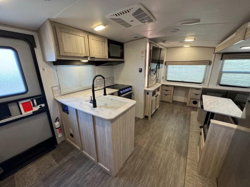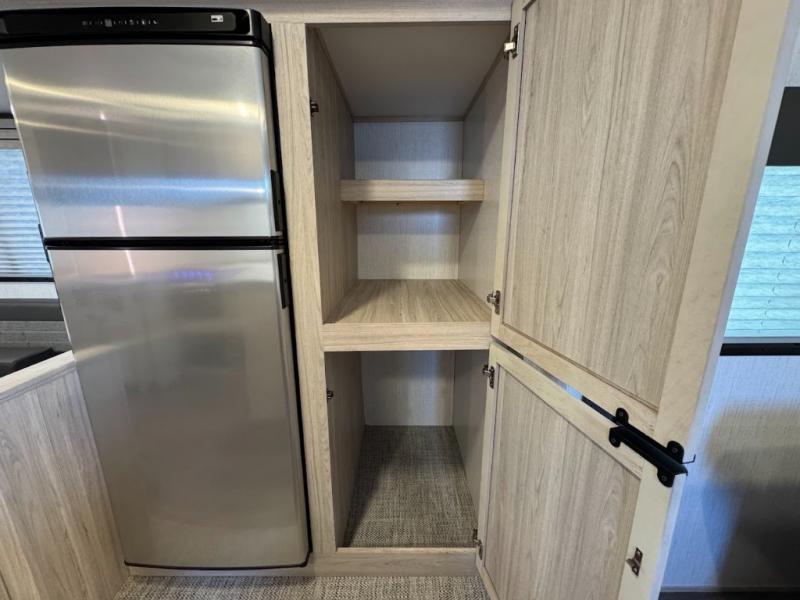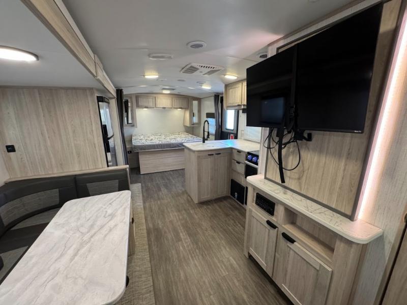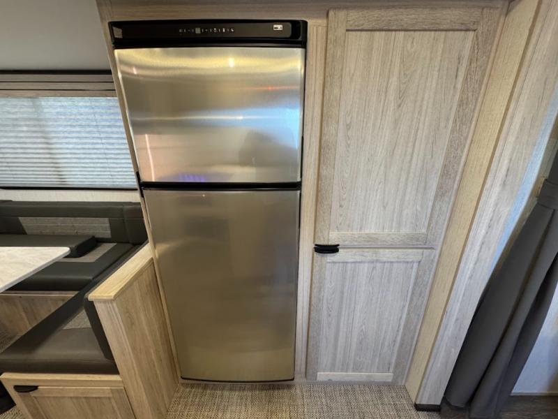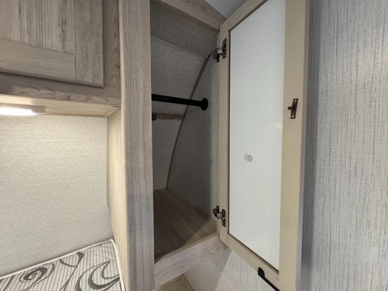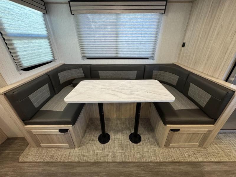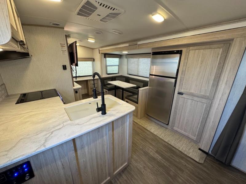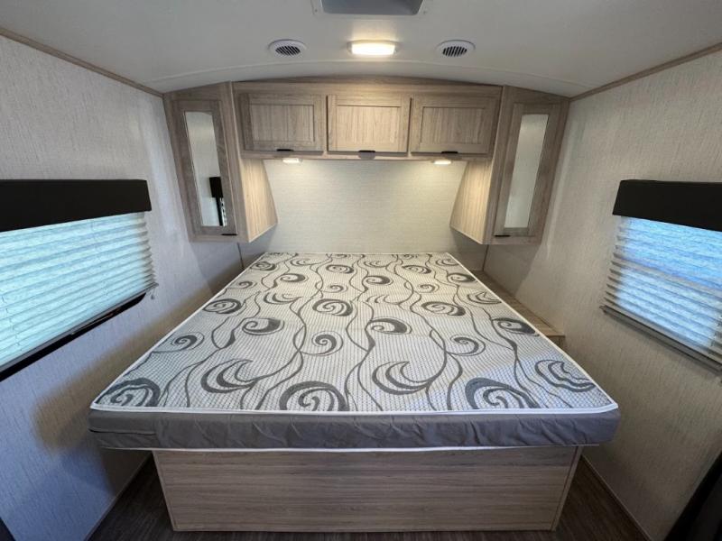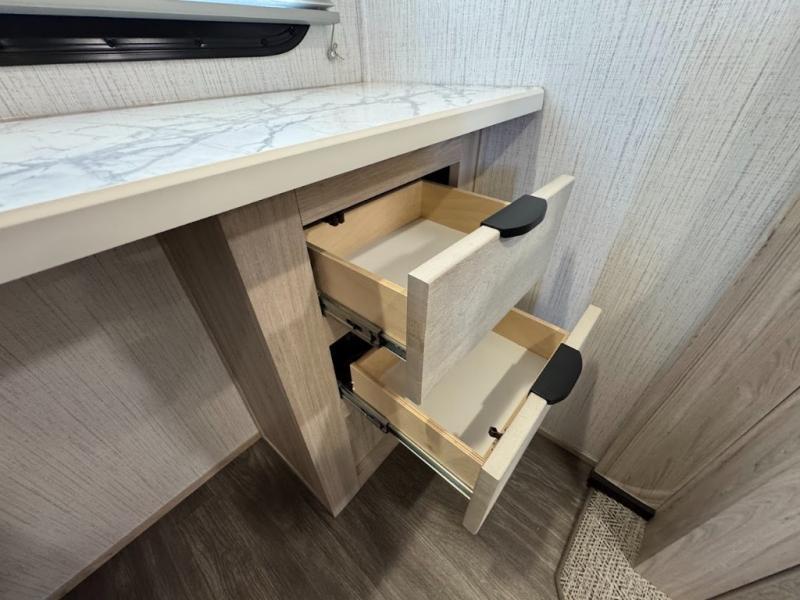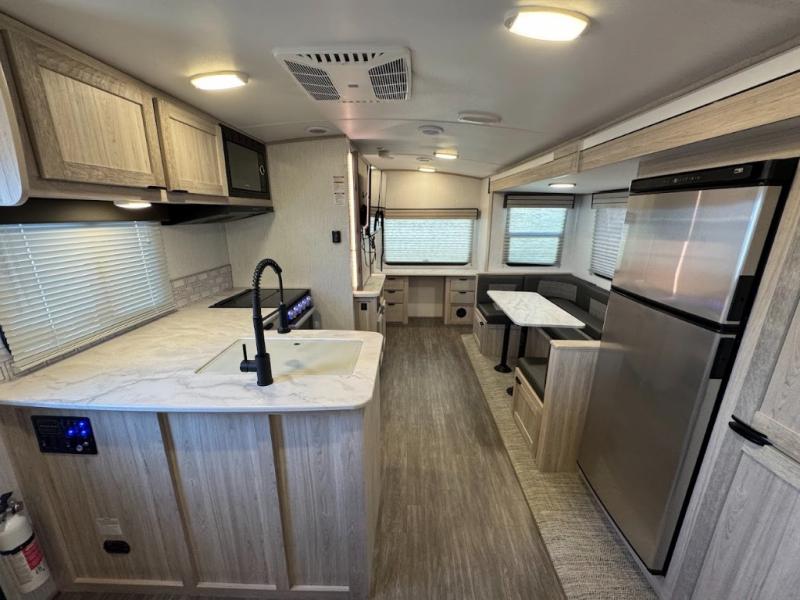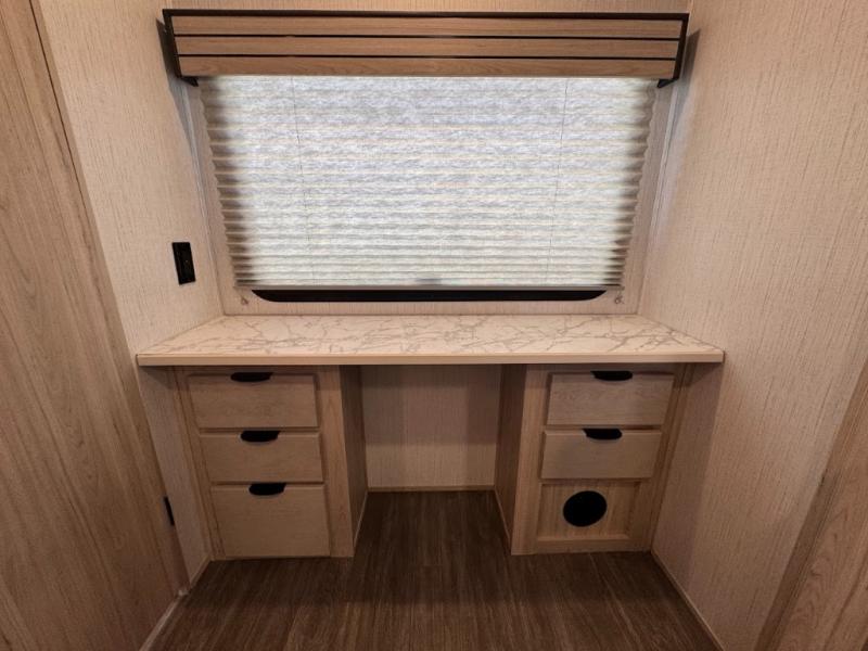 If you need to get a little work done while you are away then this travel trailer is perfect for you with the rear desk! The single slide provides more walking around space and houses the U-shaped dinette, 10.7 cu. ft. refrigerator, and pantry that is big enough to hold all of your favorite snacks. The front patent pending king bed sliding system has a pet palace underneath with a cruise-thru storage design and there are wardrobes on either side to keep your clothes looking their best, plus a privacy curtain to draw while you change or sleep. The exterior full belly storage system is big enough for all of your outdoor gear and the 15' electric awning has LED lights to highlight the good times at night!