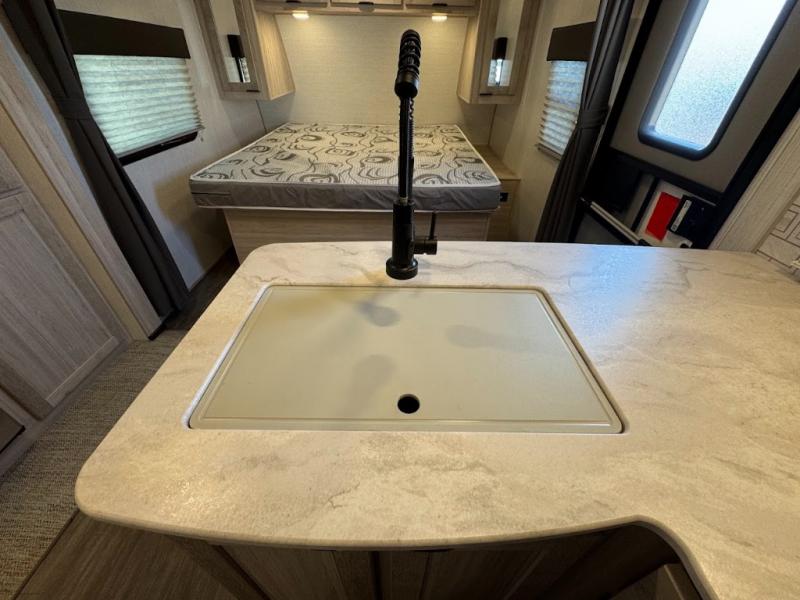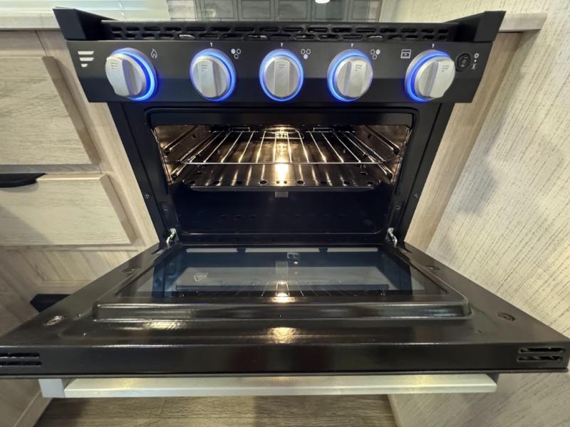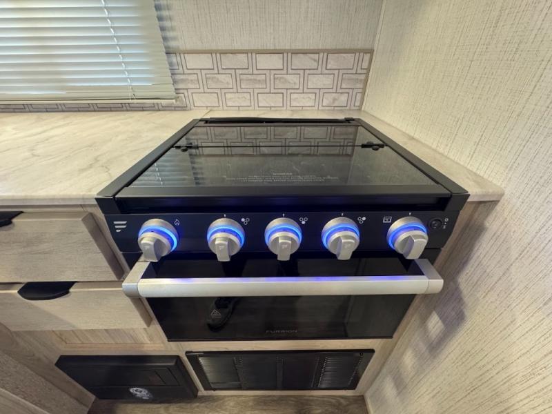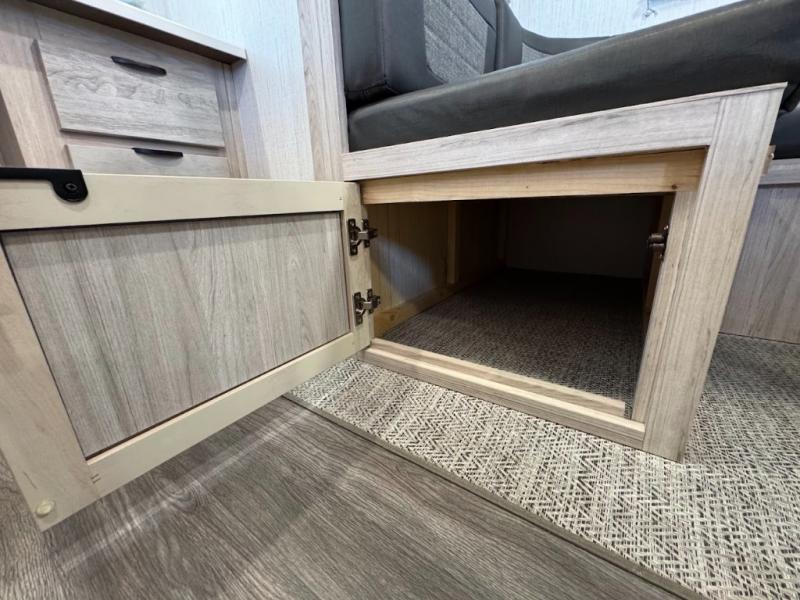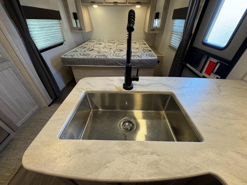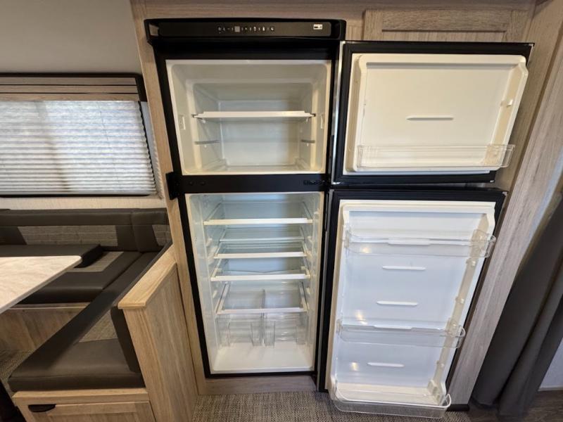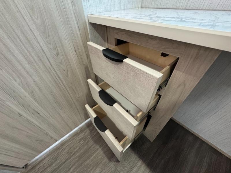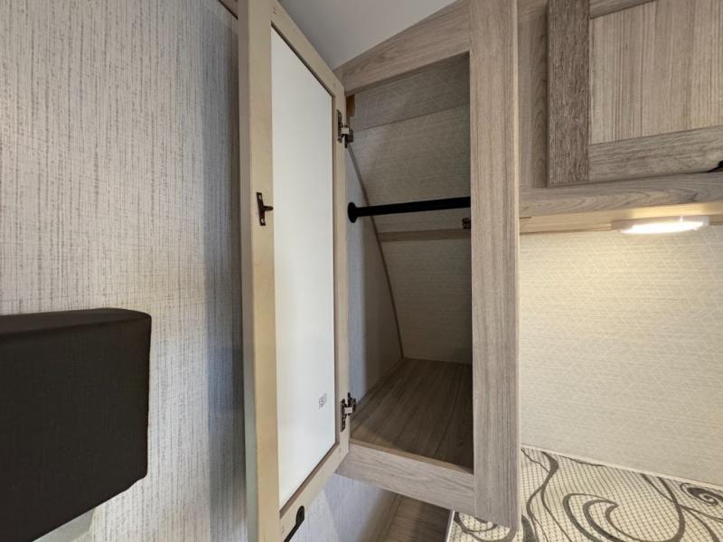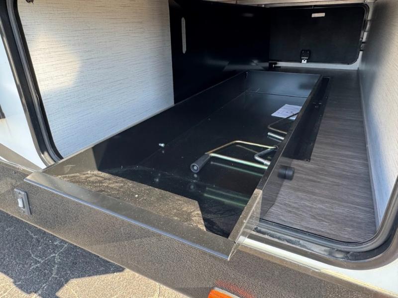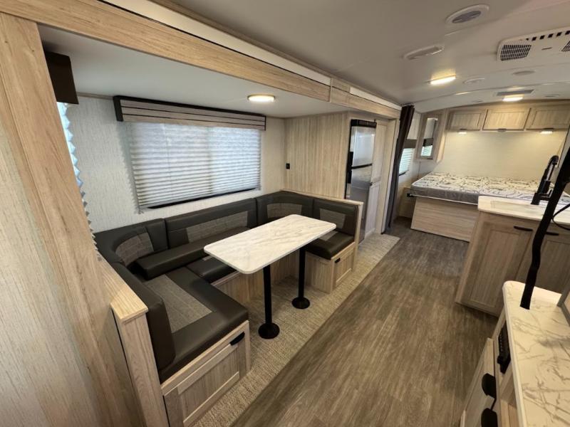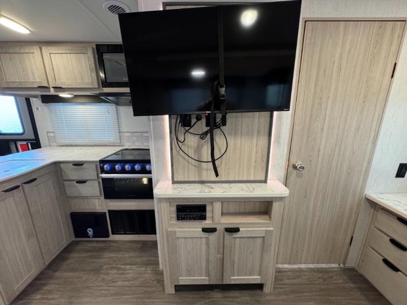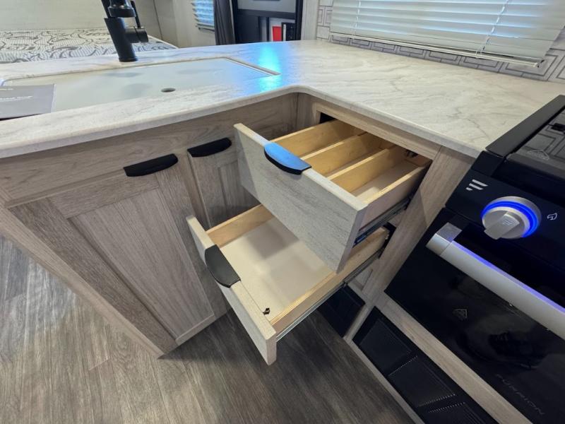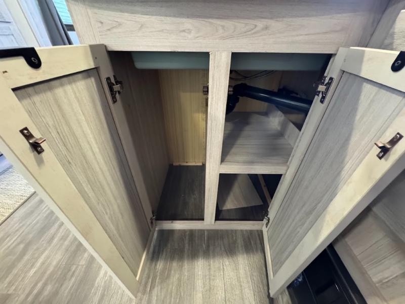 If you need to get a little work done while you are away then this travel trailer is perfect for you with the rear desk! The single slide provides more walking around space and houses the U-shaped dinette, 10.7 cu. ft. refrigerator, and pantry that is big enough to hold all of your favorite snacks. The front patent pending king bed sliding system has a pet palace underneath with a cruise-thru storage design and there are wardrobes on either side to keep your clothes looking their best, plus a privacy curtain to draw while you change or sleep. The exterior full belly storage system is big enough for all of your outdoor gear and the 15' electric awning has LED lights to highlight the good times at night!