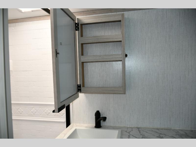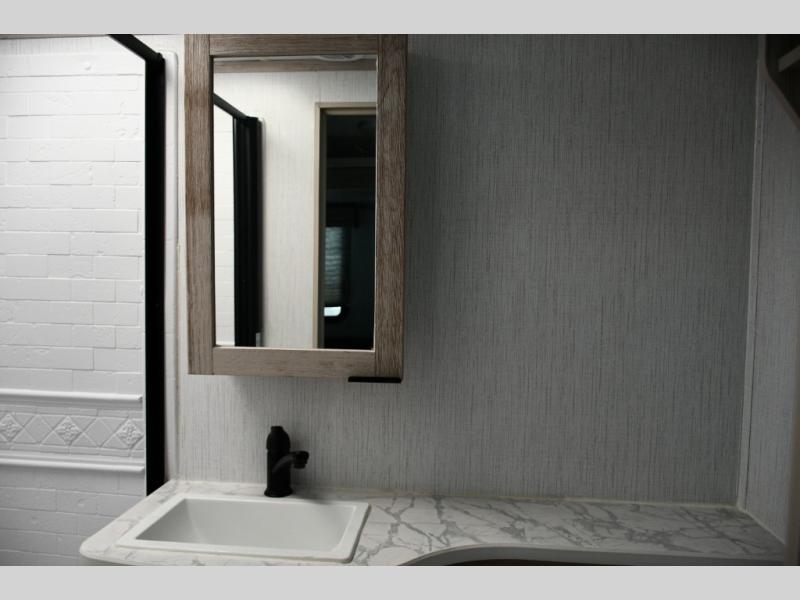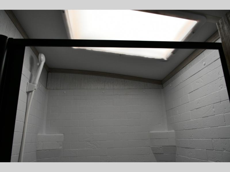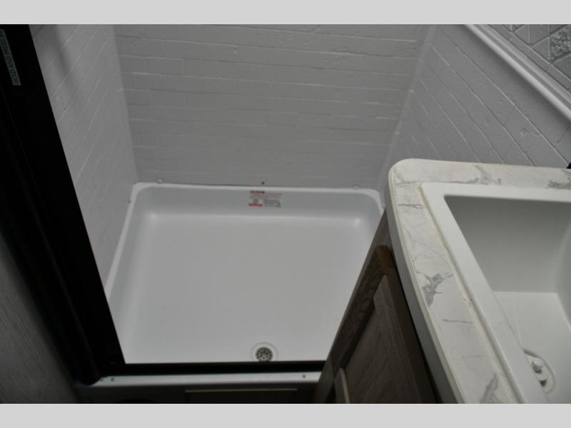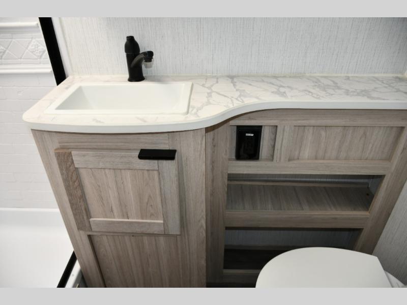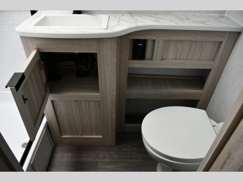 The rear corner bathroom offers a spacious layout that keeps the living and sleeping areas separate while providing all the essentials for comfortable camping.