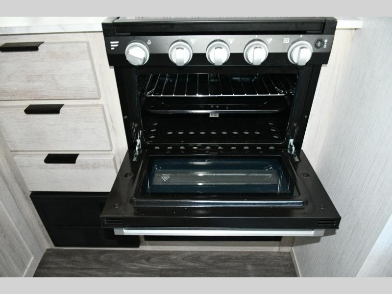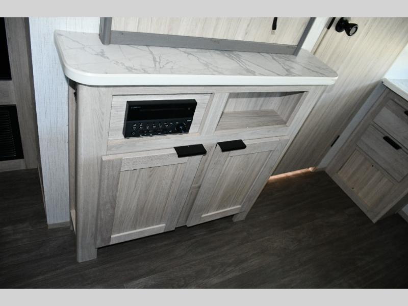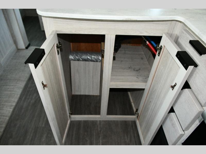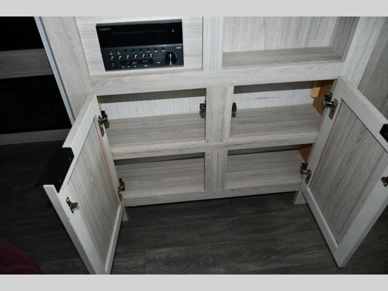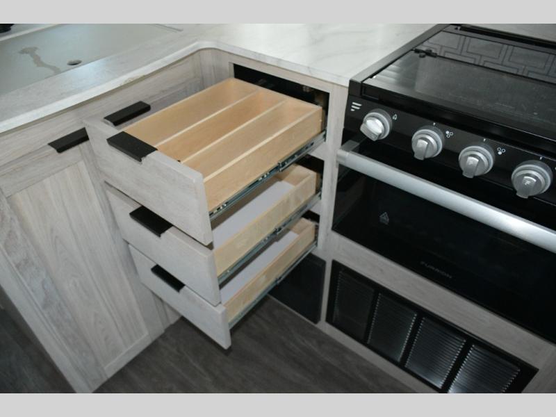 Up front, the king bed sliding system maximizes comfort and functionality. Beneath the bed, you’ll find: