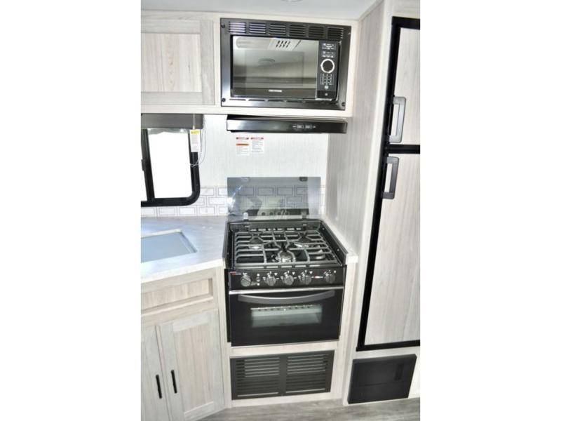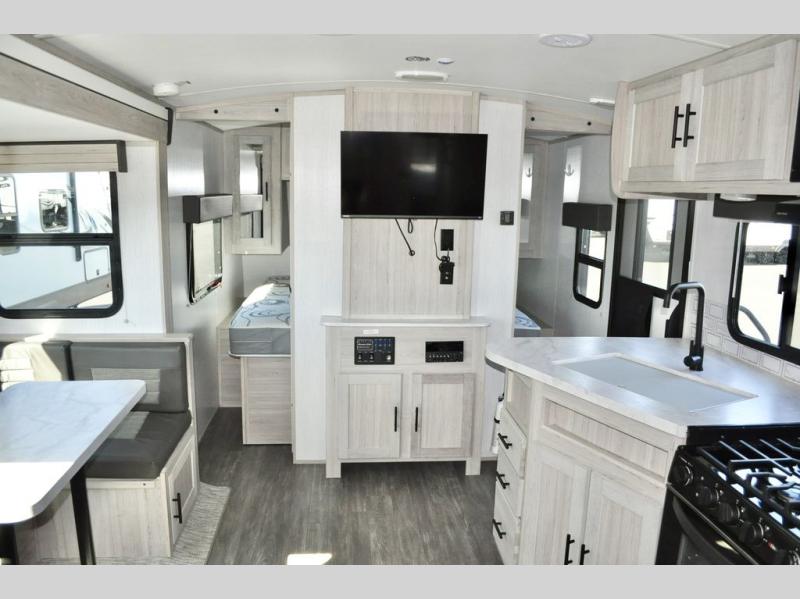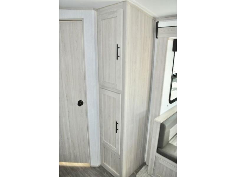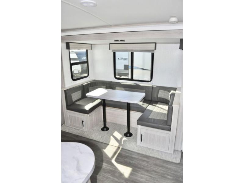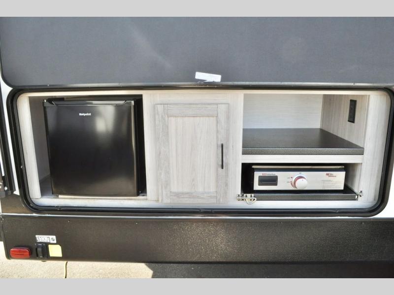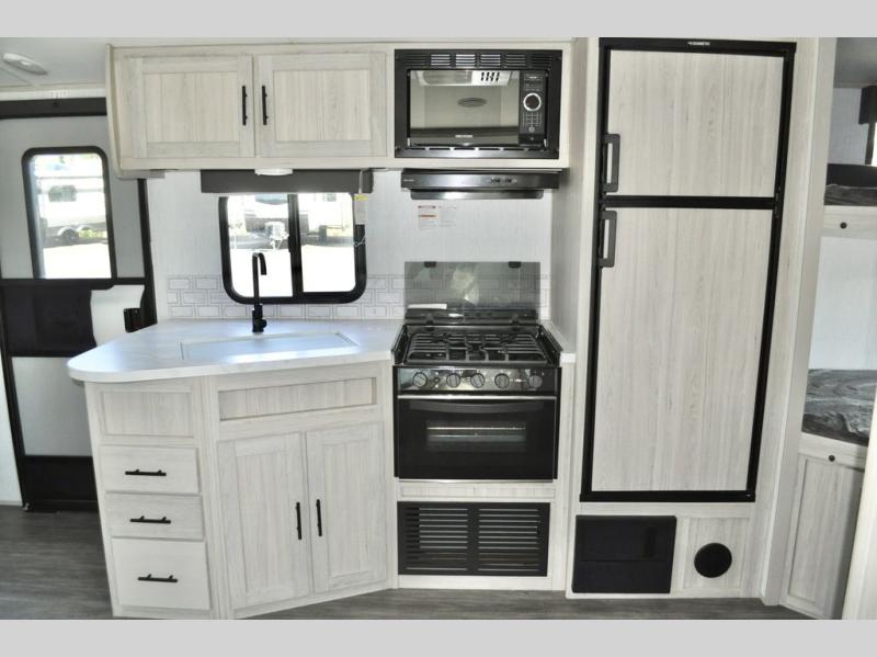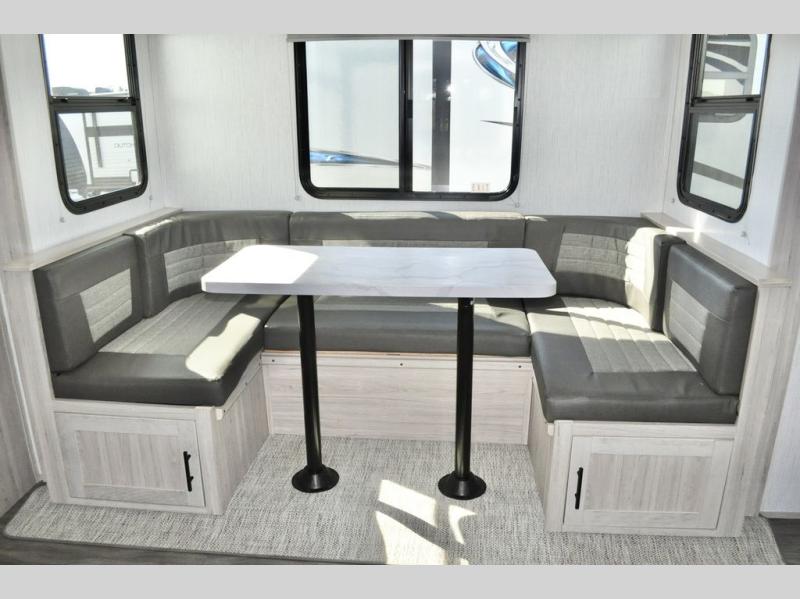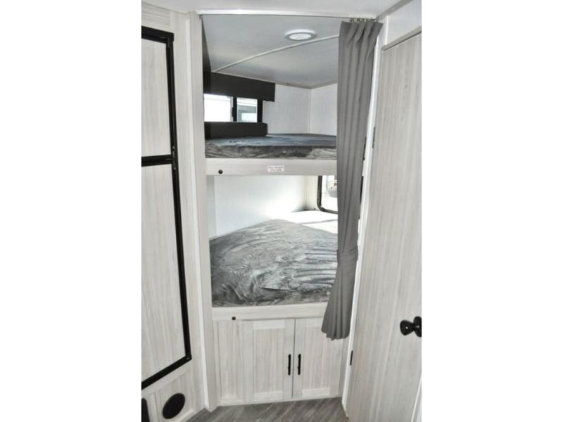 The whole gang can go camping in this travel trailer! The kiddos or guests can sleep on the set of bunk beds and you can sleep on the patent pending king bed sliding system, plus your furry friend can sleep in the pet palace underneath the bed and the U-shaped dinette can even transform into an extra sleeping space. Enjoy a sunrise breakfast cooking at the outside kitchen with a 20' electric awning to protect you. Everyone will stay clean and fresh with the full shower in the rear corner bathroom too!