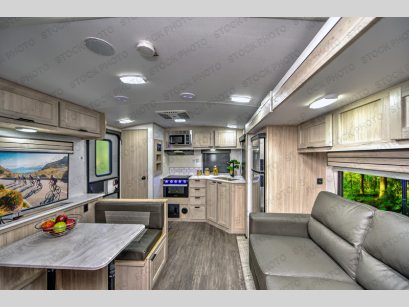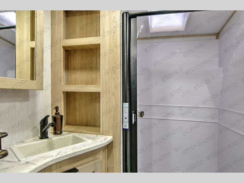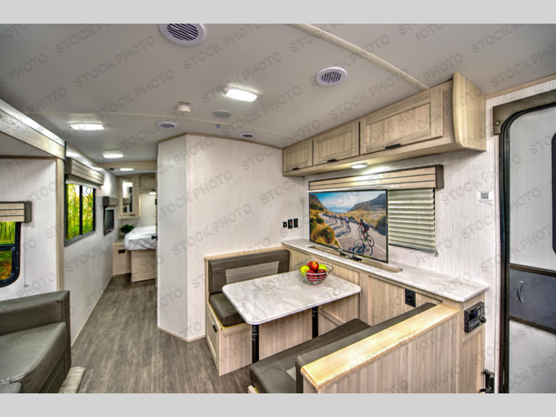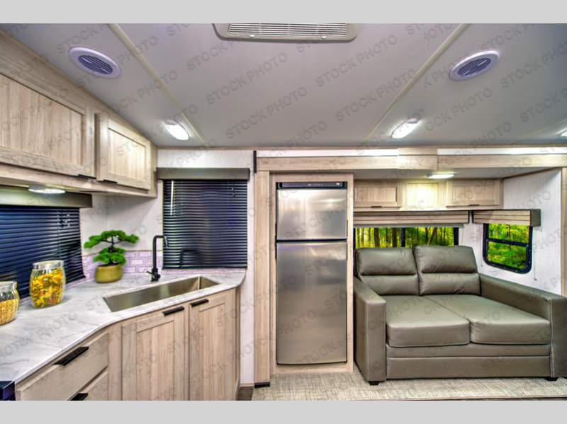 With dual entry doors, you will experience a smooth flow of traffic in and out of this travel trailer! One of the entrances even leads directly into the front private bedroom which has a patent pending king bed sliding system with a pet palace underneath, wardrobes on either side of it, and a wardrobe above a dresser to keep your clothes out of the way. The full bathroom has a full shower for you to freshen up in each morning and you can fry some bacon up on the three burner cooktop then enjoy it at the booth dinette. There is also a walk-in pantry big enough to store your favorite snacks and canned goods!