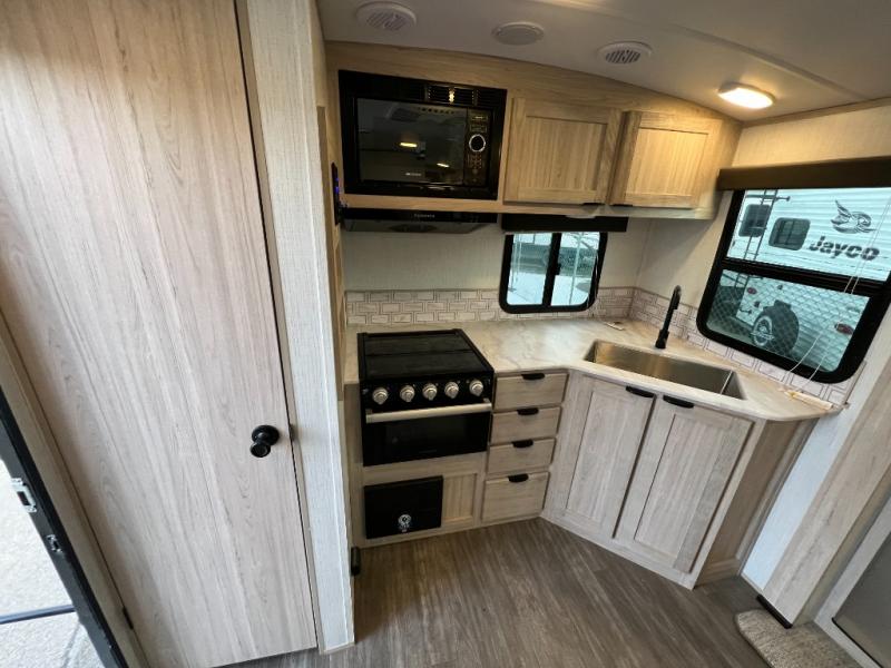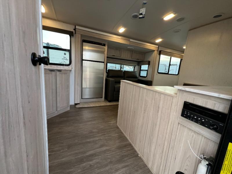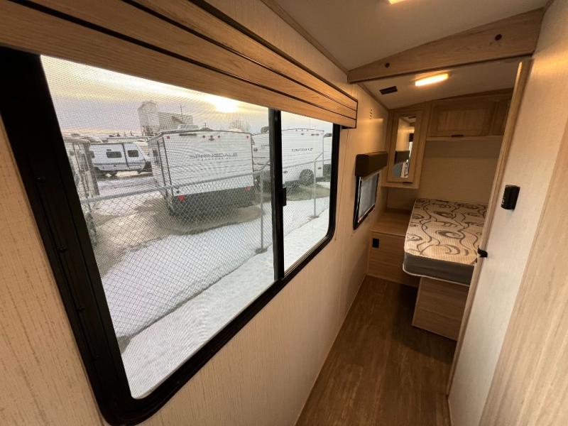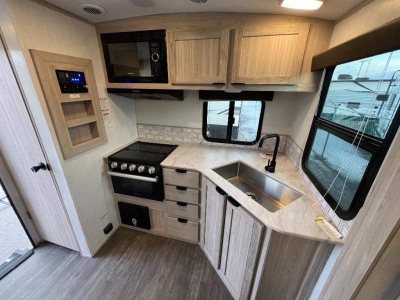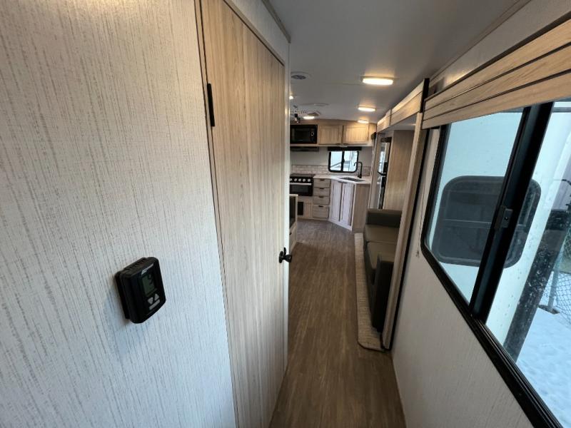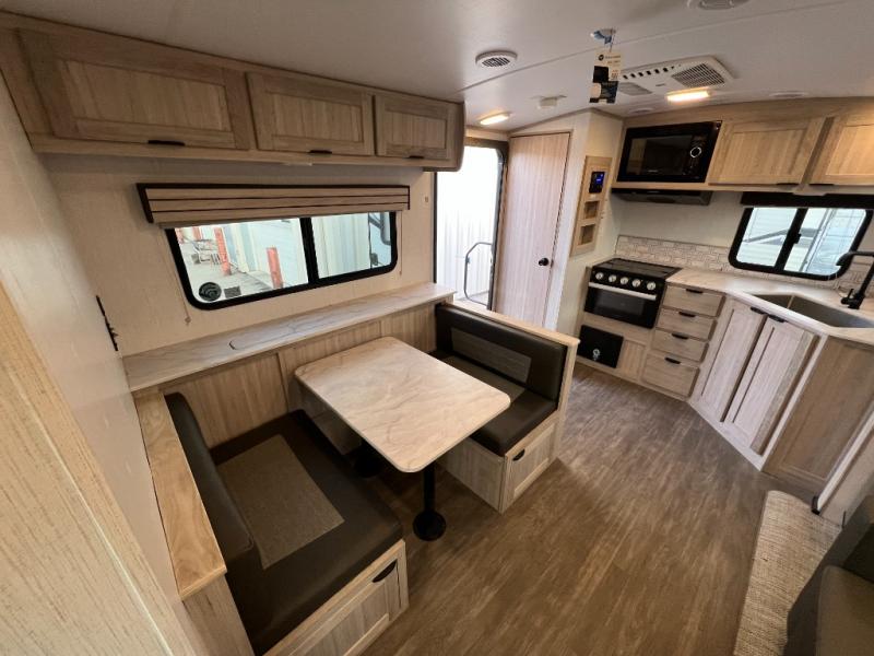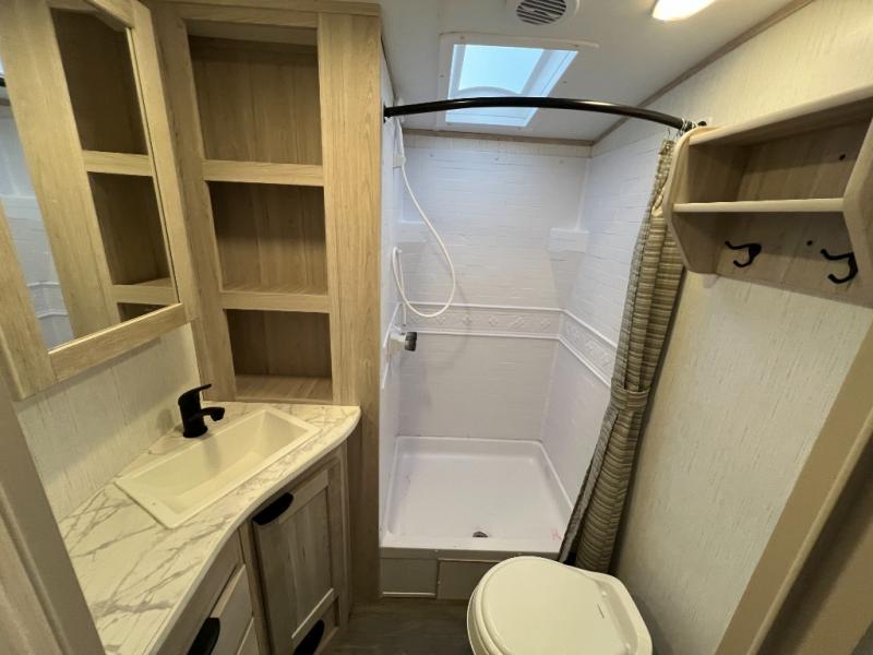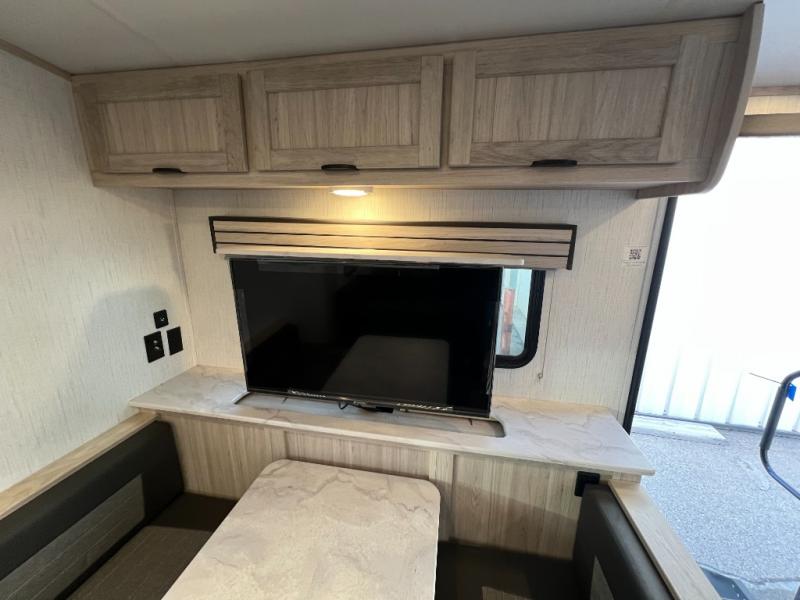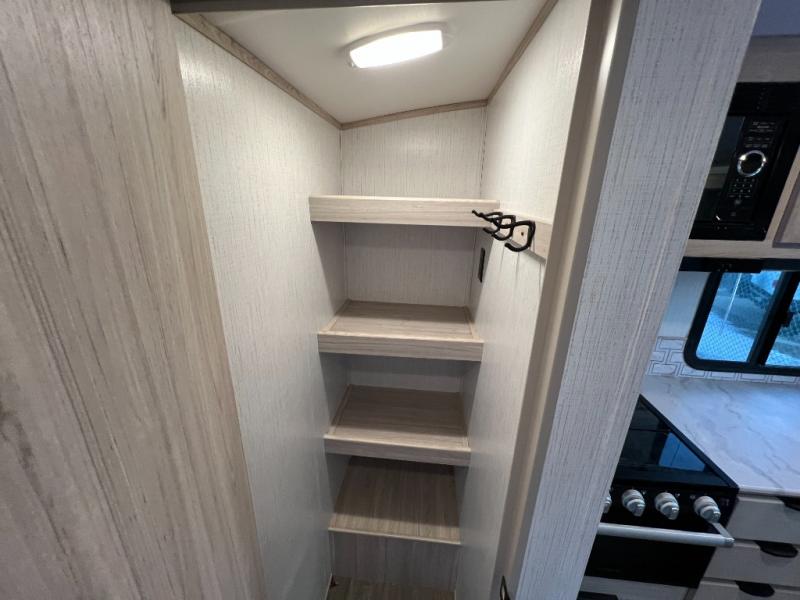 With dual entry doors, you will experience a smooth flow of traffic in and out of this travel trailer! One of the entrances even leads directly into the front private bedroom which has a patent pending king bed sliding system with a pet palace underneath, wardrobes on either side of it, and a wardrobe above a dresser to keep your clothes out of the way. The full bathroom has a full shower for you to freshen up in each morning and you can fry some bacon up on the three burner cooktop then enjoy it at the booth dinette. There is also a walk-in pantry big enough to store your favorite snacks and canned goods!