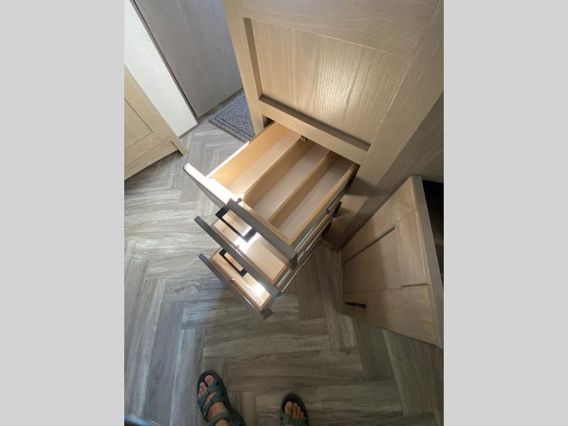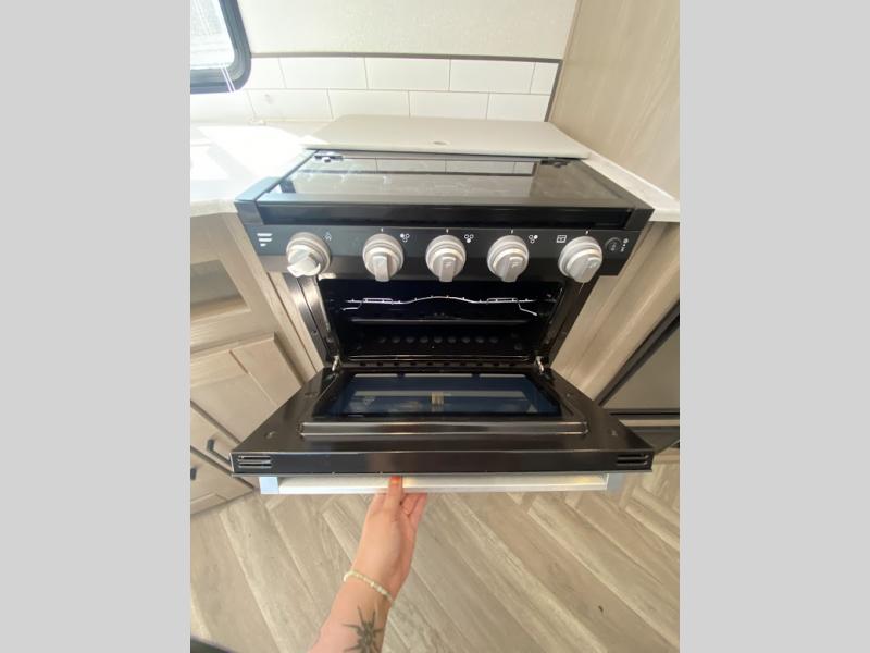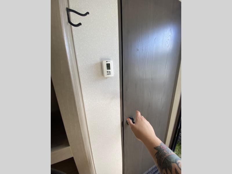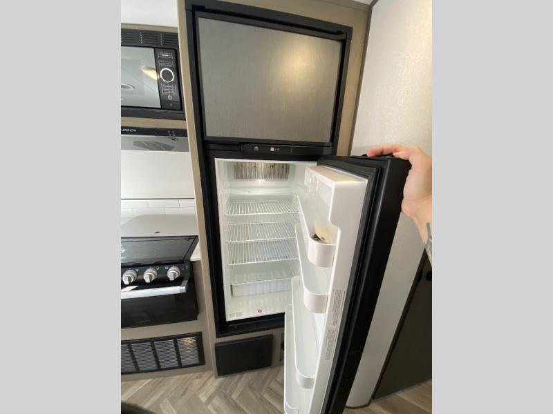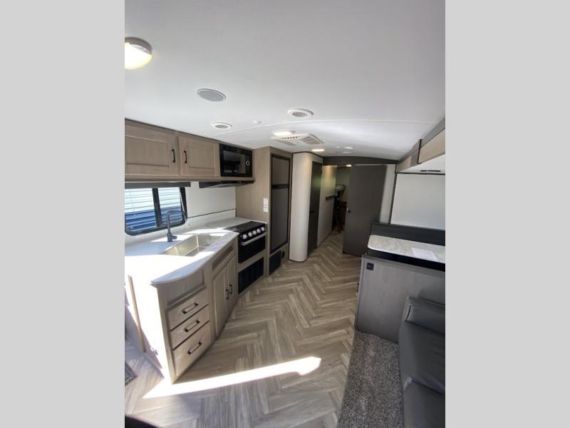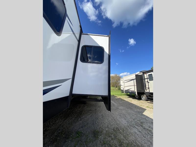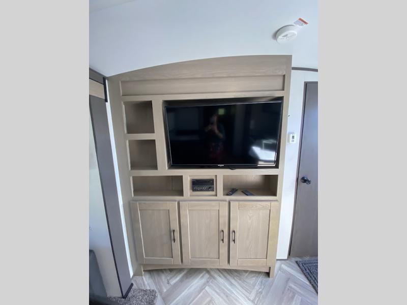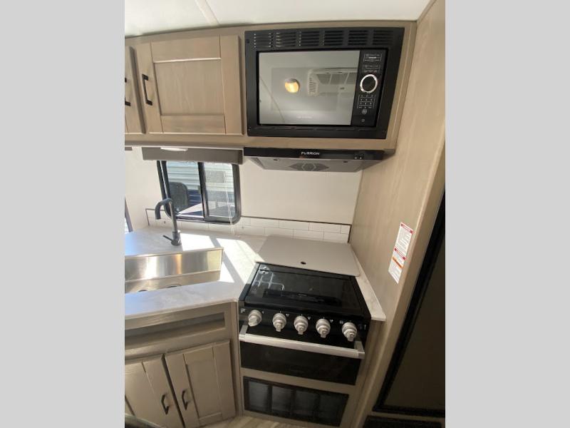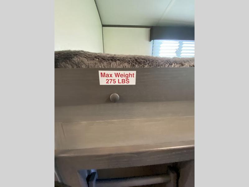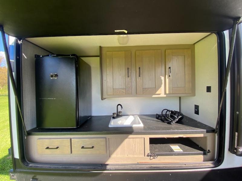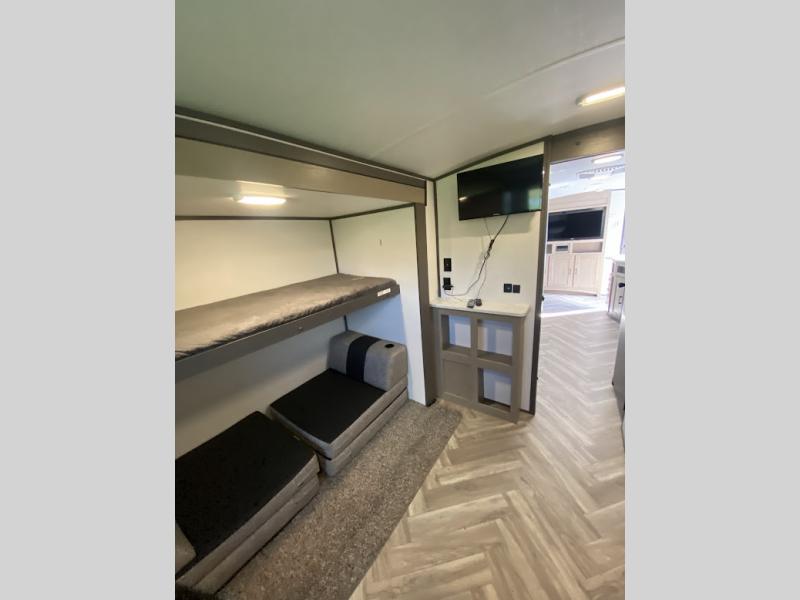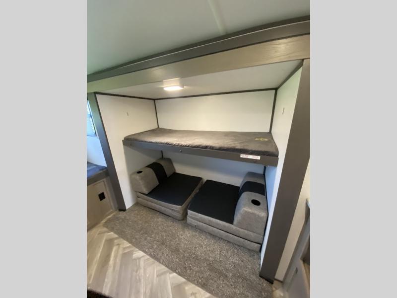 Dual entry doors are just one of the many conveniences you will love about this travel trailer! The rear private bunkhouse has a bunk above an entertainment center, another bunk bed, and a flip-up bunk above a folding futon. The front private bedroom offers a comfortable place for you and your furry friend to sleep with the patent pending king bed sliding system that has a pet palace underneath it. After a fun day at the beach, you can relax at the sofa and booth dinette slide while the chef prepares dinner with the three burner cooktop or everyone can head outdoors for the chef to cook at the outside kitchen. The full bathroom has a full shower to freshen up in and an entrance/exit door so you can get back to having fun fast!