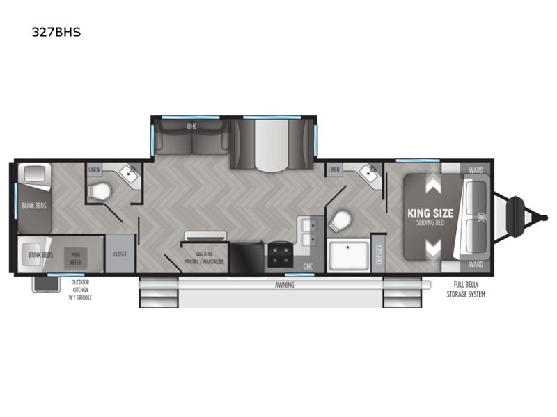 This travel trailer is decked out in convenience! From the bath and a half to the outside kitchen with a griddle and the exterior full belly storage system to store all your gear. The front private bedroom has a patent pending king bed slide system with a pet palace underneath it, wardrobes on either side of it, a dresser, an entrance/exit door to the unit, and an entrance into the walk-through bathroom. Grab some rice from the walk-in pantry/wardrobe and fry it up on the four burner cooktop then enjoy it at the booth dinette or even the sofa. The rear private bunkhouse has everything your kids or guests will need like the two sets of bunk beds, the large closet, and the half bathroom with a linen closet!