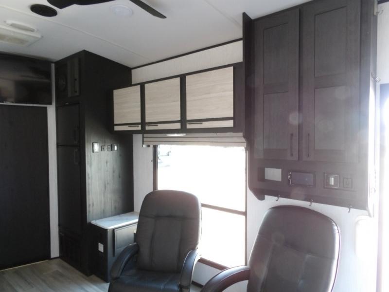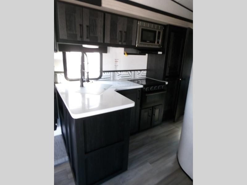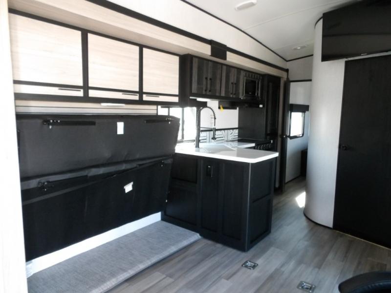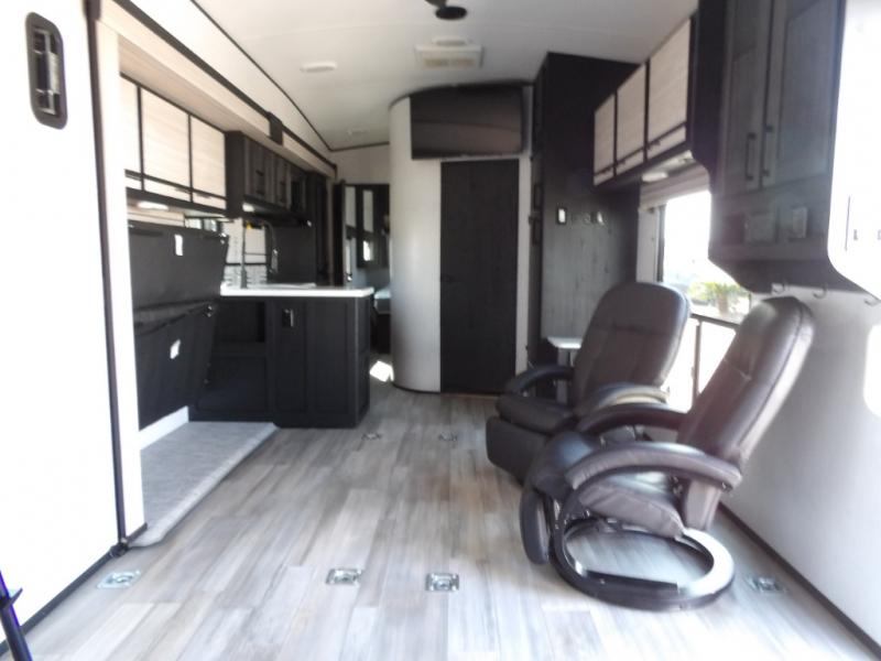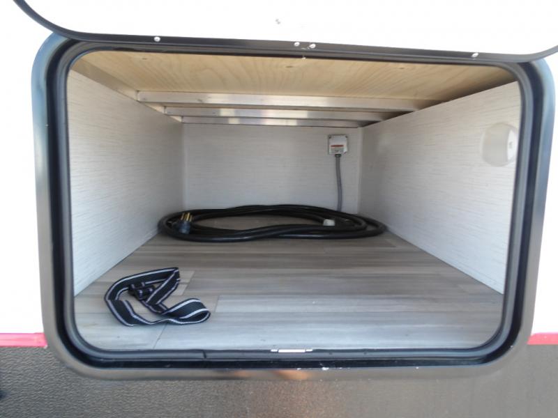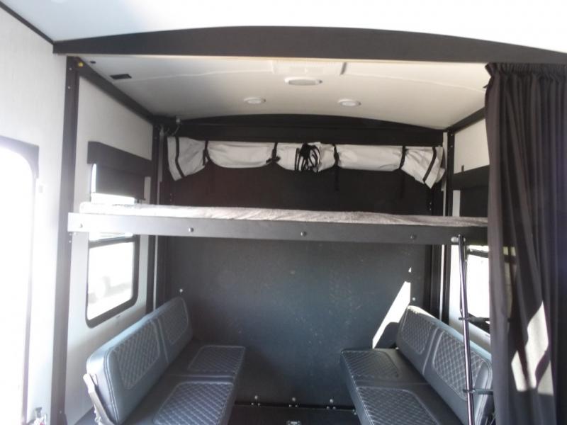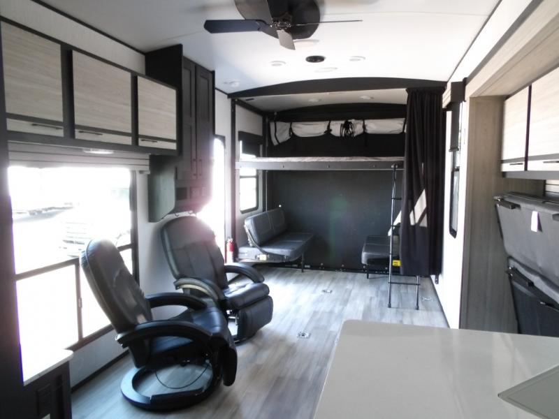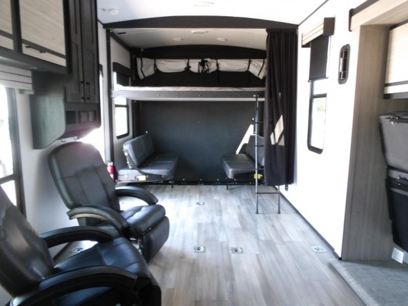 You can't go wrong with this dual entry toy hauler in tow! Once you arrive at the campground, fill up the bikes using the convenient 30 gallon fuel station, then head out on a trail or two! There is a dual entry bath on board that will allow you to clean up before heading to the kitchen to start dinner. You will love the large slide out that will provide more space when cooking, and there is a sofa with a table to dine at. You may just want to kick back on the dual lounge chairs before starting the dishes. Sleeping space can be found on the king bed in the front master, or on the opposing sofas and power queen bed in the garage!
