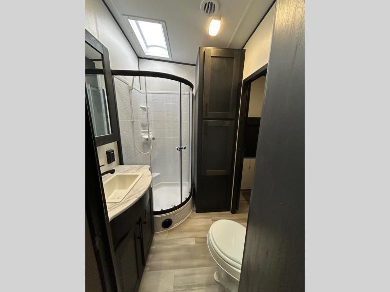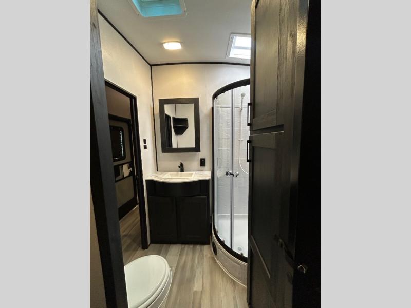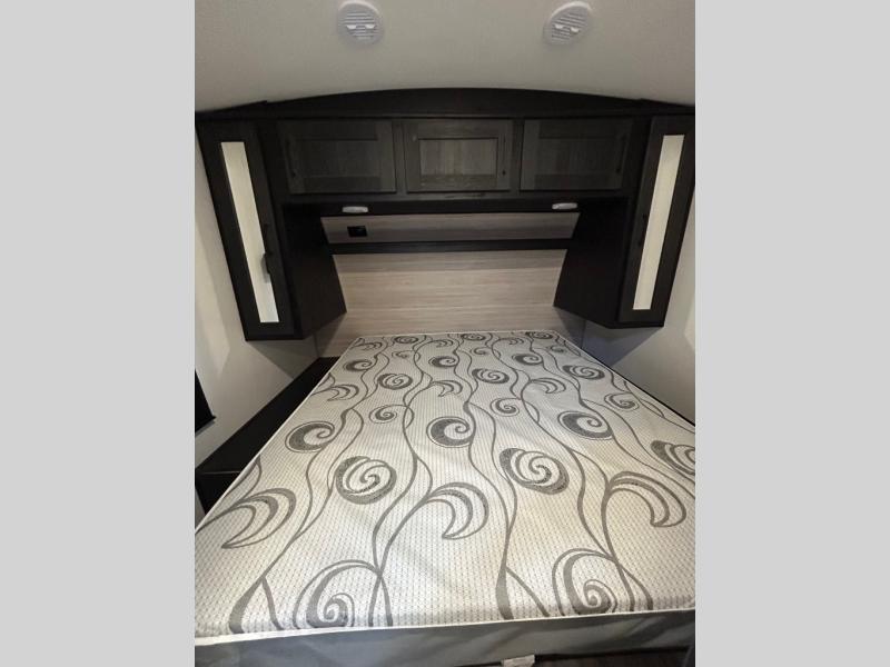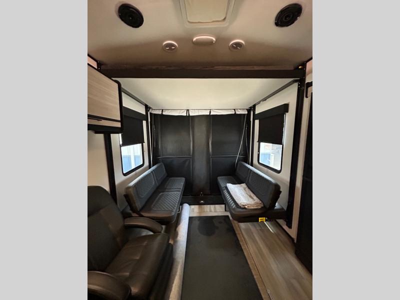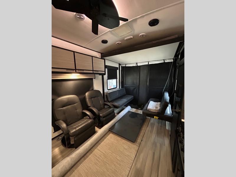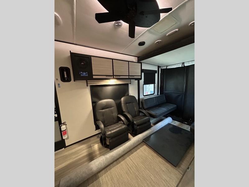 Just because you want to kick up some mud during the day, doesn't mean you can't enjoy at-home comforts in the evening. You can do just that and more in this toy hauler for six. After you've unloaded the side-by-side, fill it up with the 30 gallon fuel tank, then head out on an adventure. It will be so easy to clean up in the dual entry bath when you return, and the chef of your group can start lunch on the three burner cooktop. Everyone can dine at the opposing sofas with a dinette, or head outdoors to sit under the 19' power awning with LED lights. There are even two lounge chairs indoors if you want to enjoy a cup of coffee to relax. You'll find the king bed slide system in the front master will give you plenty of space on either side of the bed to get dressed for bed, plus there are dual bedroom wardrobes to keep your clothes tidy!