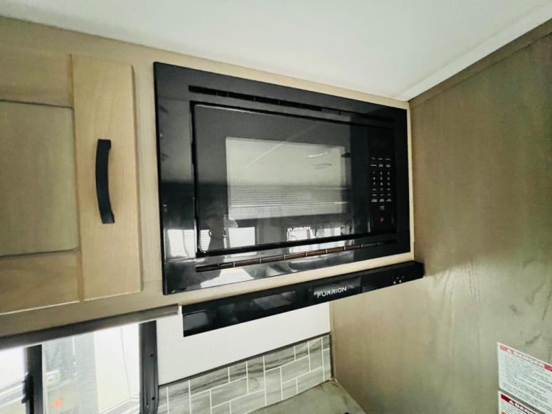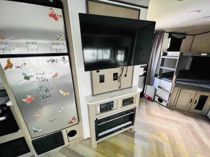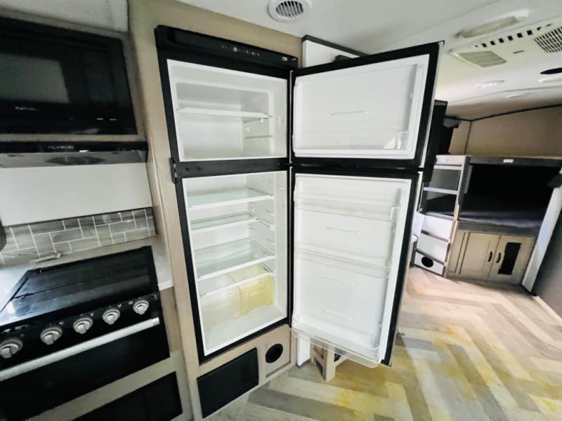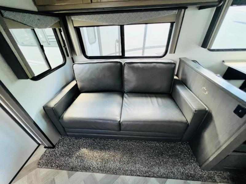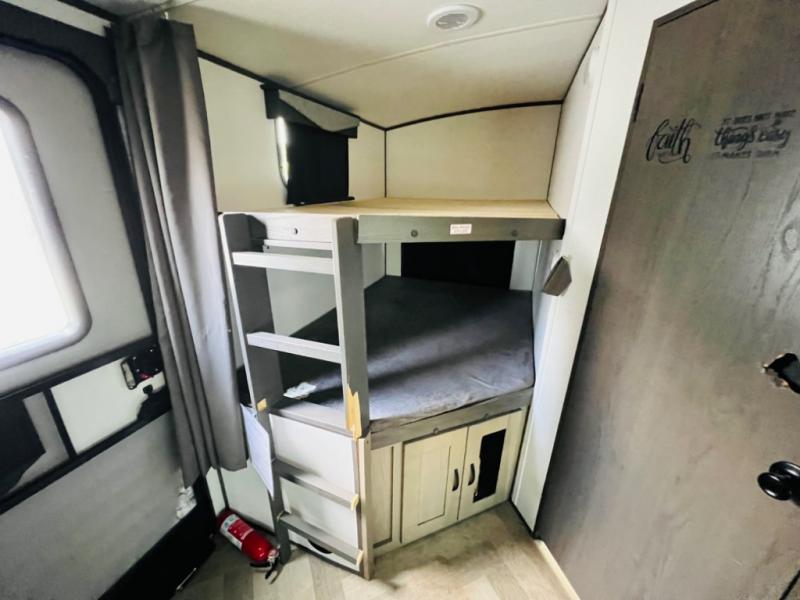 The kiddos will love having a set of double bunk beds to sleep on at night in this travel trailer! They can even invite a friend or two to tag along and sleep on the residential tri-fold sofa or dream dinette once they are converted. The dinette also has hidden seat storage for your needs, plus there is a walk-in pantry big enough to store everyone's favorite snacks. The chef can prepare their best meals either indoors with the three burner cooktop or head to the outdoor kitchen and fry the catch of the day on the two burner cooktop while staying protected by the 20' power awning with LED lights. Enjoy a good night's rest each night on the king bed with a Serta Comfort mattress in the front private bedroom!