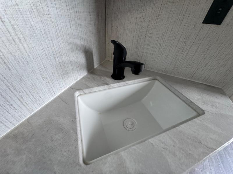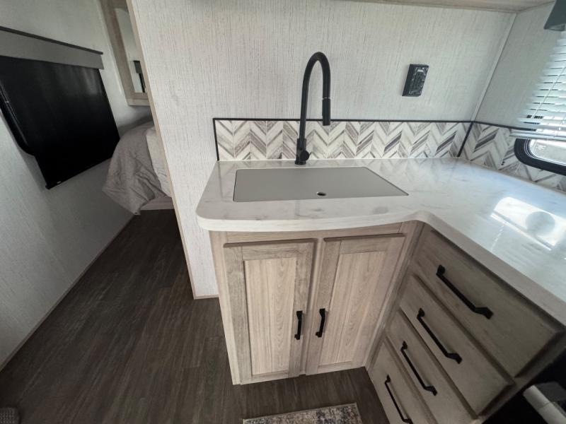 The kiddos will love having a set of double bunk beds to sleep on at night in this travel trailer! They can even invite a friend or two to tag along and sleep on the residential tri-fold sofa or dream dinette once they are converted. The dinette also has hidden seat storage for your needs, plus there is a walk-in pantry big enough to store everyone's favorite snacks. The chef can prepare their best meals either indoors with the three burner cooktop or head to the outdoor kitchen and fry the catch of the day on the two burner cooktop while staying protected by the 20' power awning with LED lights. Enjoy a good night's rest each night on the king bed with a Serta Comfort mattress in the front private bedroom!