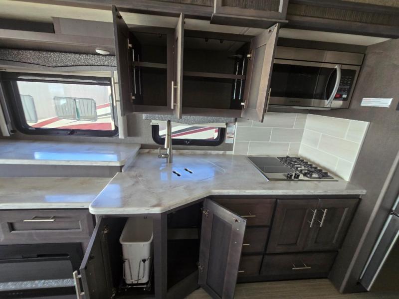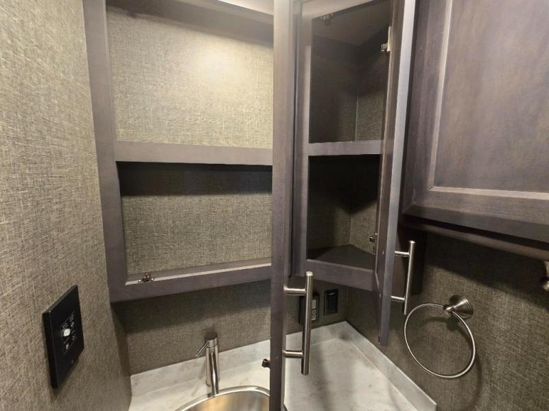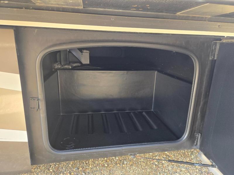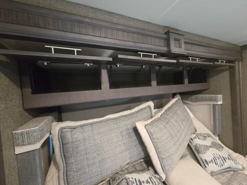 This motorhome features a full-wall slide, plus two additional slides for maximum space and comfort. You can sleep seven people thanks to the drop-down overhead bunk, the king bed slide out, and the furniture in the main living area. The fireplace and retractable 49" TV will make it feel a little more like home, and the residential kitchen is any chef's dream. Since this model includes a bath and a half, your guests won't have to wait in line, and you'll find plenty of storage space throughout for everyone's belongings.