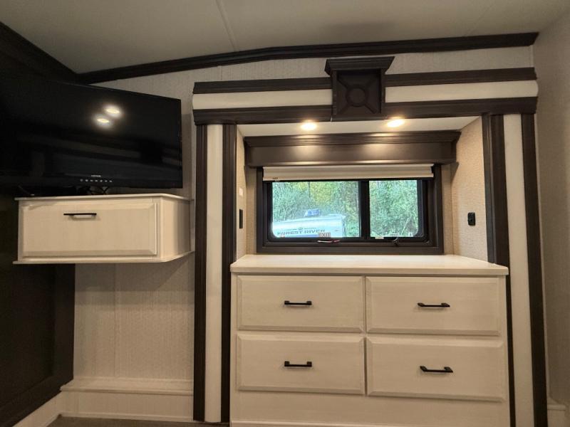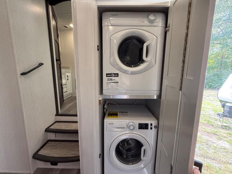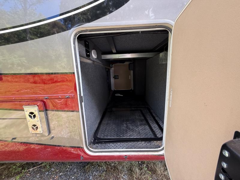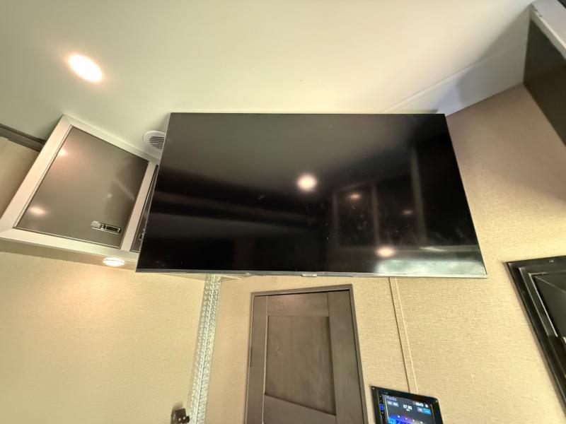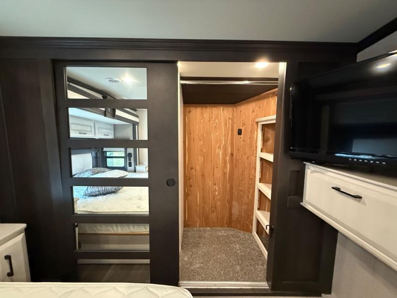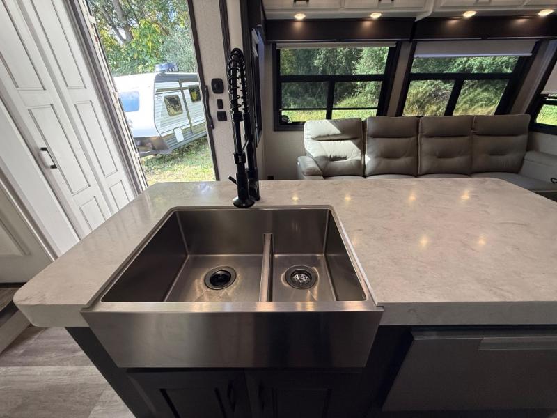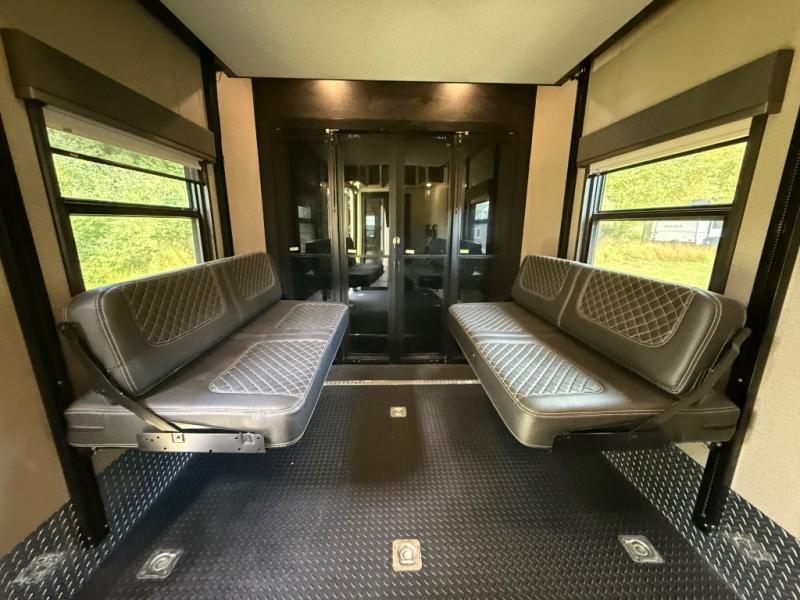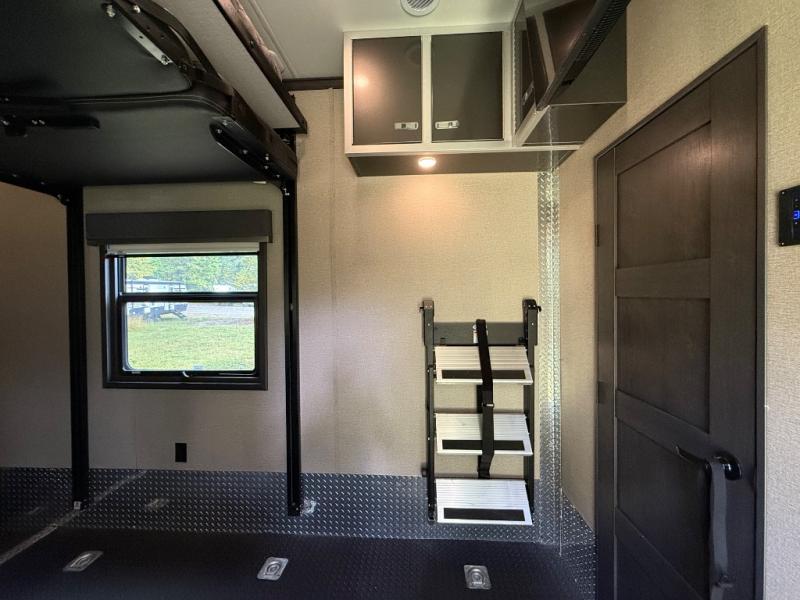 One of the best things about this Full House fifth wheel toy hauler is the fact that it comes with both a full and half bathroom! You'll also find extra convenience in the kitchen with the island that delivers some extra space for meal prep, and additionally, the opposing slides will provide more interior living space in this area as well. Throughout this entire unit, you will find three LED TVs which means that it will be super easy to stay entertained even if the weather outside isn't cooperating, and there is superb storage with the walk-in closet and vanity slide in the front bedroom.