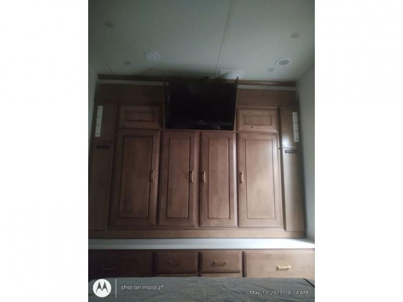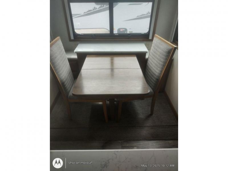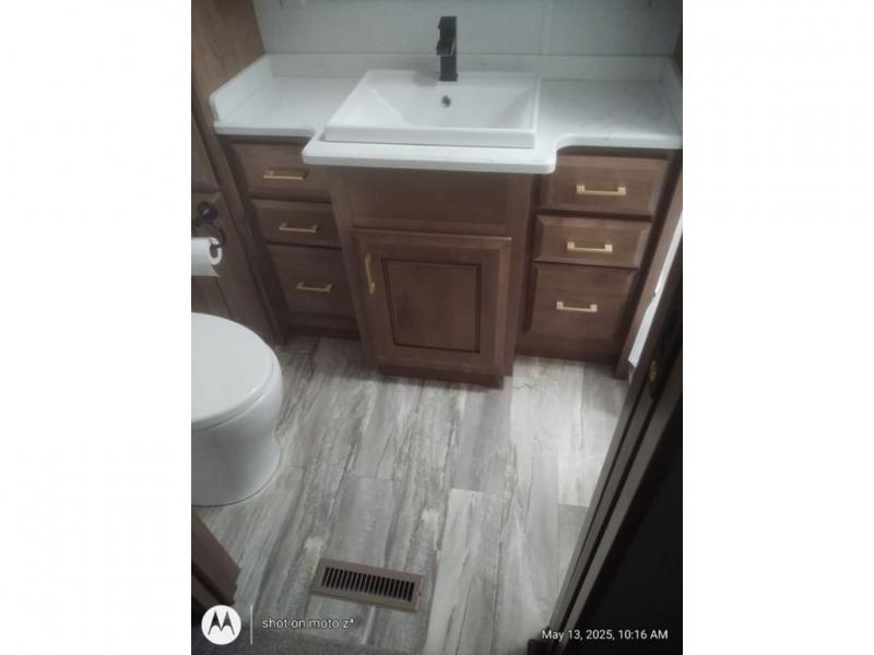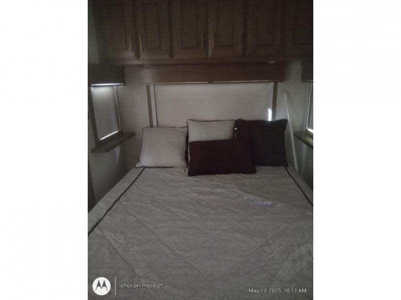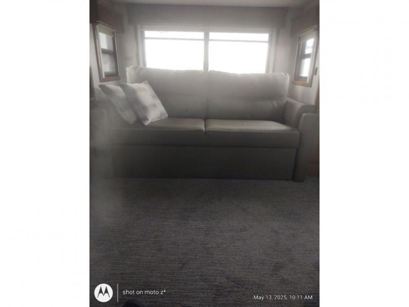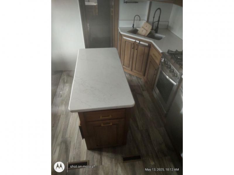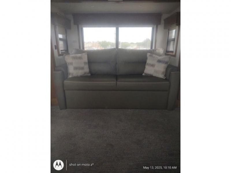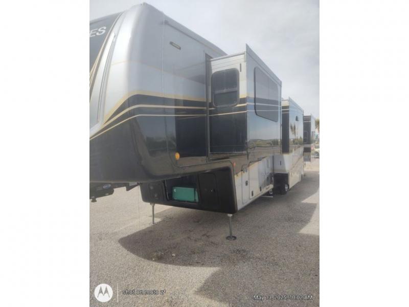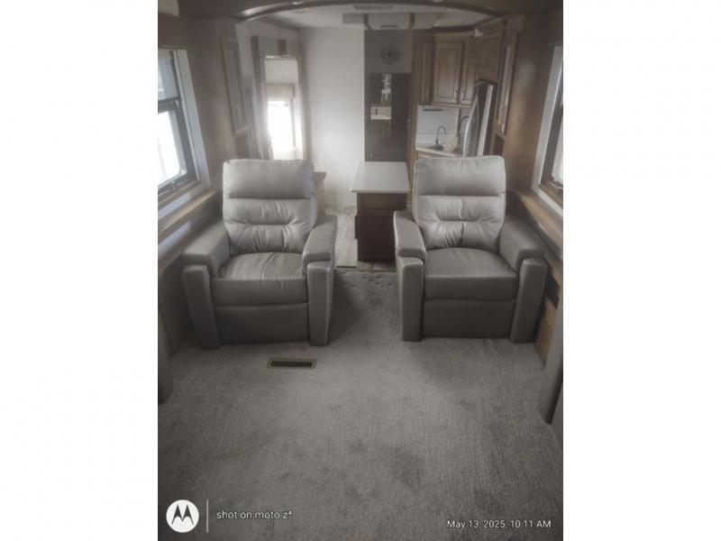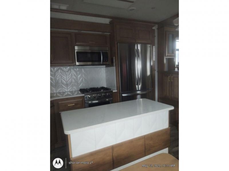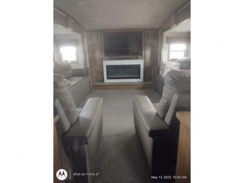 As you decide to live in this fifth wheel, you will find a place for all your things, plus some! The front living area includes a cozy fireplace, and the dual slide outs with residential sofas with hide-a-beds will allow your guests to stay the night in their own space. The centrally located kitchen gives the cook lots of space with the two slide outs and the kitchen island offers more high gloss solid surface countertop to prepare and serve meals using the stainless steel appliances. This model also includes a handy half bath as well as a master suite with a king bed and rear full bathroom with lots of counter space and a fiberglass shower.