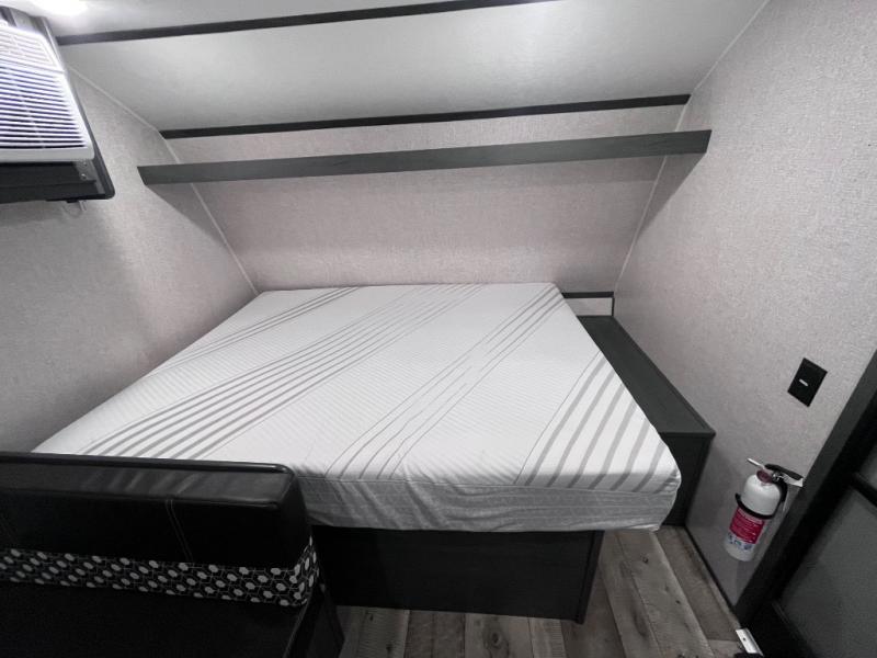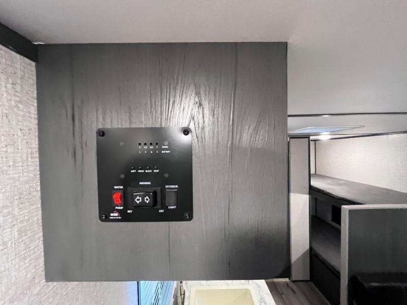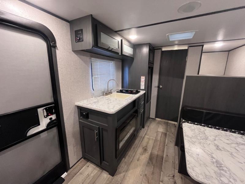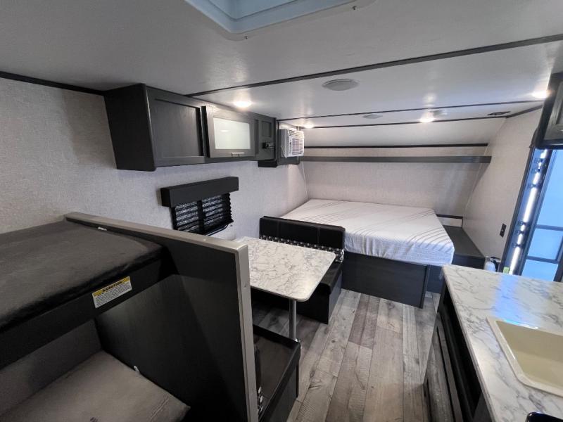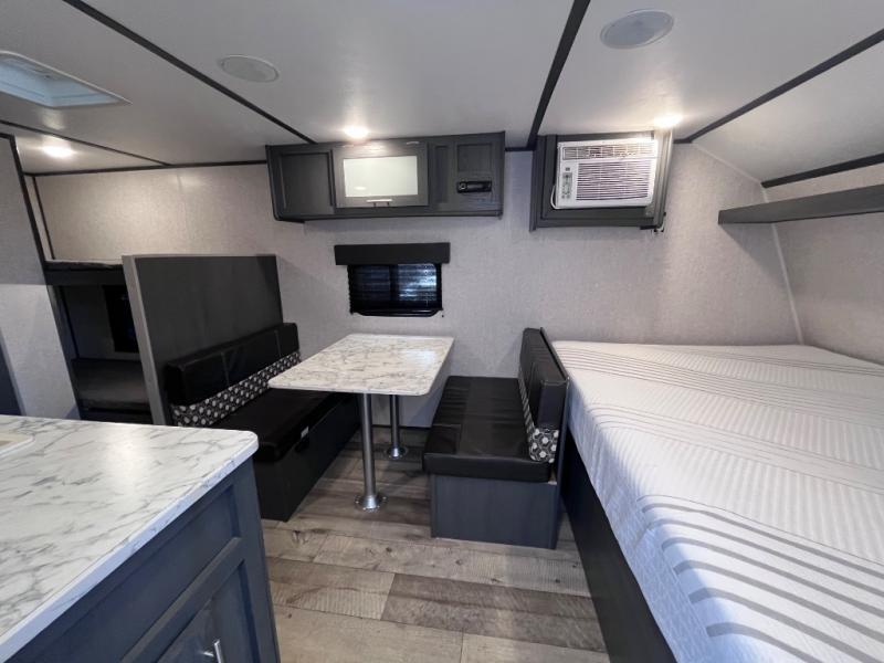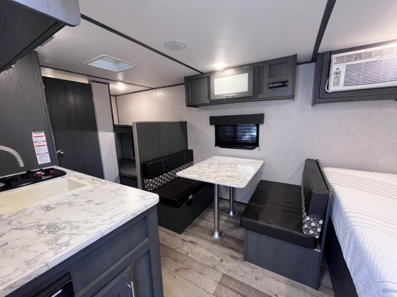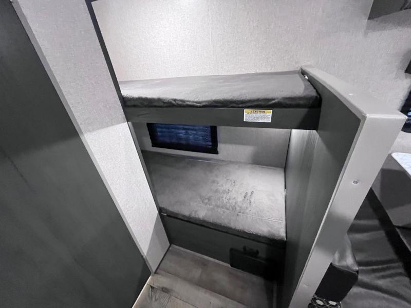 Step inside this travel trailer and see just how fun your next camping trip can be! The kids will love the set of rear corner bunk beds and you will love the front queen-size bed, plus the booth dinette can transform into an extra sleeping space when not in use. You can rinse the sand off in the rear corner bathroom, grab a cold drink from the 3.3 cu. ft. refrigerator, and then head outside and relax underneath the 10' power awning with LED lights!