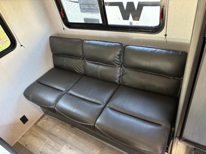 Pack up your camping gear and load it into this Aspen Trail travel trailer to enjoy a fun weekend getaway! You will enjoy a good night's rest each night on the front queen-size bed with wardrobes on either side to keep your clothes neat and tidy. After an adventurous day at the beach, you can come back and clean up in the full bathroom with a skylight above the shower for added natural lighting. Once you're clean and fresh, you can grab your favorite snack from the kitchen pantry or pop a bag of popcorn into the stainless steel microwave and then relax on either the booth dinette or sofa, both of which can transform into extra sleeping spaces!