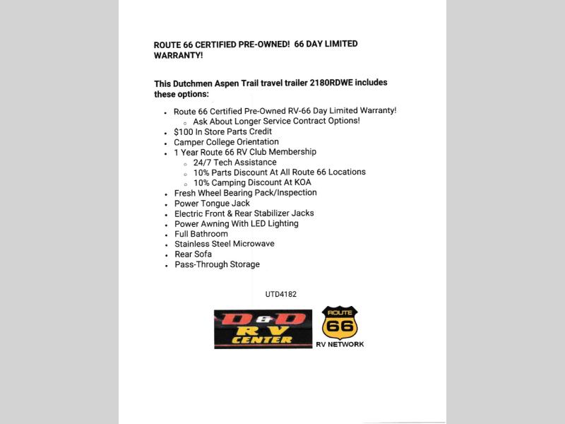 - Route 66 Certified Pre-Owned RV-66 Day Limited Warranty!