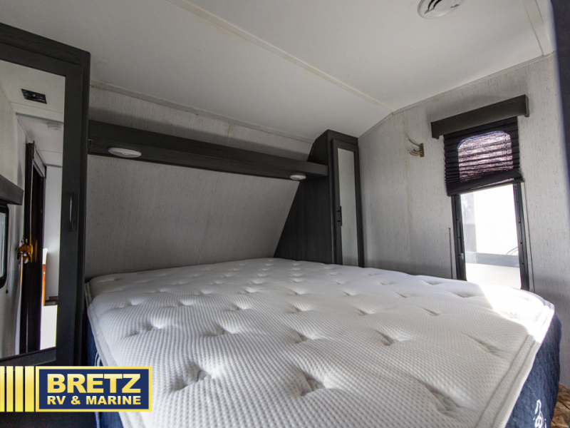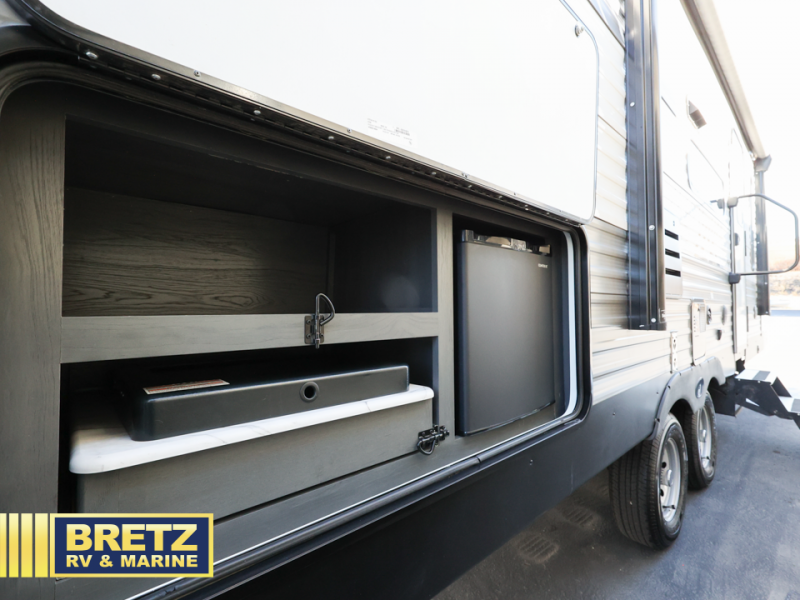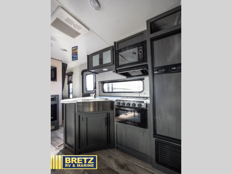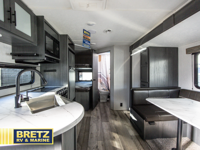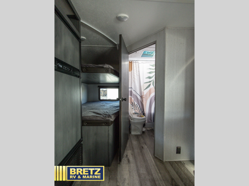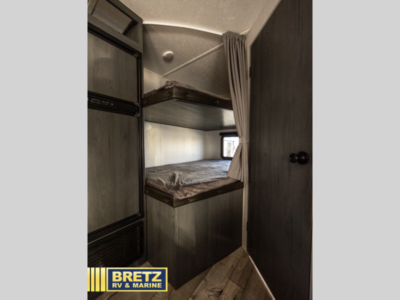 Bring the whole family and start camping in this Aspen Trail travel trailer today! There is a rear set of double-size bunks that your kiddos are sure to love, and you will love how convenient it will be for your kids to access the full bathroom because it is located right next to the bunks. The three-burner range with oven and the seamless Thermofoil countertops are ready whenever you are to whip up your best meals. The single slide creates more walking space by moving the U-shaped dinette and pantry out of the way of the main living space. The front private bedroom features a queen-size bed for you to rest up each night and be ready for your next adventurous day!