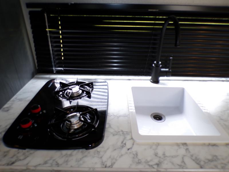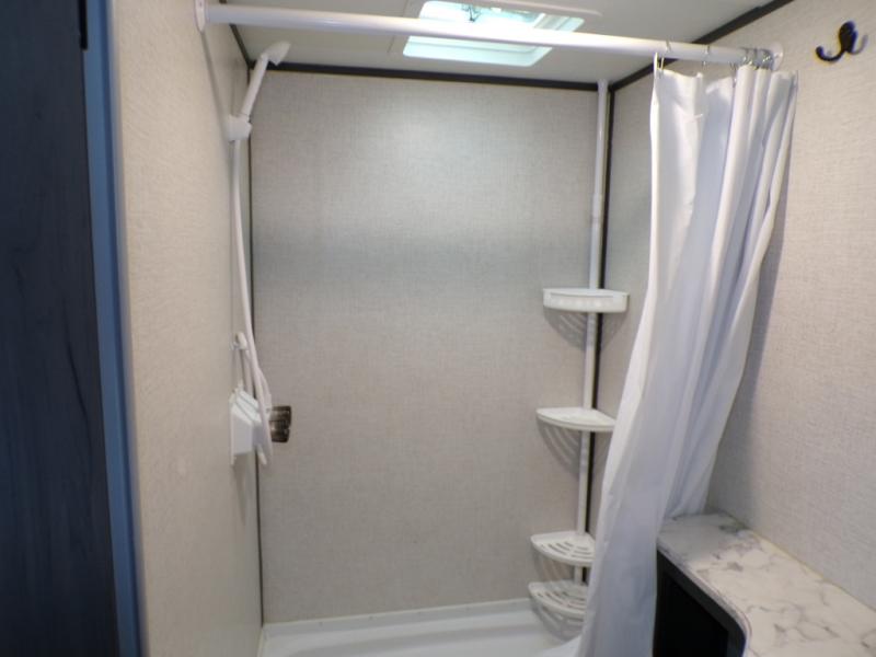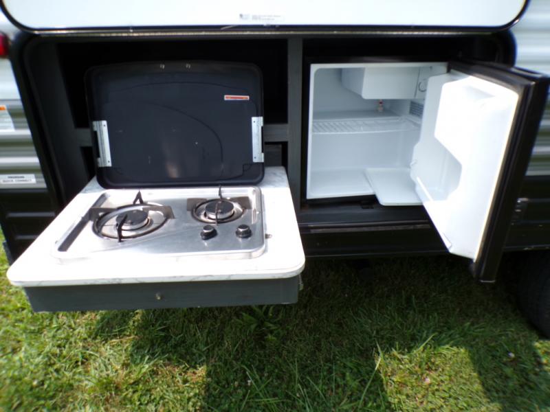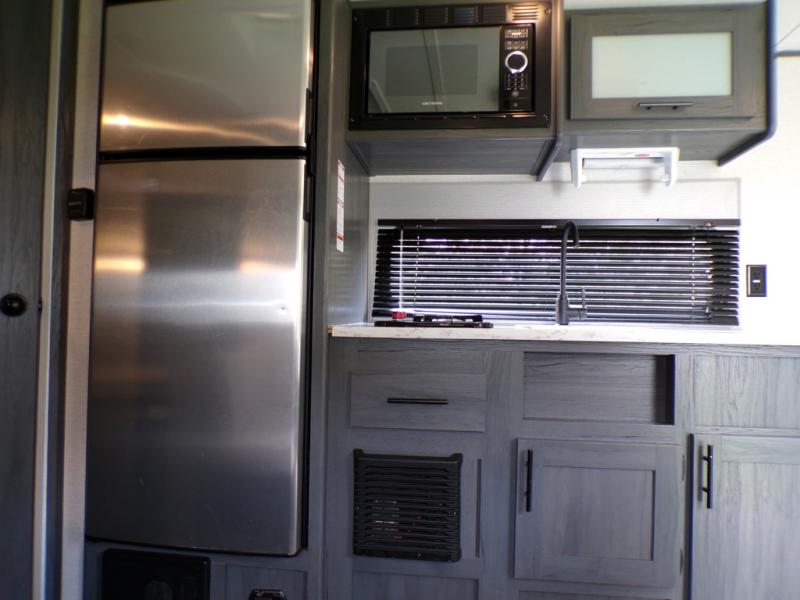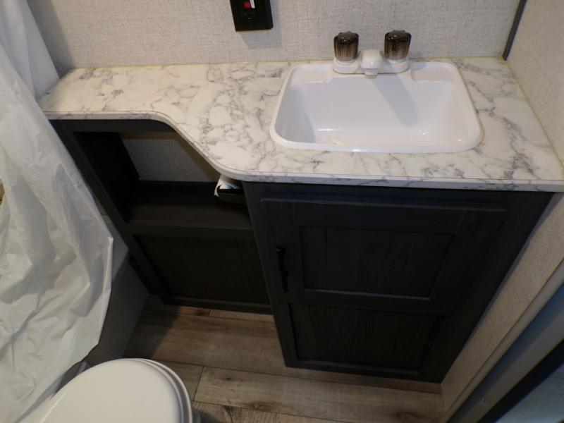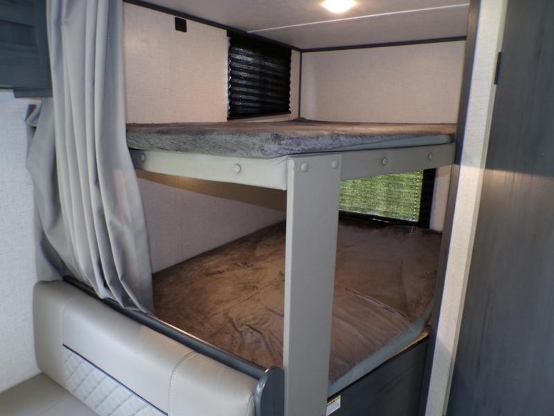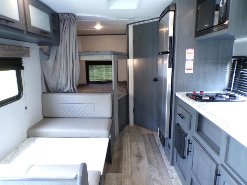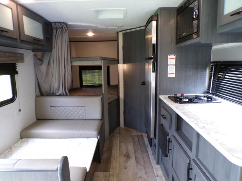 An inside kitchen, an outside kitchen, a full bathroom and sleeping space for five to seven sound like the perfect RV for you? This trailer offers all that with bunk beds, a Murphy bed and the booth dinette, plus you will have storage in the wardrobe, the overhead cabinets and along the exterior for the larger outdoor items. And the galley kitchen sink with high rise faucet makes cleanup easy.