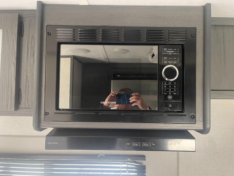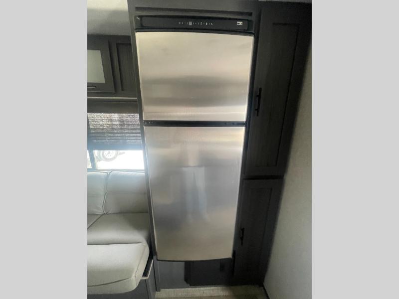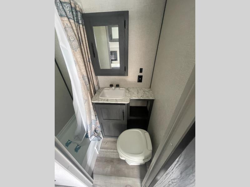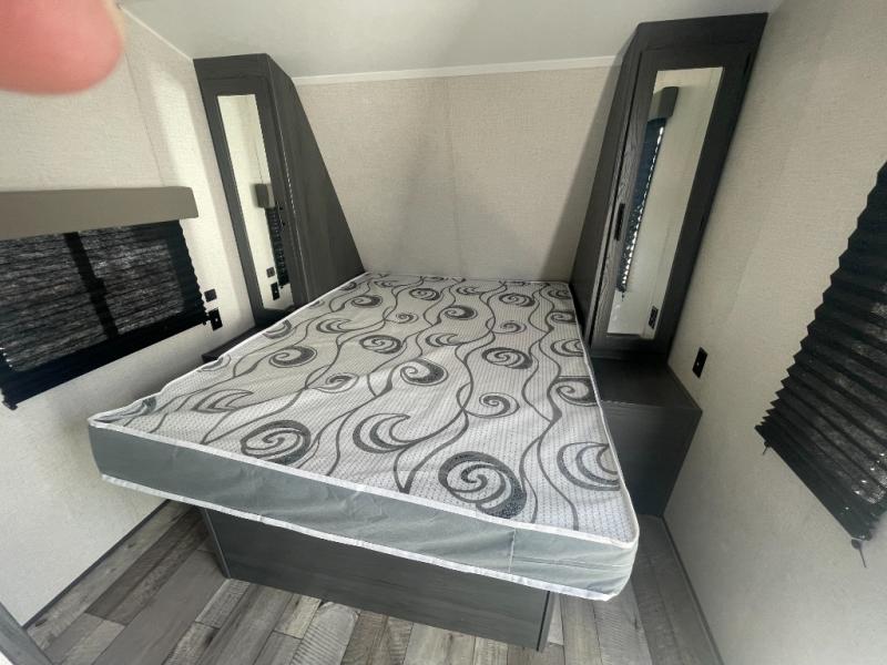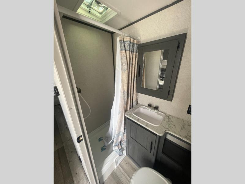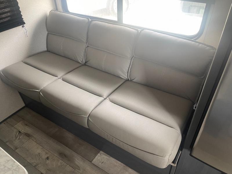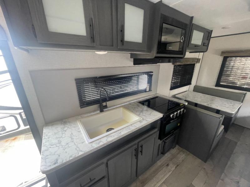 Whatever reason you camp, this lightweight trailer allows you to easily tow to your campsite, and enjoy comforts of home such as your own residential queen bed, wardrobe storage, a full bathroom with a shower, and furniture to relax and dine at. The sofa and booth dinette are across from each other, allowing you to visit with other RVers or your family. The cook will have a two burner range top and microwave to make meals, and a 7 cu. ft. refrigerator for cold items, plus a galley sink with high rise faucet to keep the dishes clean.