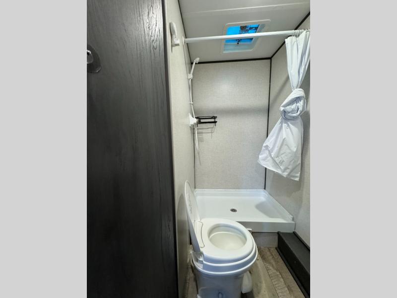 * Rear: double bunks on one side, corner bathroom on the other (toilet, tub/shower, small vanity)