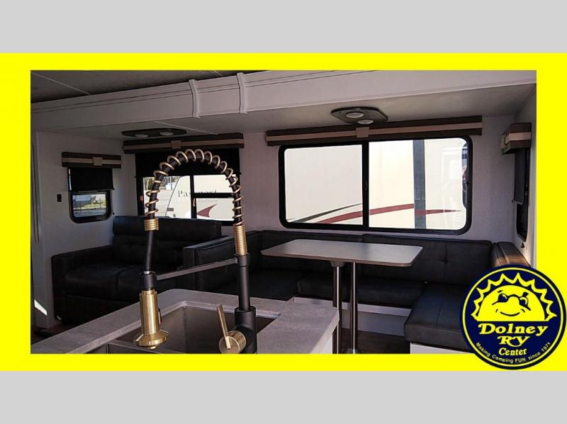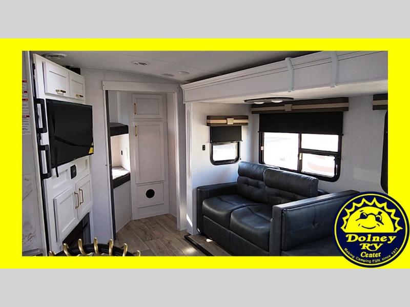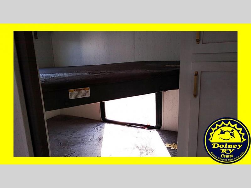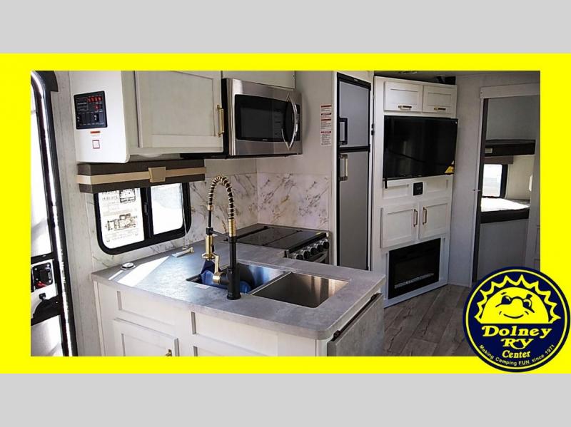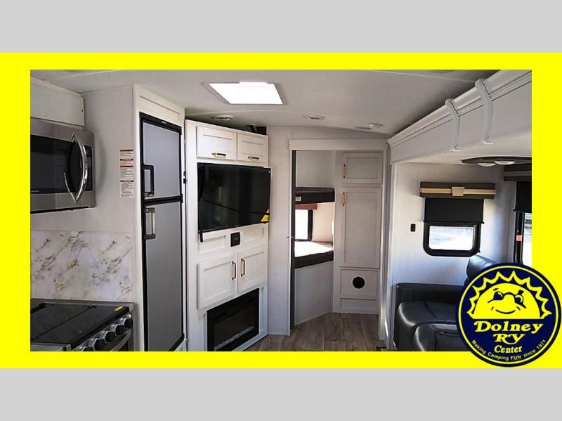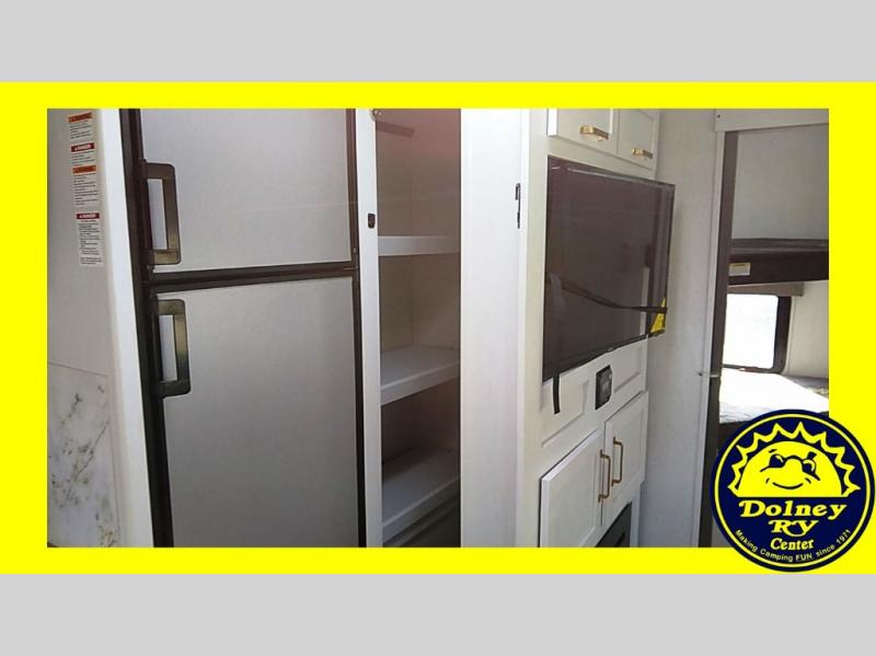 The family will love camping in this travel trailer! The kids can sleep in the rear private bunkhouse with the double-size bunk beds and store their clothes in the wardrobe. They can even bring a friend or two to sleep on the tri-fold sofa and U-shaped dinette slide once they are converted. You will enjoy your own privacy with the front bedroom which has a king bed with wardrobes/nightstands on either side and an entrance into the walk-through bathroom. You will easily be able to prepare your best meals in the kitchen with the countertop extension, the 8 cu. ft. double door refrigerator, and the glass top three burner cooktop with a 17" oven, plus there is a pantry behind the hinged entertainment center which has a 40" LED TV to watch your favorite movies!