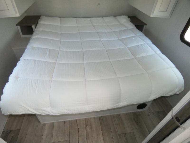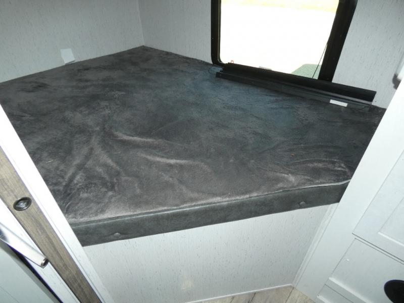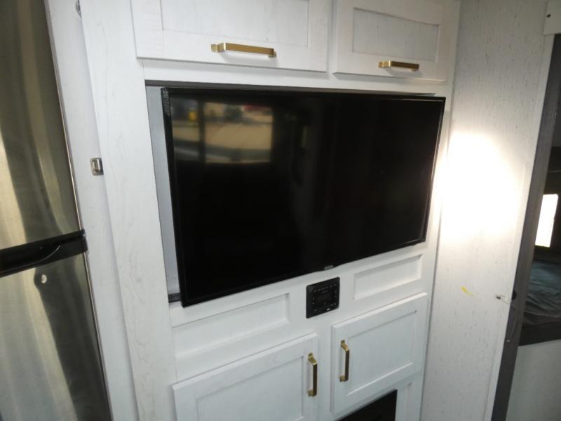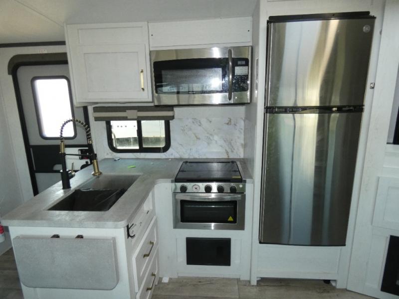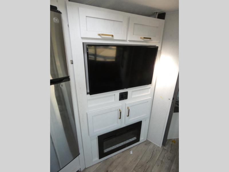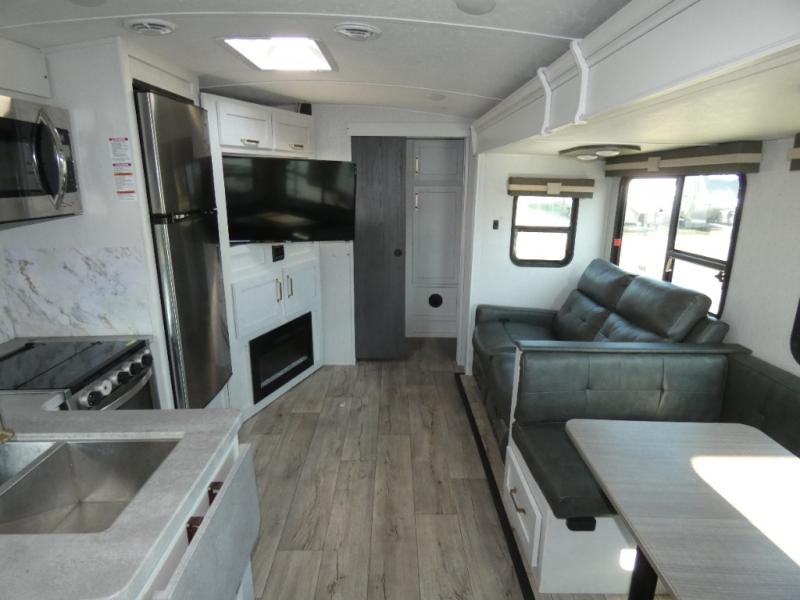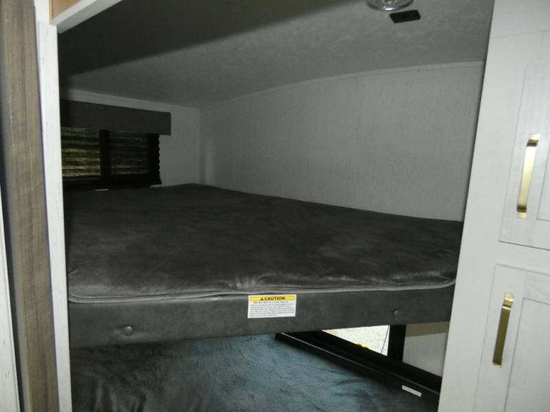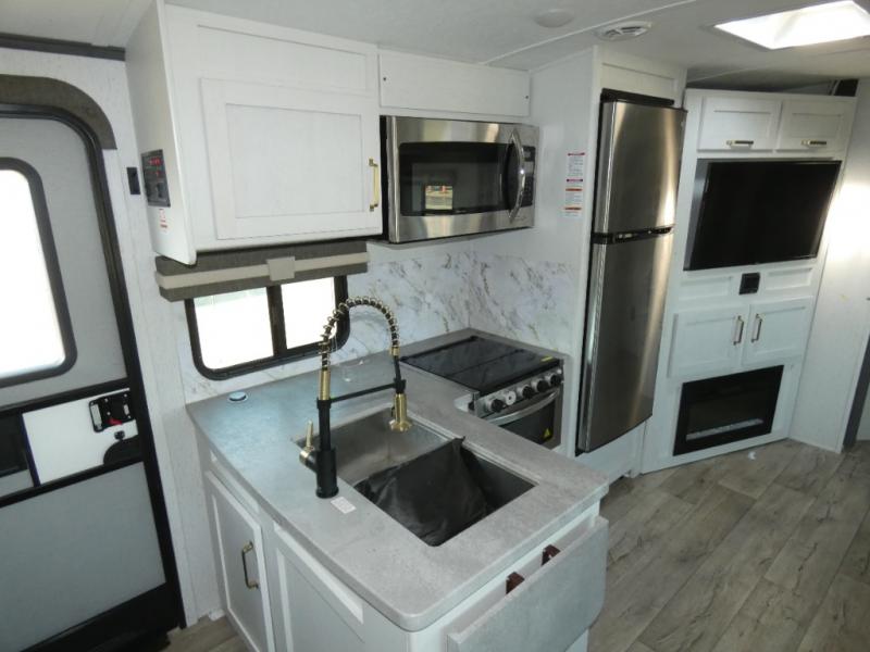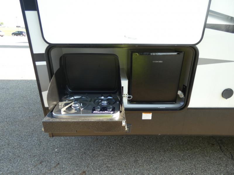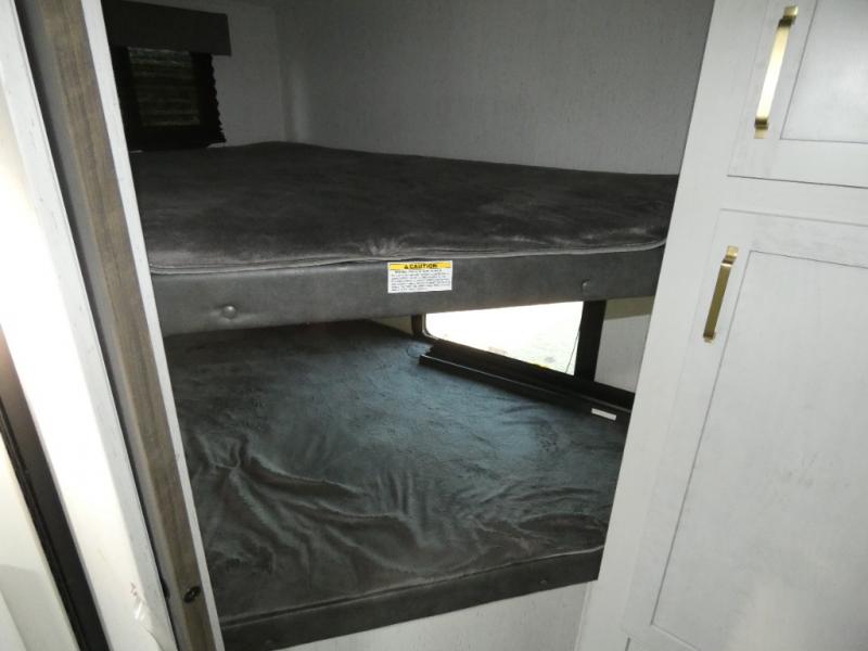 The family will love camping in this travel trailer! The kids can sleep in the rear private bunkhouse with the double-size bunk beds and store their clothes in the wardrobe. You will enjoy your own privacy with the front bedroom which has a king bed with wardrobes/nightstands on either side and an entrance into the walk-through bathroom. You will easily be able to prepare your best meals in the kitchen with the countertop extension, the 8 cu. ft. double door refrigerator, and the glass top three burner cooktop with a 17" oven, plus there is a pantry behind the hinged entertainment center which has a 40" LED TV to watch your favorite movies!