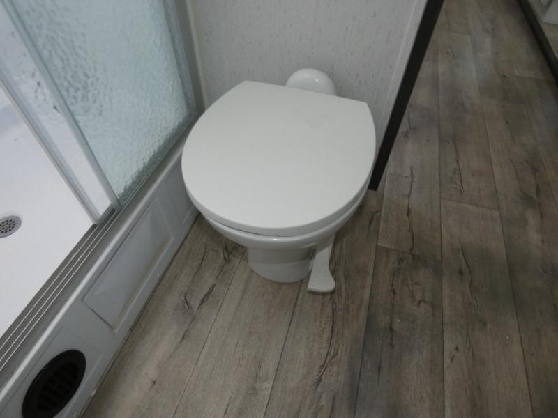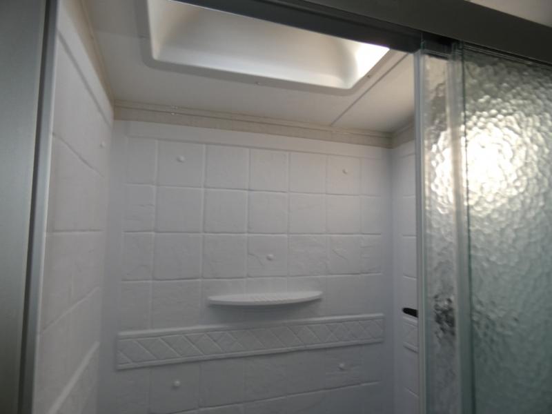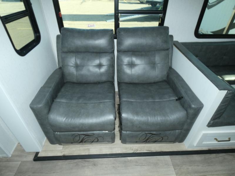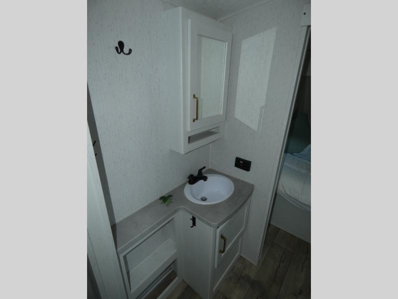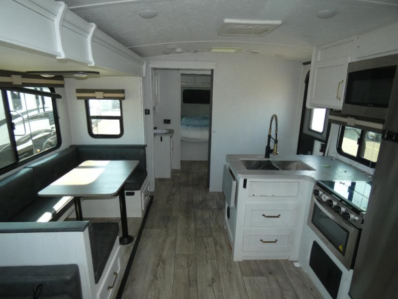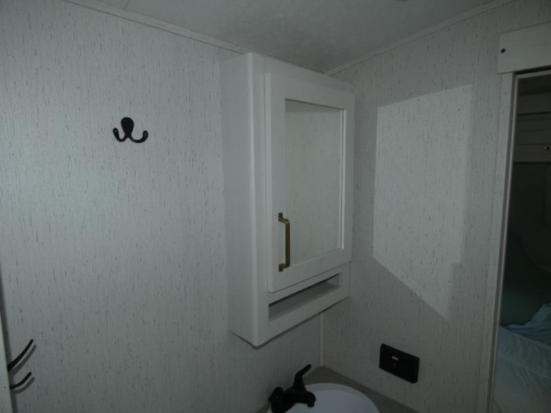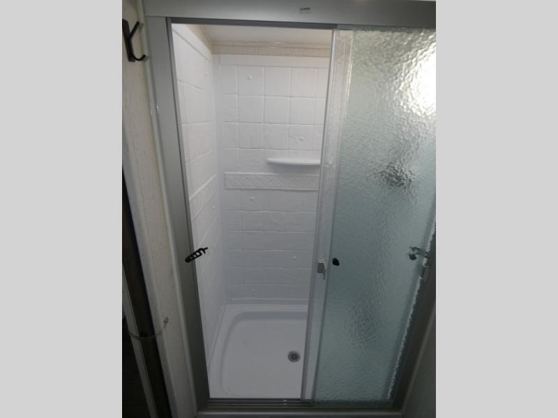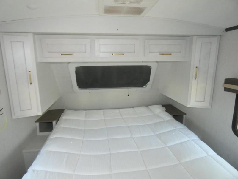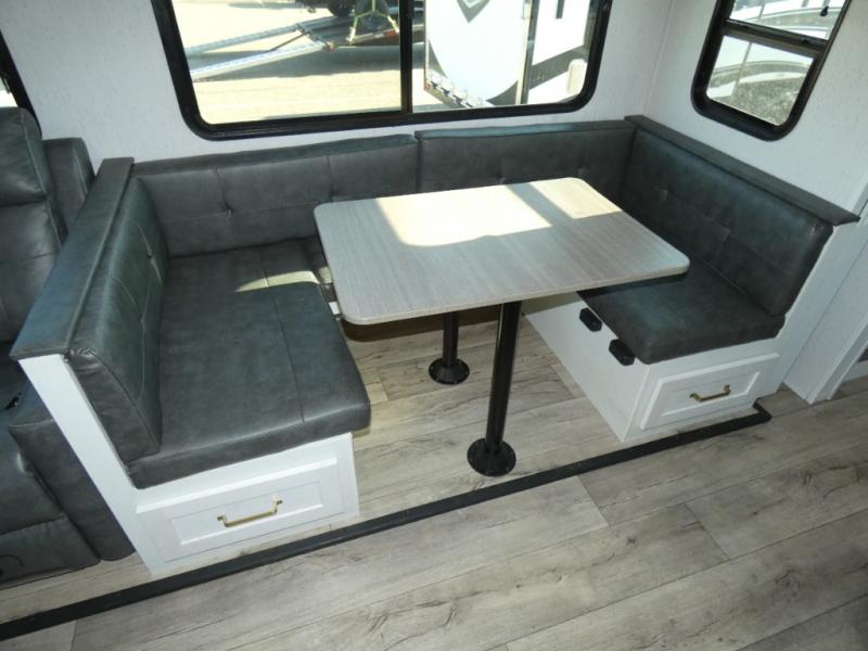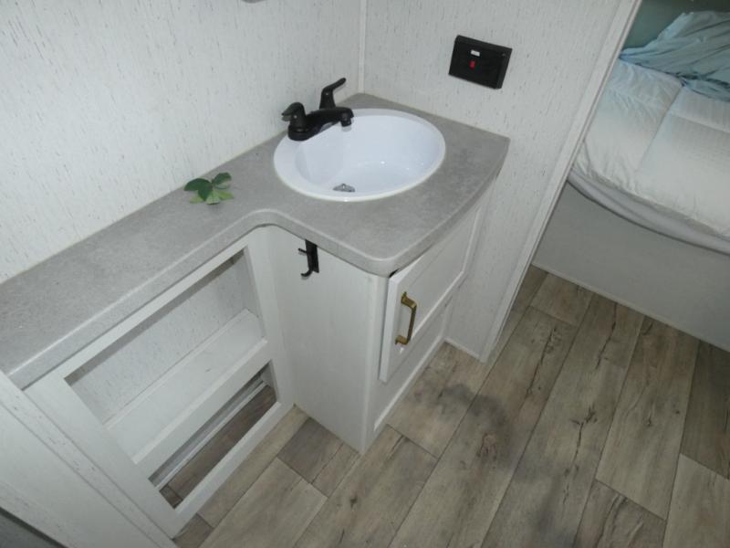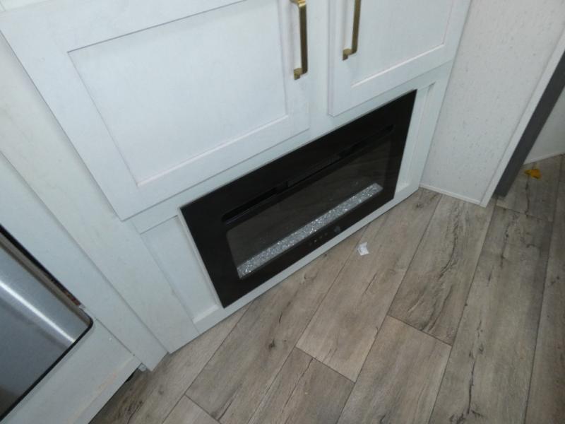 The family will love camping in this travel trailer! The kids can sleep in the rear private bunkhouse with the double-size bunk beds and store their clothes in the wardrobe. You will enjoy your own privacy with the front bedroom which has a king bed with wardrobes/nightstands on either side and an entrance into the walk-through bathroom. You will easily be able to prepare your best meals in the kitchen with the countertop extension, the 8 cu. ft. double door refrigerator, and the glass top three burner cooktop with a 17" oven, plus there is a pantry behind the hinged entertainment center which has a 40" LED TV to watch your favorite movies!