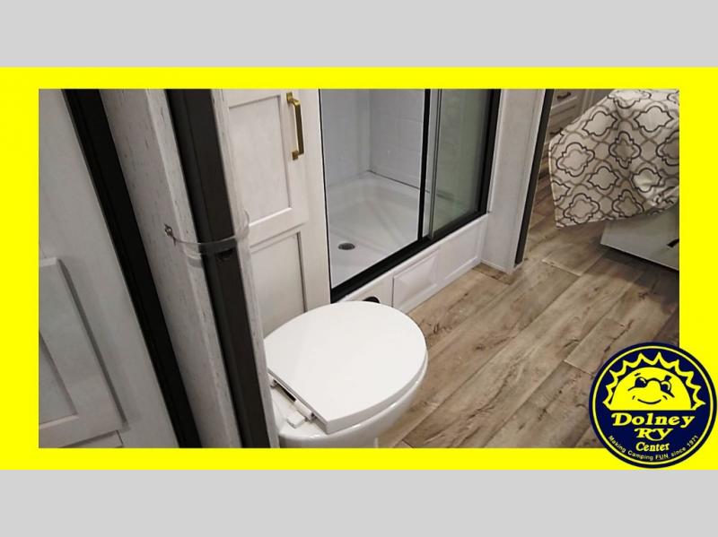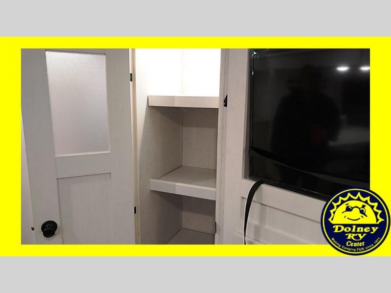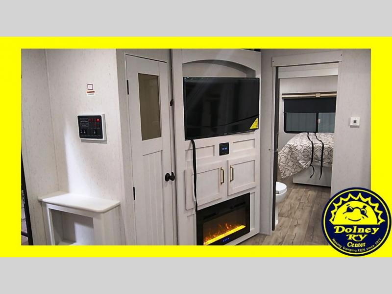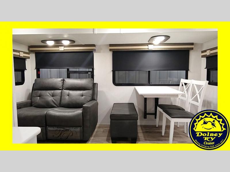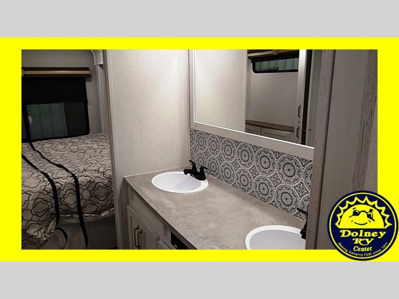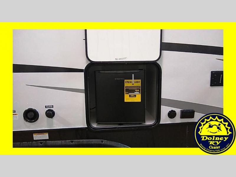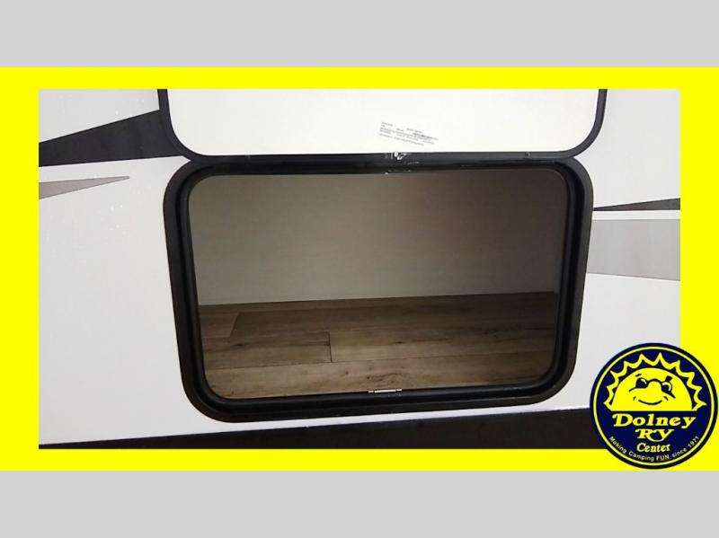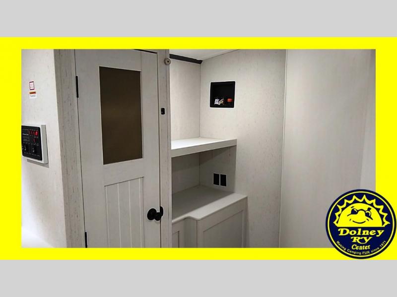 You will have everything you need for a comfortable camping trip with this travel trailer! It features a rear private bedroom with a king bed slide for more walking around space and an entrance into the walk-through bathroom which will come in handy at night. The bathroom also has a dual sink vanity for two to get ready at once in the mornings. The front kitchen has plenty of countertop space to prepare your best meals and you can comfortably enjoy them at the U-shaped dinette, plus it can transform into an extra sleeping space for a guest or two to tag along. What better way to relax at night than on the sofa across from the hinged entertainment center!
