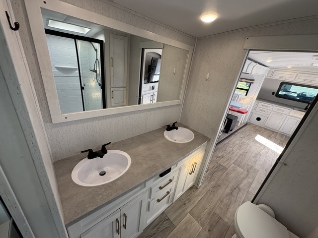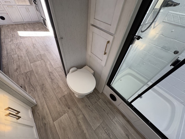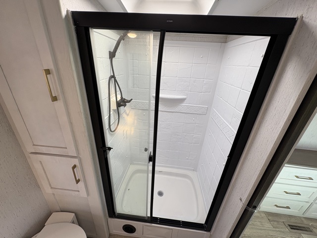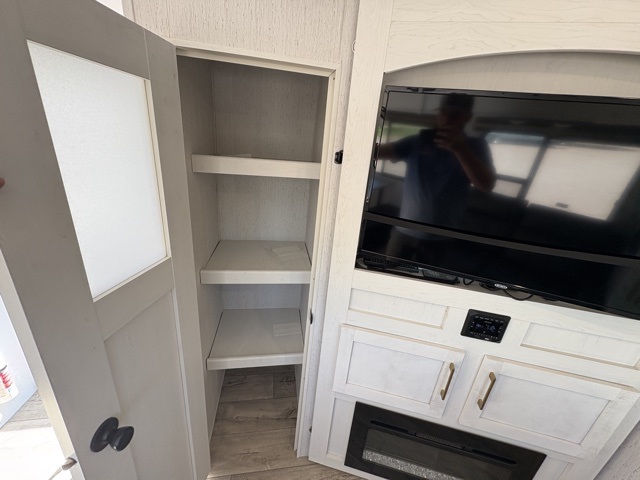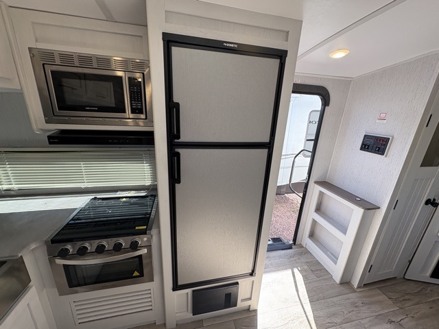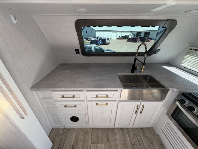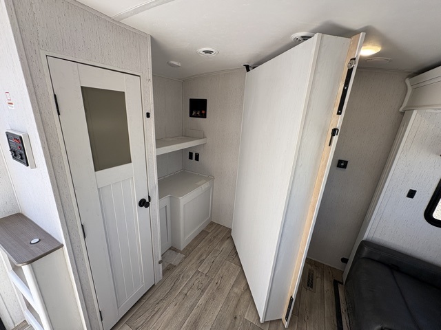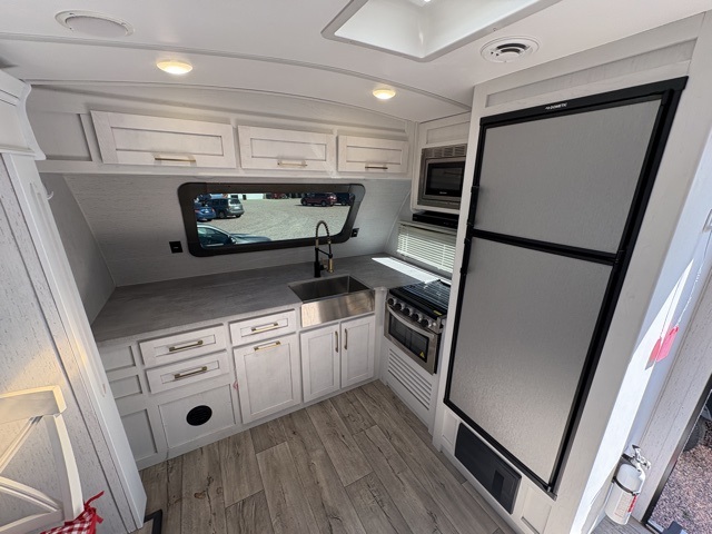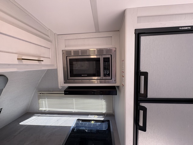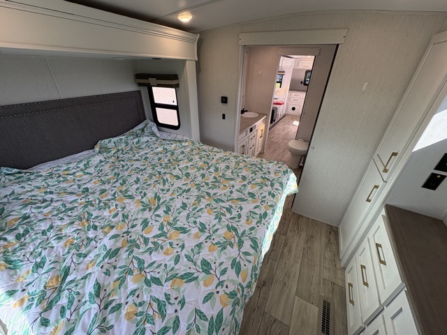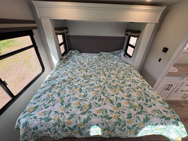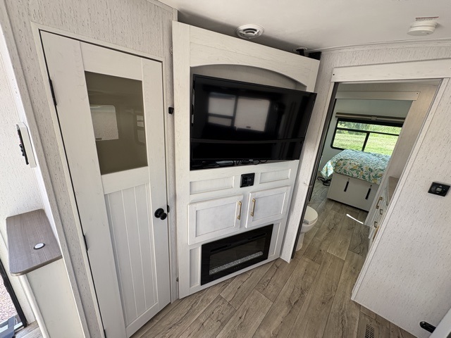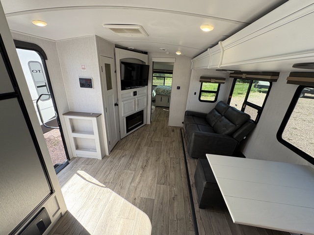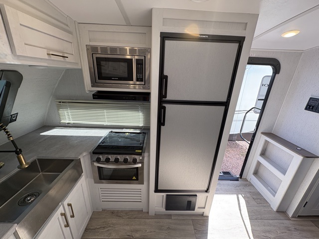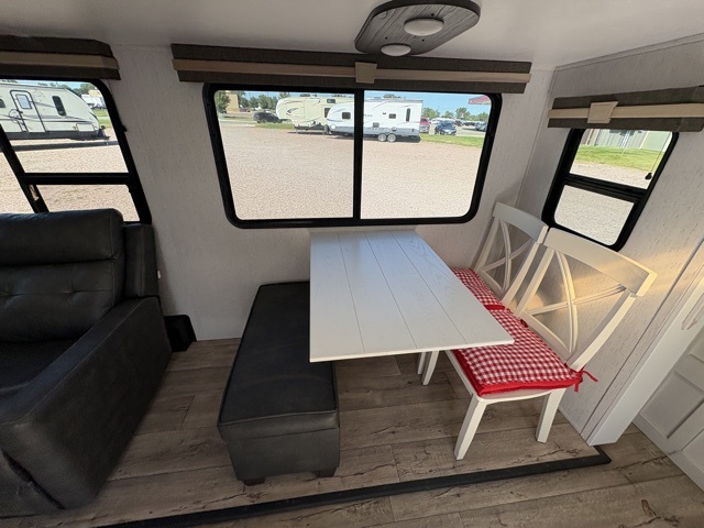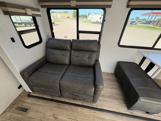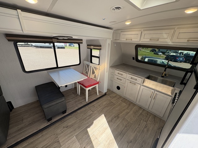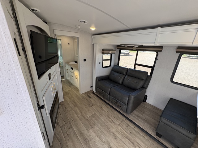 You will have everything you need for a comfortable camping trip with this travel trailer! It features a rear private bedroom with a king bed slide for more walking around space and an entrance into the walk-through bathroom which will come in handy at night. The bathroom also has a dual sink vanity for two to get ready at once in the mornings. The front kitchen has plenty of countertop space to prepare your best meals and you can comfortably enjoy them at the U-shaped dinette, plus it can transform into an extra sleeping space for a guest or two to tag along. What better way to relax at night than on the sofa across from the hinged entertainment center!