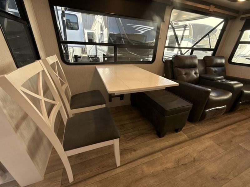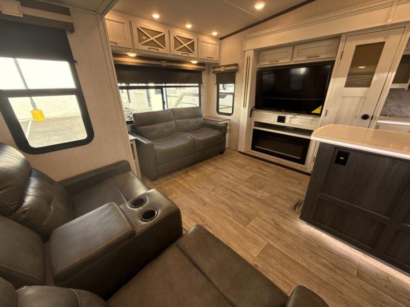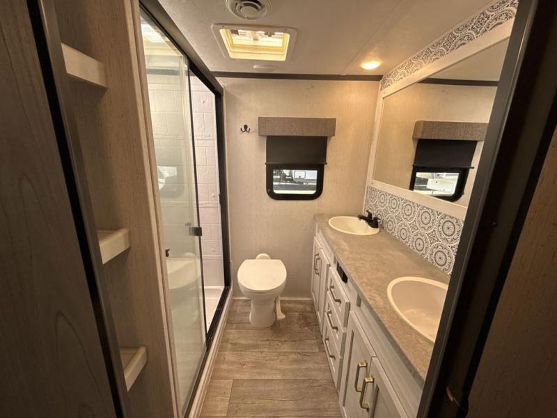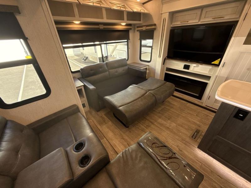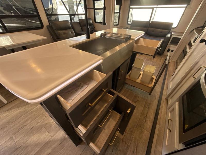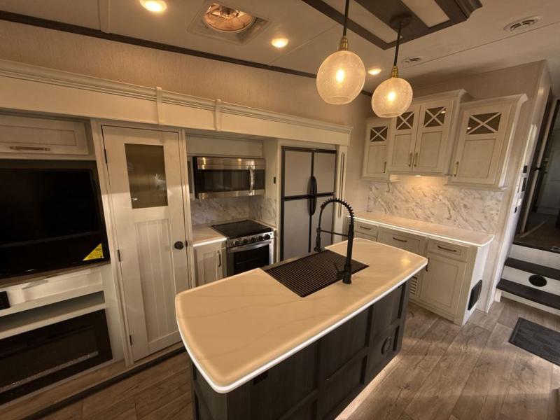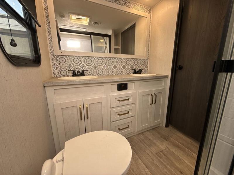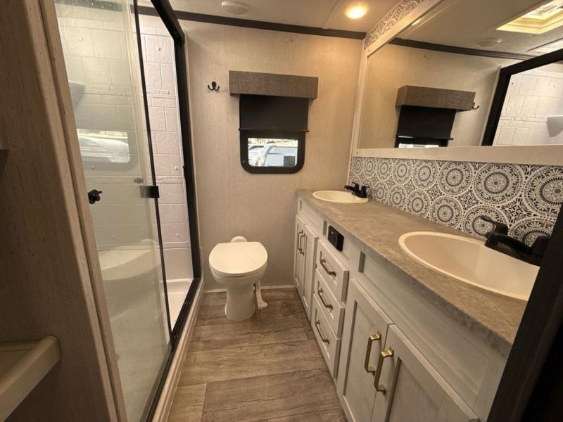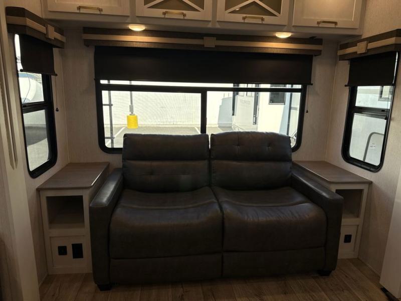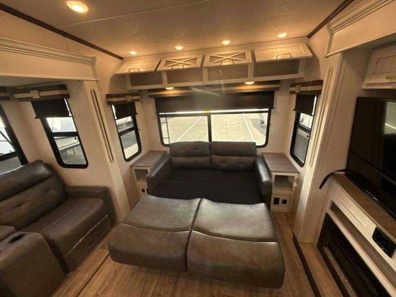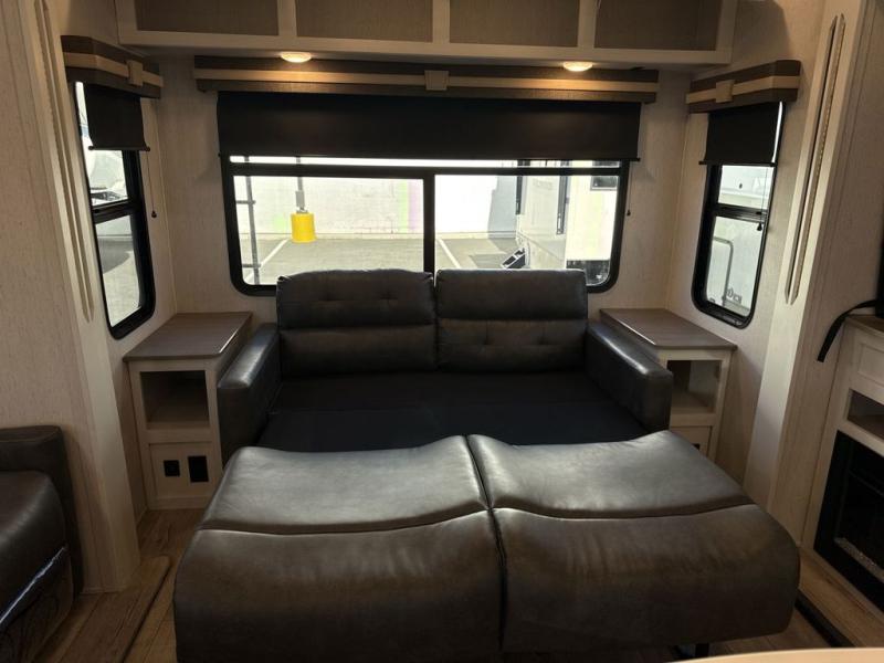 Two can get ready at once with a dual sink vanity in the full bathroom of this fifth wheel! Enjoy a good night's rest and walking around space with the king bed slide in the front private bedroom which also has a front wardrobe to keep your clothes looking their best, and a closet prepped for a washer/dryer option. The chef will have an easy time preparing meals in the kitchen with the island, the extra countertop space below the hutch, and the glass top three burner cooktop with 21" oven. The rear living area has a tri-fold sofa and theater seating across from an entertainment center with a fireplace and a 50" LED TV!