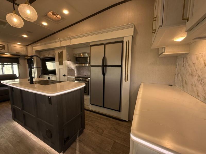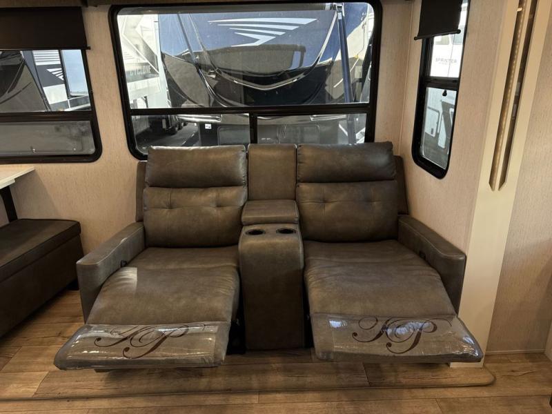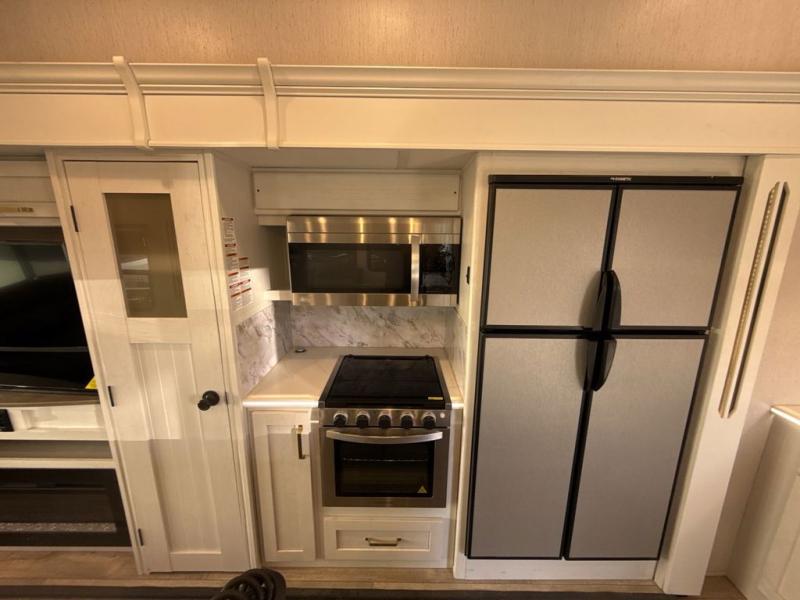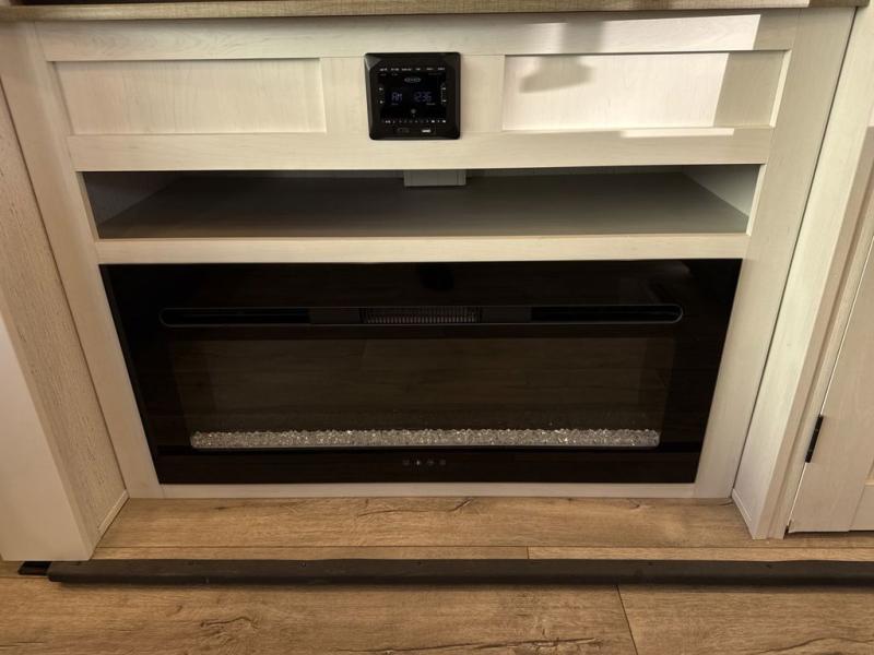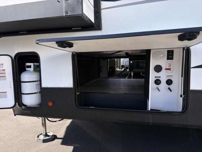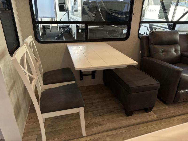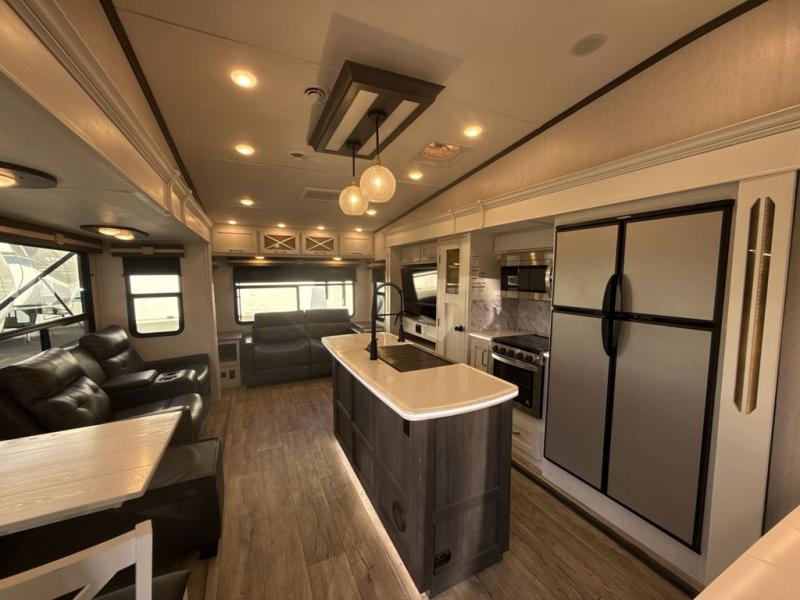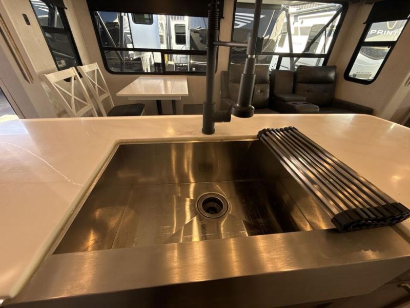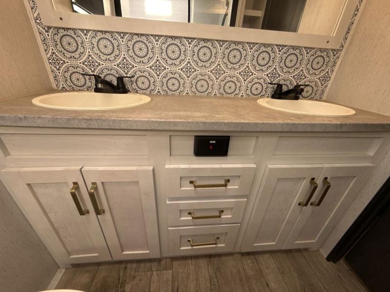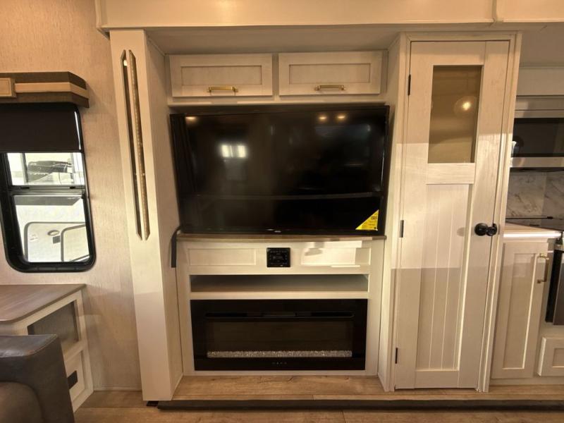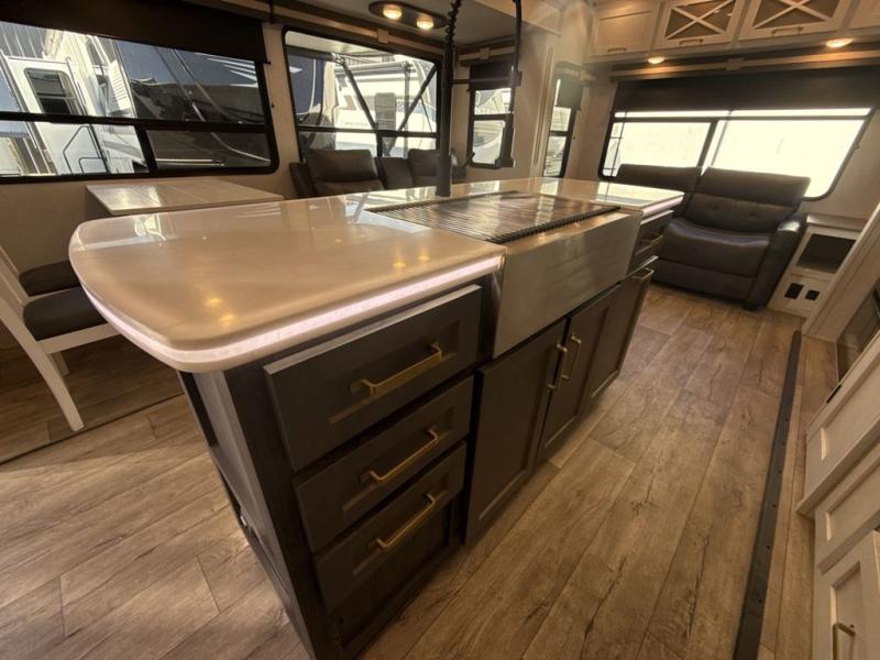 Two can get ready at once with a dual sink vanity in the full bathroom of this fifth wheel! Enjoy a good night's rest and walking around space with the king bed slide in the front private bedroom which also has a front wardrobe to keep your clothes looking their best, and a closet prepped for a washer/dryer option. The chef will have an easy time preparing meals in the kitchen with the island, the extra countertop space below the hutch, and the glass top three burner cooktop with 21" oven. The rear living area has a tri-fold sofa and theater seating across from an entertainment center with a fireplace and a 50" LED TV!