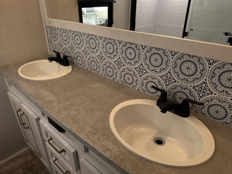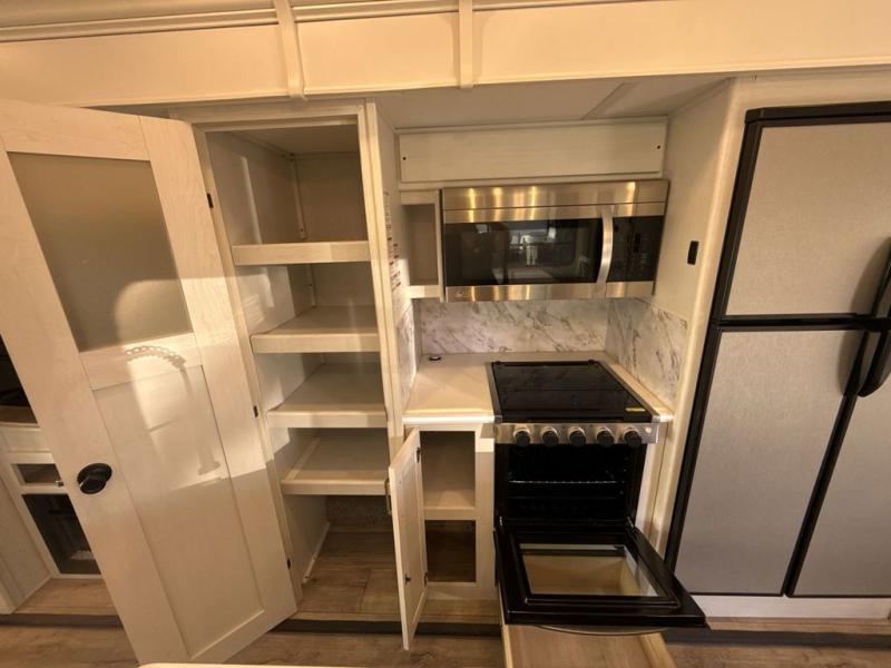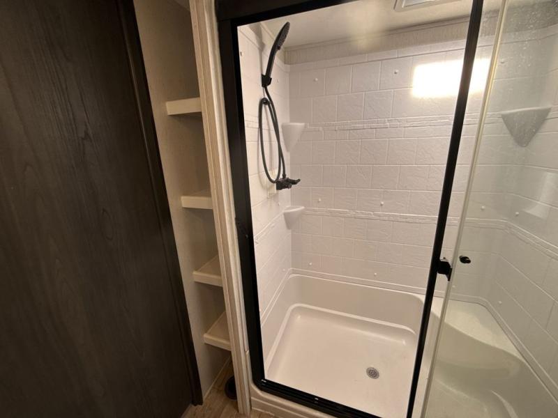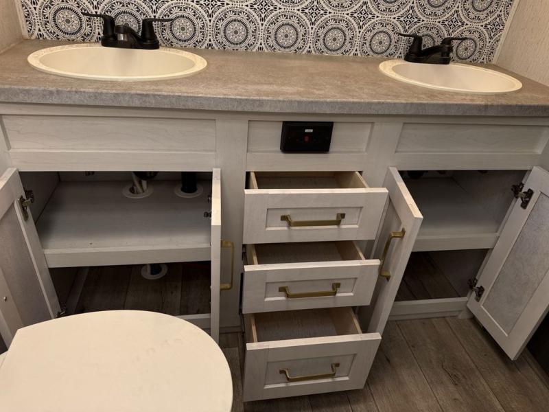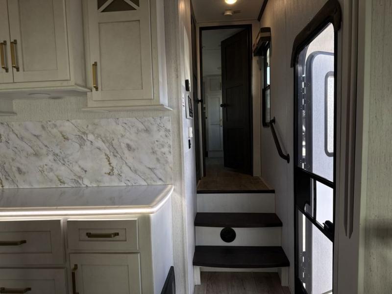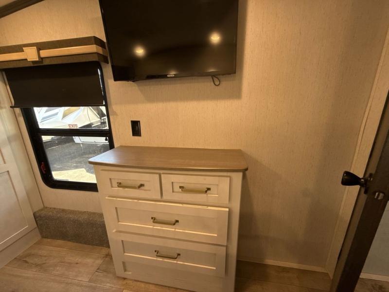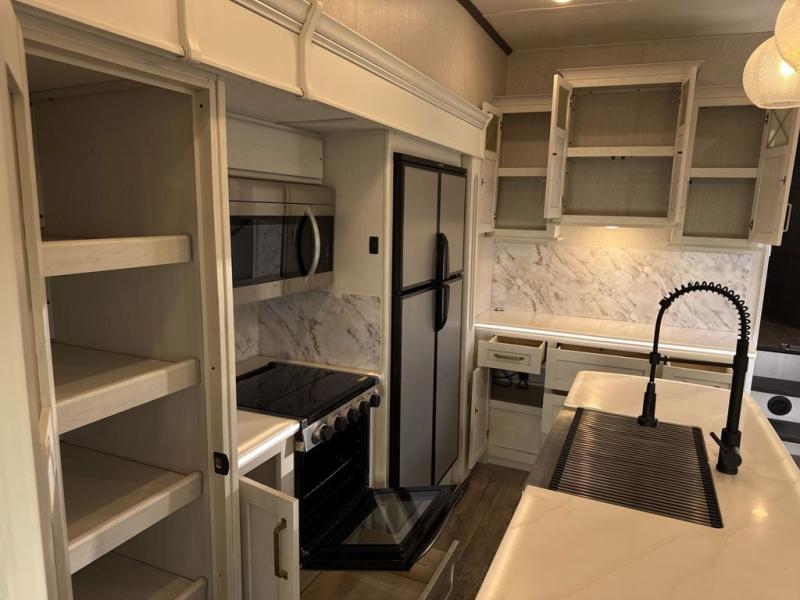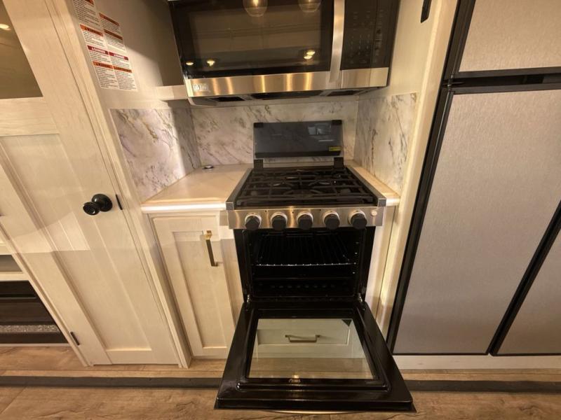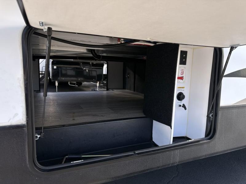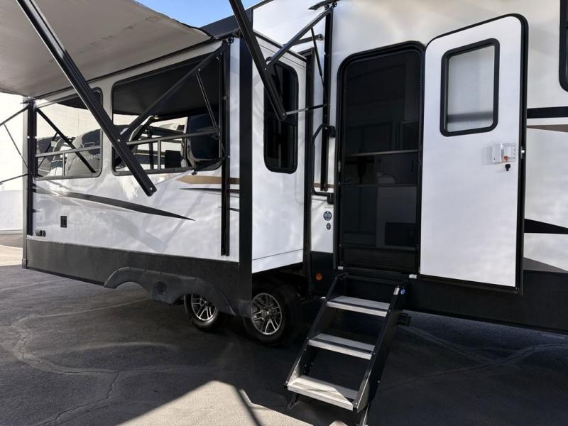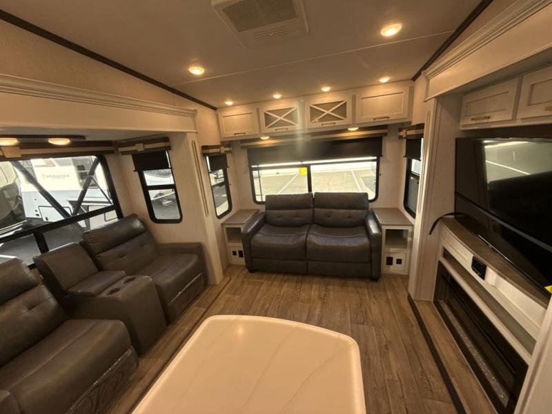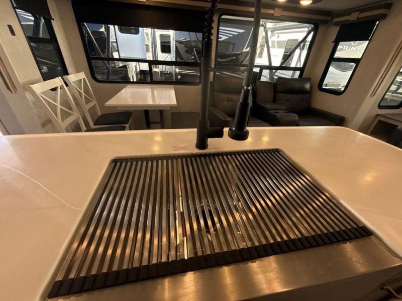 Two can get ready at once with a dual sink vanity in the full bathroom of this fifth wheel! Enjoy a good night's rest and walking around space with the king bed slide in the front private bedroom which also has a front wardrobe to keep your clothes looking their best, and a closet prepped for a washer/dryer option. The chef will have an easy time preparing meals in the kitchen with the island, the extra countertop space below the hutch, and the glass top three burner cooktop with 21" oven. The rear living area has a tri-fold sofa and theater seating across from an entertainment center with a fireplace and a 50" LED TV!