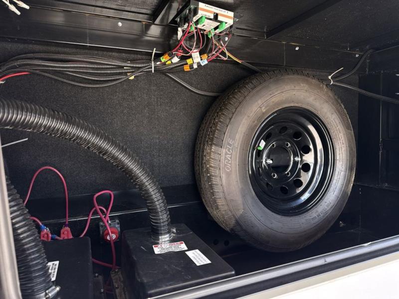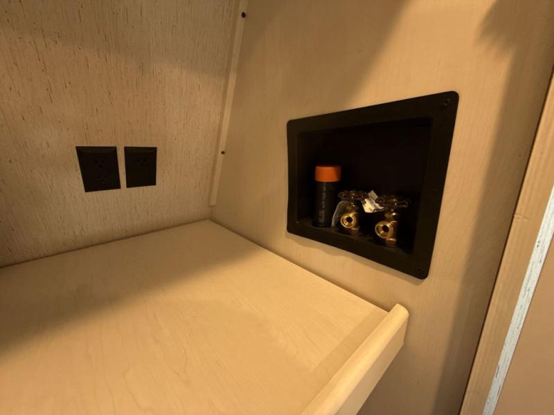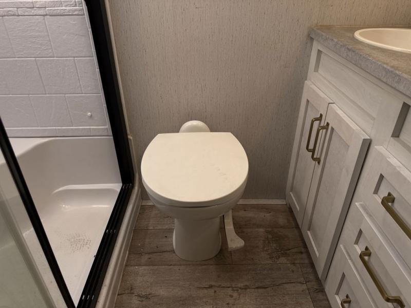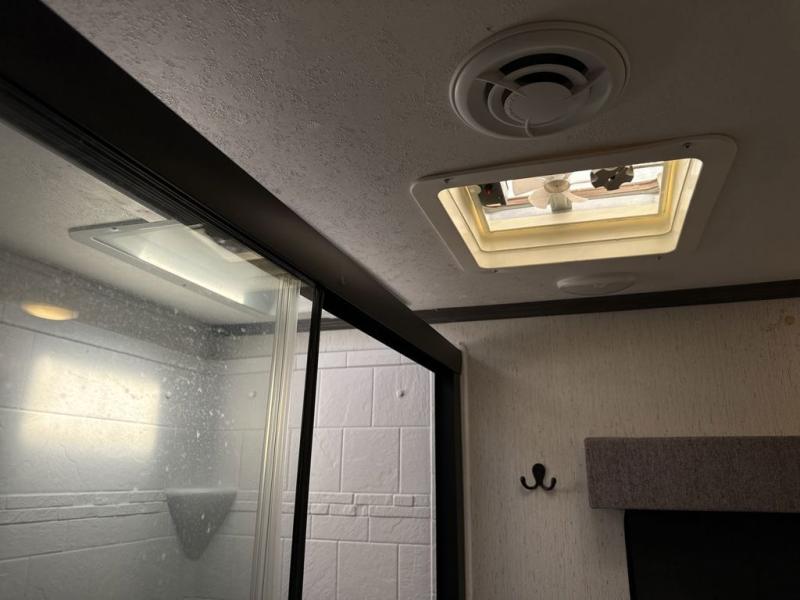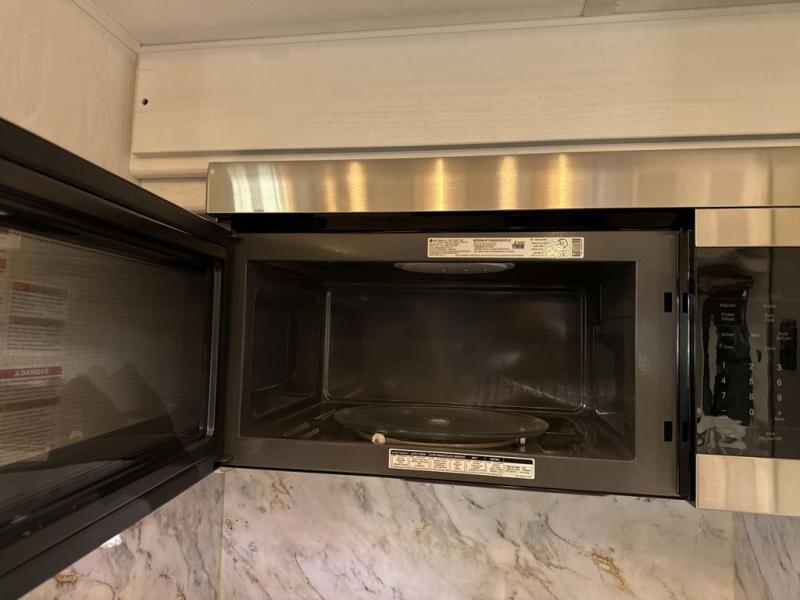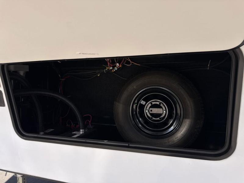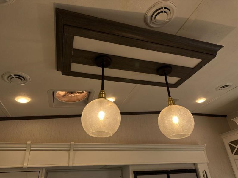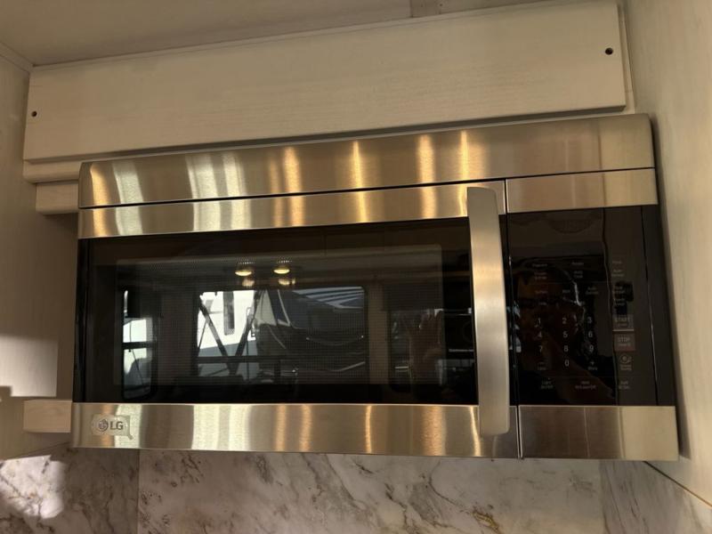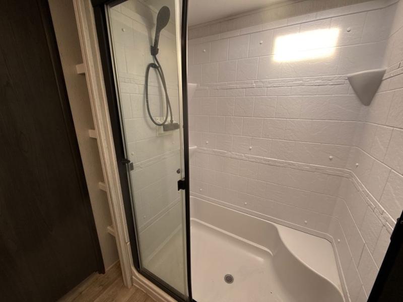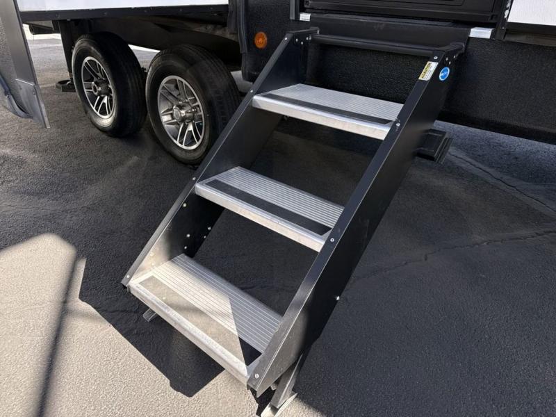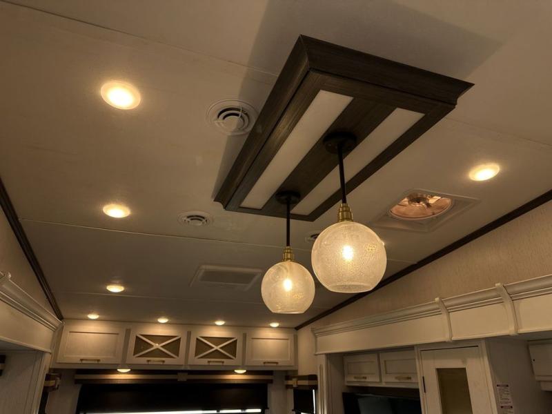 Two can get ready at once with a dual sink vanity in the full bathroom of this fifth wheel! Enjoy a good night's rest and walking around space with the king bed slide in the front private bedroom which also has a front wardrobe to keep your clothes looking their best, and a closet prepped for a washer/dryer option. The chef will have an easy time preparing meals in the kitchen with the island, the extra countertop space below the hutch, and the glass top three burner cooktop with 21" oven. The rear living area has a tri-fold sofa and theater seating across from an entertainment center with a fireplace and a 50" LED TV!