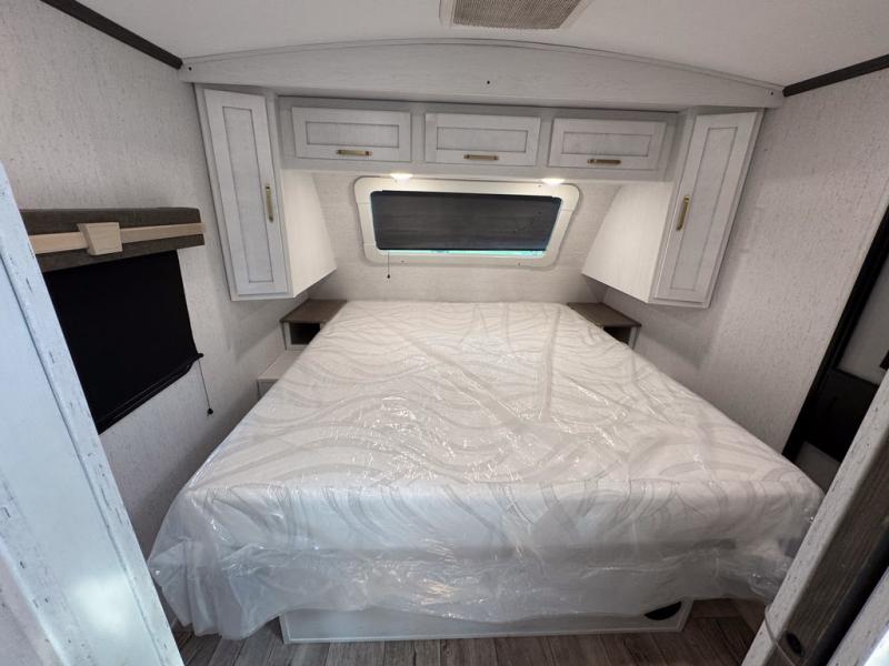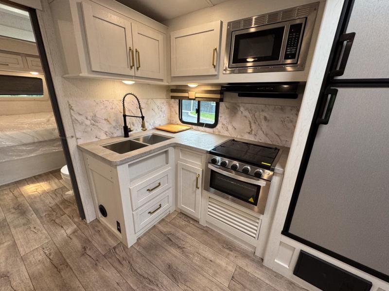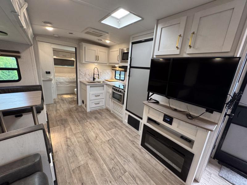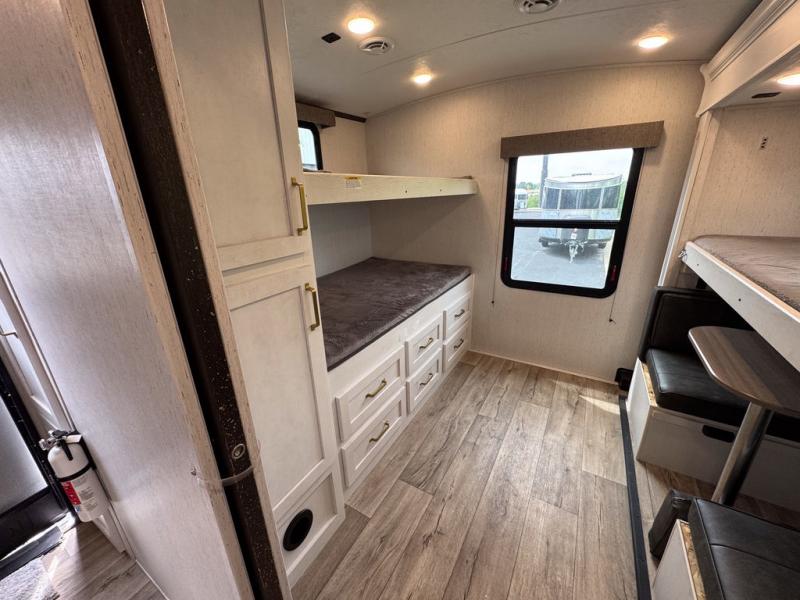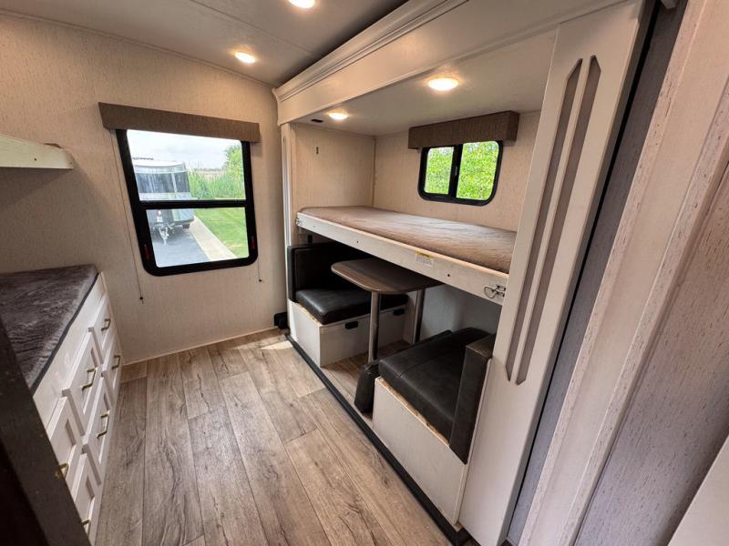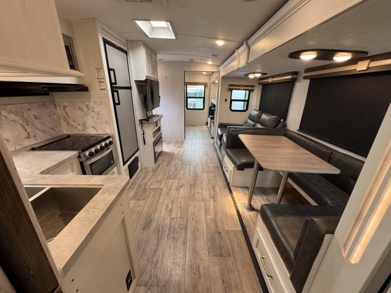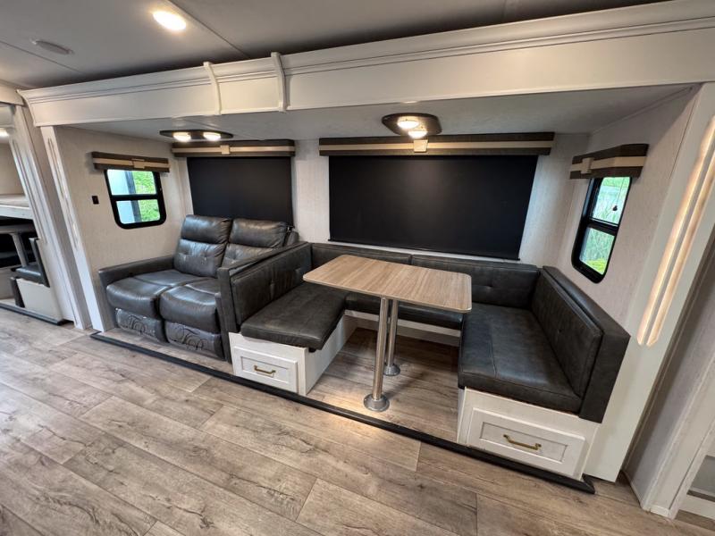 There are plenty of sleeping spaces for everyone in this travel trailer! From the rear private bunkhouse with a set of bunk beds along one side and a bunk bed above a sofa on the other to the front private bedroom with a king bed. You can even transform the tri-fold sofa and U-shaped dinette slide into extra sleeping spaces if needed. The walk-through bathroom has everything you will need to freshen up each morning. The chef will love cooking indoors with the glass top three burner cooktop with a 17" oven, yet may love cooking at the outdoor kitchen even more. Grab a snack from the walk-in pantry behind the entertainment center and watch your favorite movie on the 40" LED TV while a fire roars in the 30" glass fireplace!