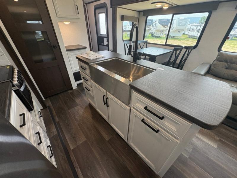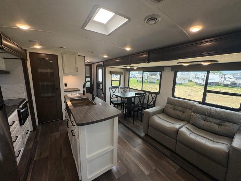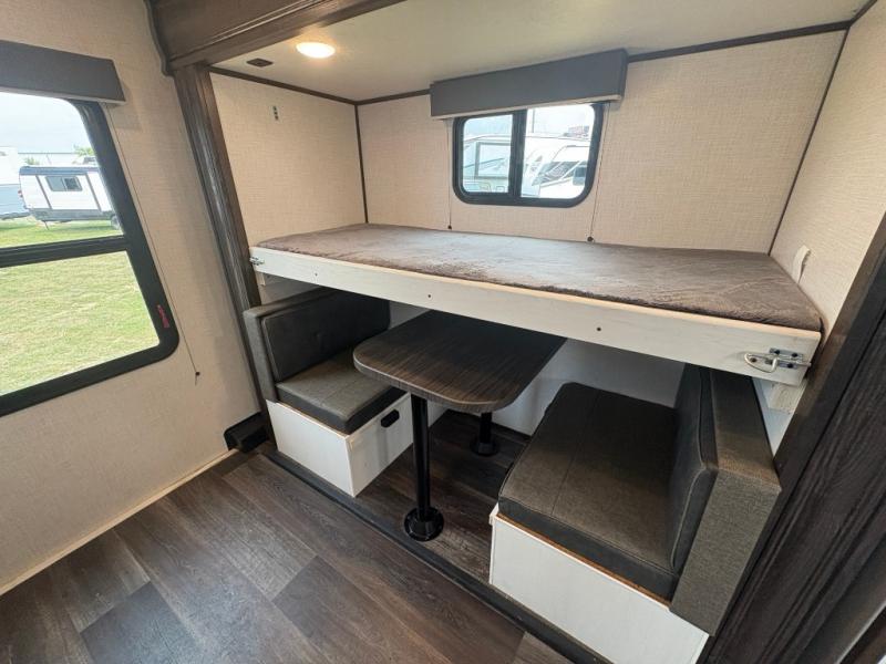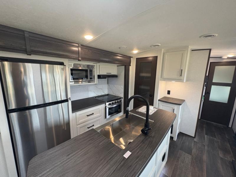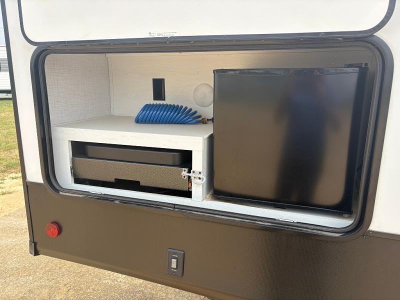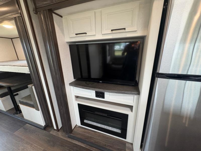 You can journey near or far with this Atlas travel trailer! Whether it's a local campground or a far-away state park, you will enjoy all that this trailer has to offer. There is much to love with the king-size bed in the front private bedroom, the kitchen island in between two opposing slides, the private bunkhouse with a slide out for more space, and the outdoor kitchen for cooking in the sunlight. When you find yourself indoors for the evening, you can switch on the LED HDTV for some entertainment, and the fireplace will add some ambiance to this space. Any time you are hungry, you can whip up something delicious on the recessed cooktop with large oven, and the pop-up power station will charge your electronics while you cook.