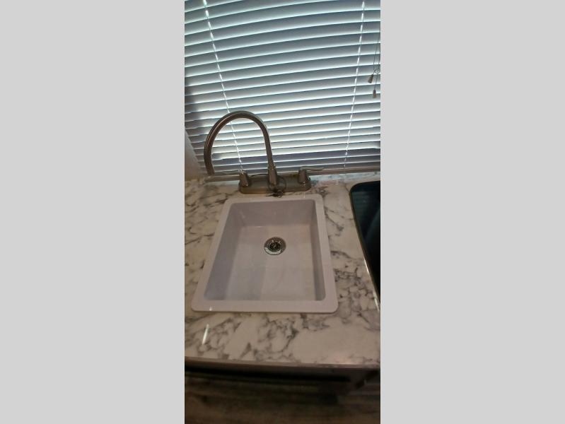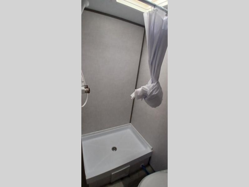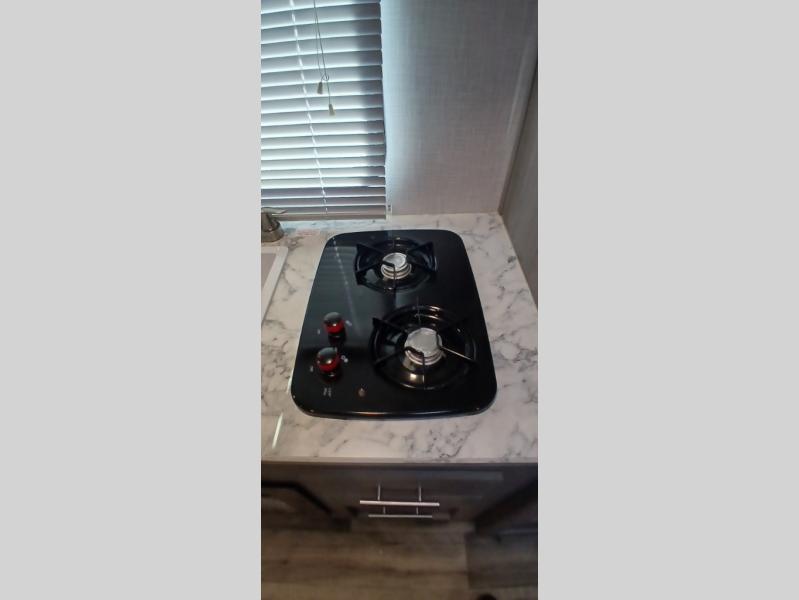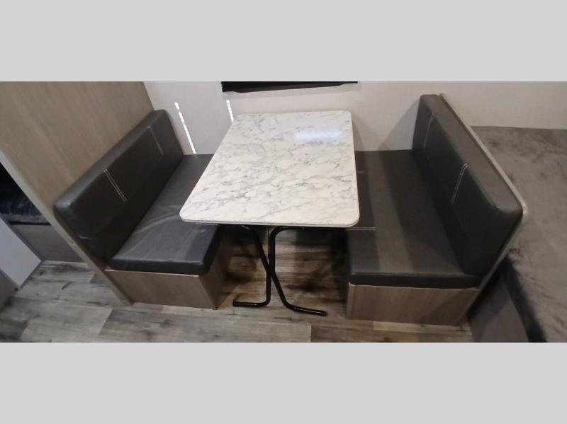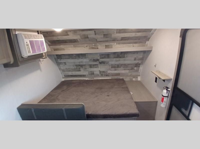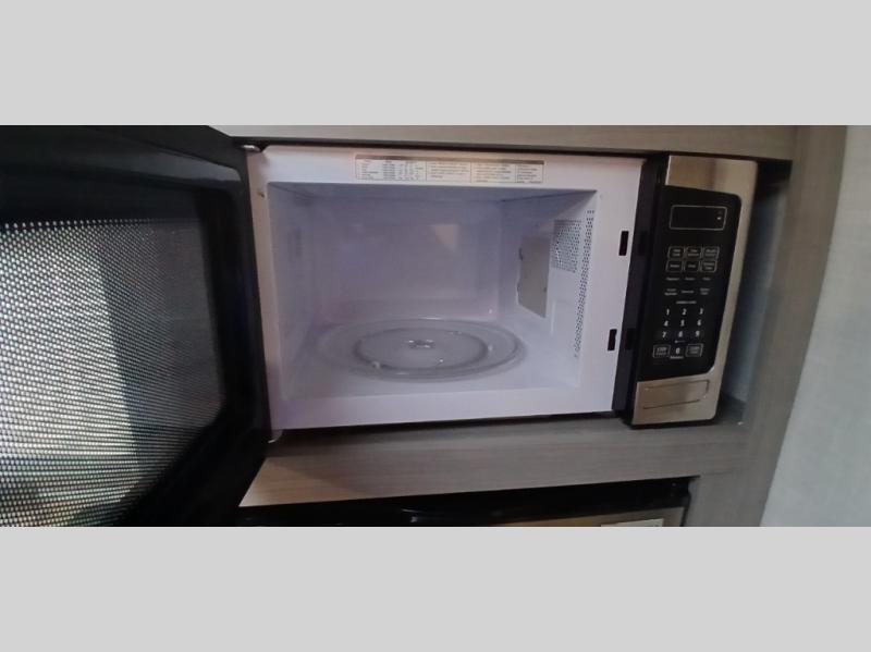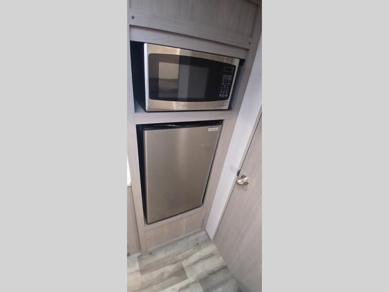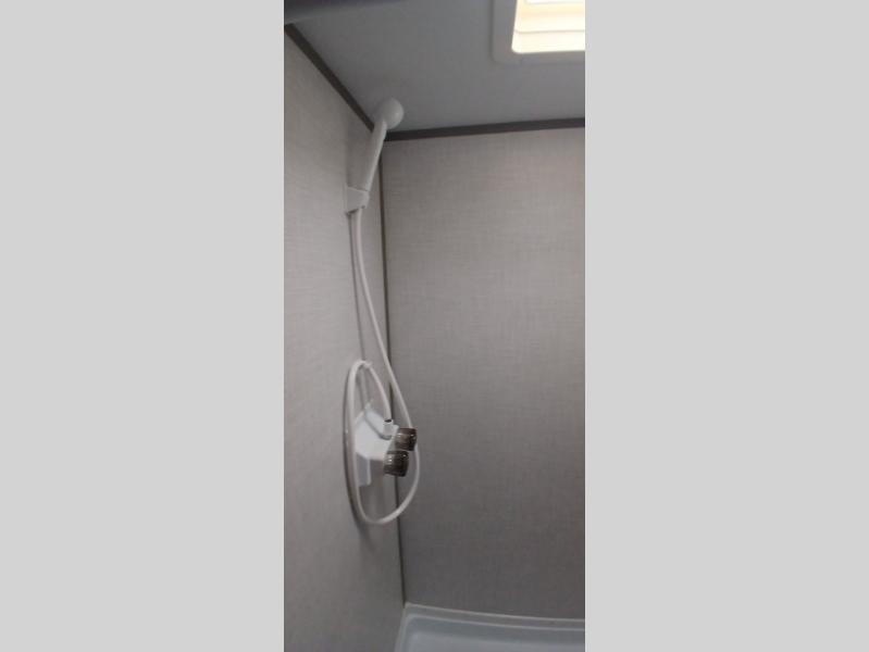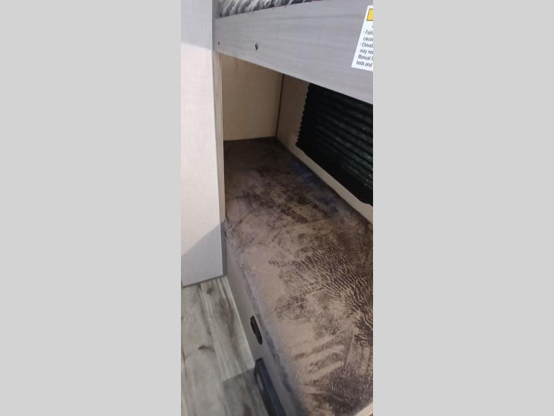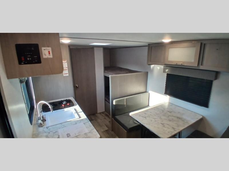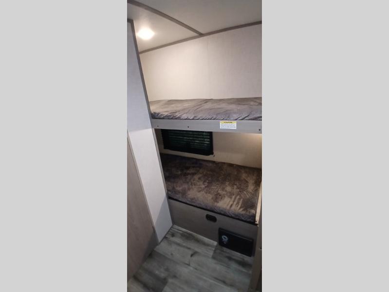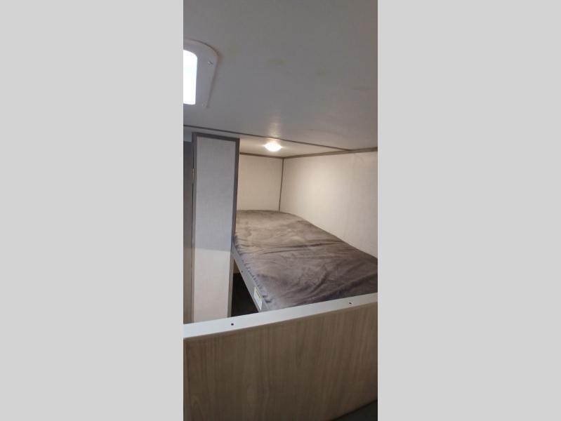 After making dinner on the two burner cooktop or inside the microwave, you can dine at the booth dinette or outside under the 8' power awning if you brought along your camping chairs. Either way you will be comfortable and the dinette may even sleep one person if needed. After playing outdoors all day, everyone can return to get cleaned up in the private bath with a shower and toilet, then fall asleep on the queen bed up front or the bunk beds in the rear corner.