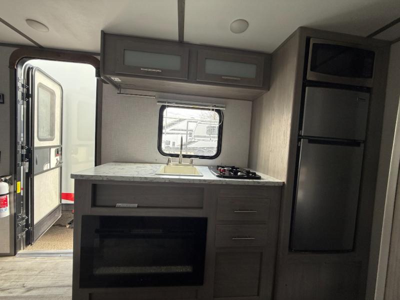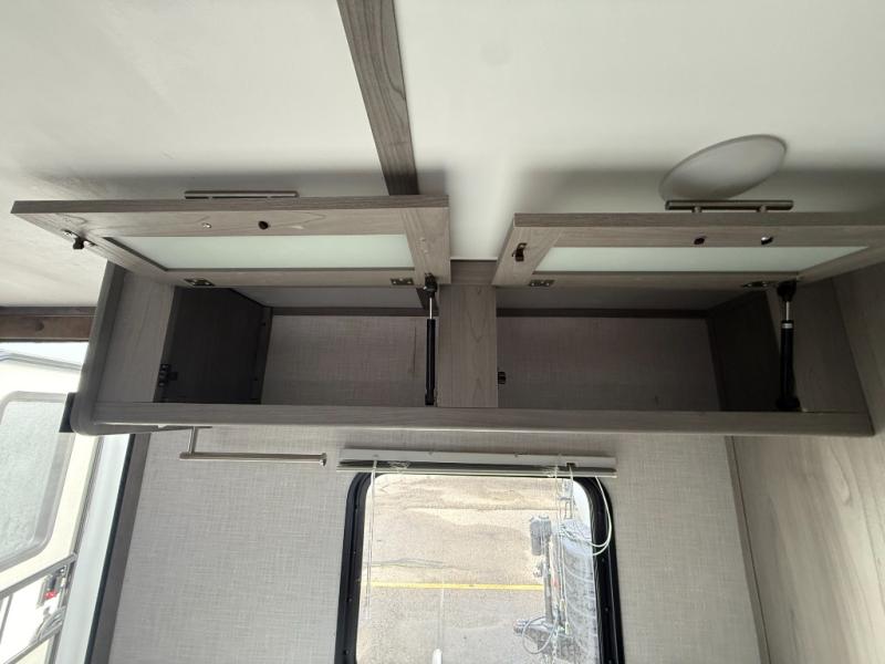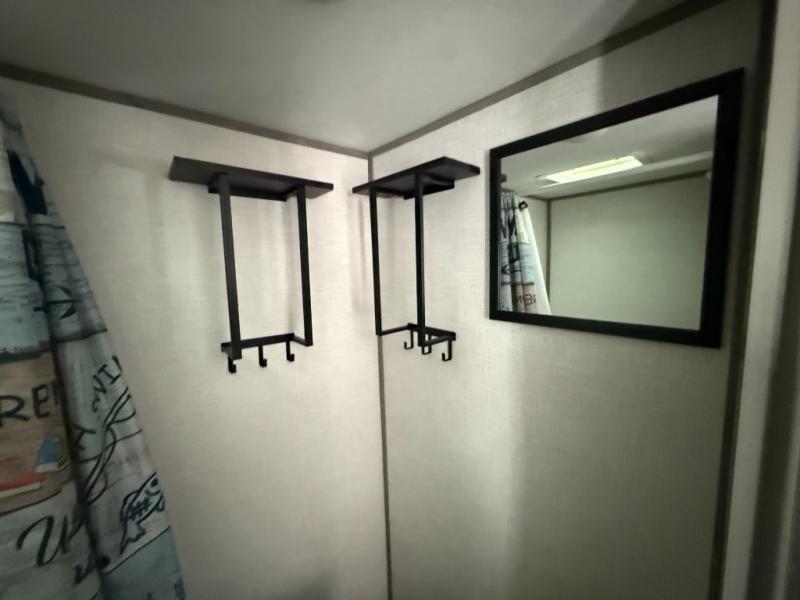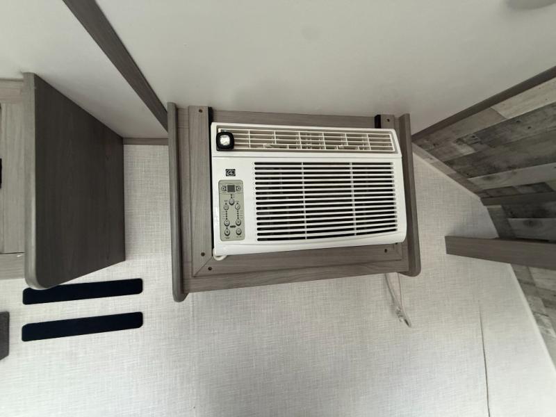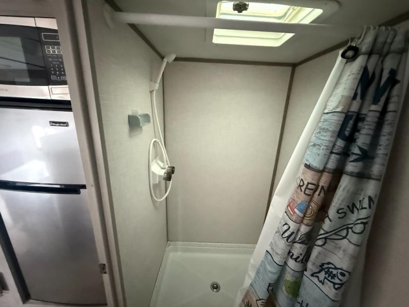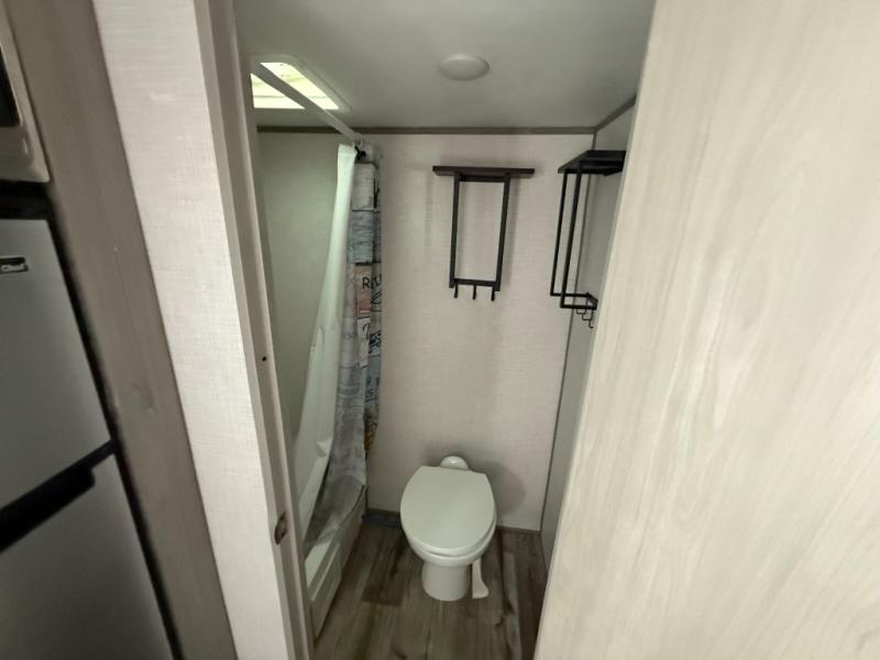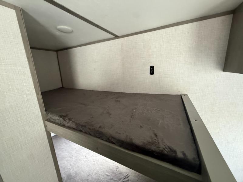 After making dinner on the two burner cooktop or inside the microwave, you can dine at the booth dinette or outside under the 8' power awning if you brought along your camping chairs. Either way you will be comfortable and the dinette may even sleep one person if needed. After playing outdoors all day, everyone can return to get cleaned up in the private toilet and shower room then fall asleep on the queen bed up front or the bunk beds in the rear. And everyone can wake up the next morning to do it over again.