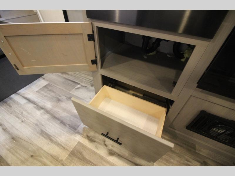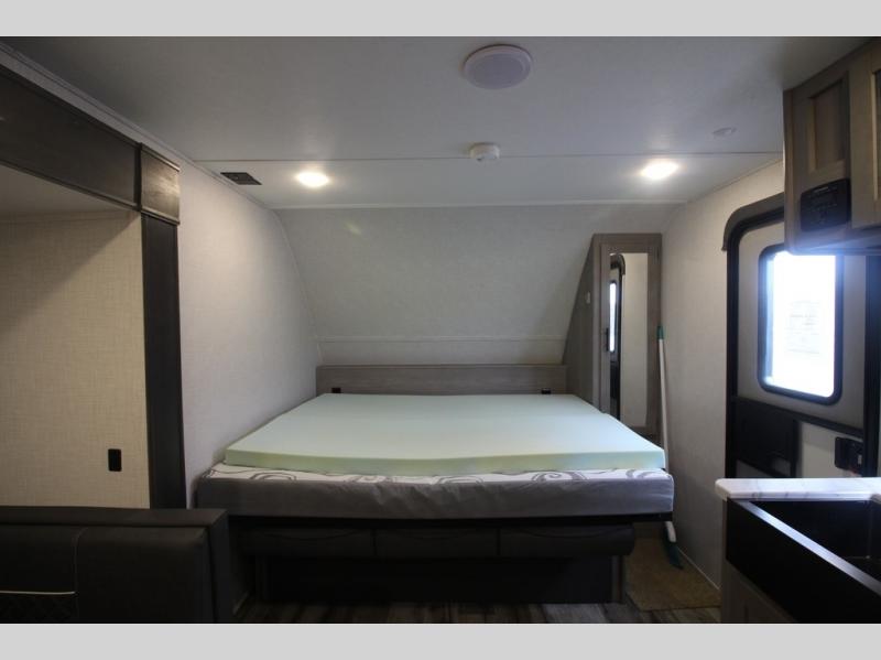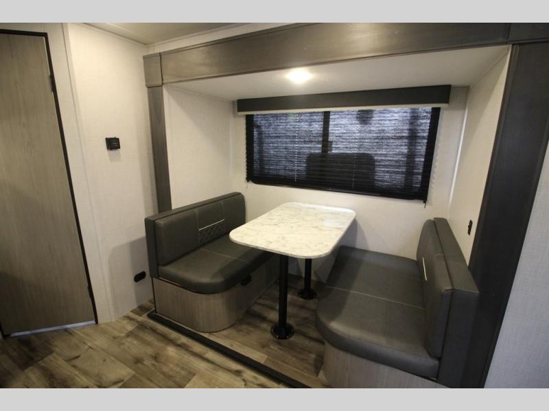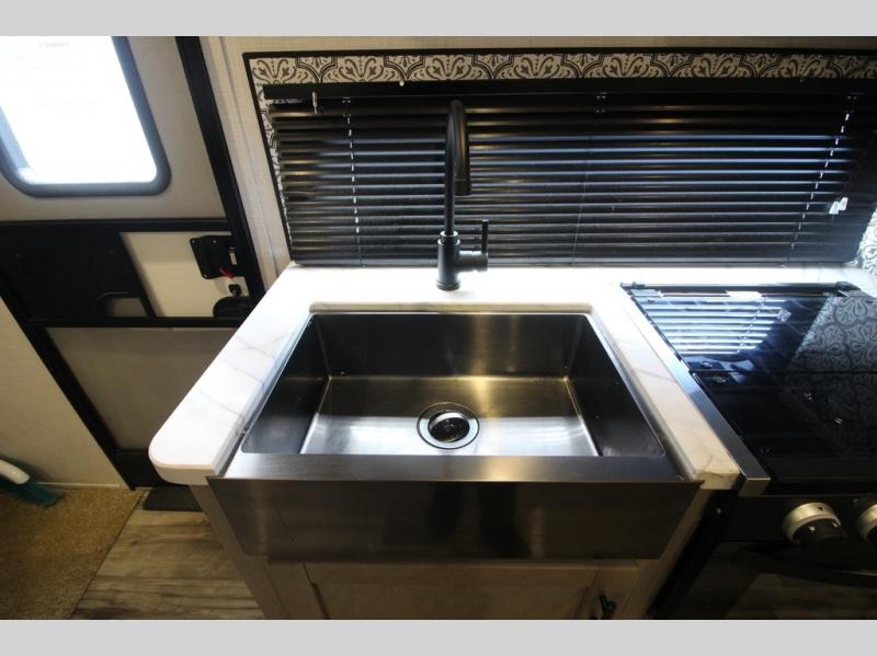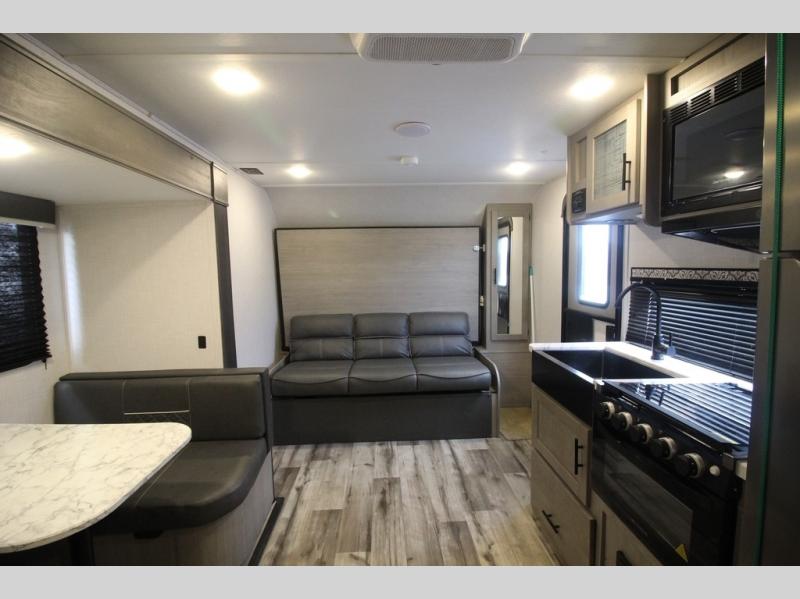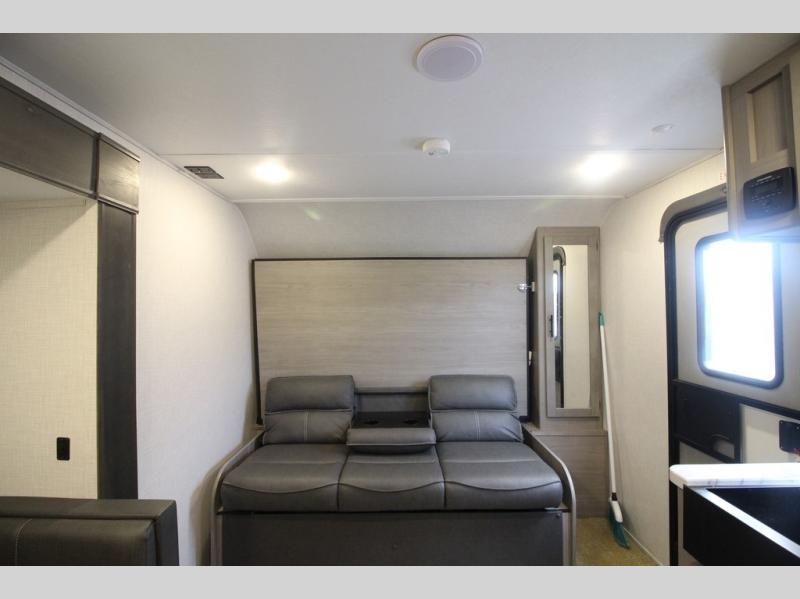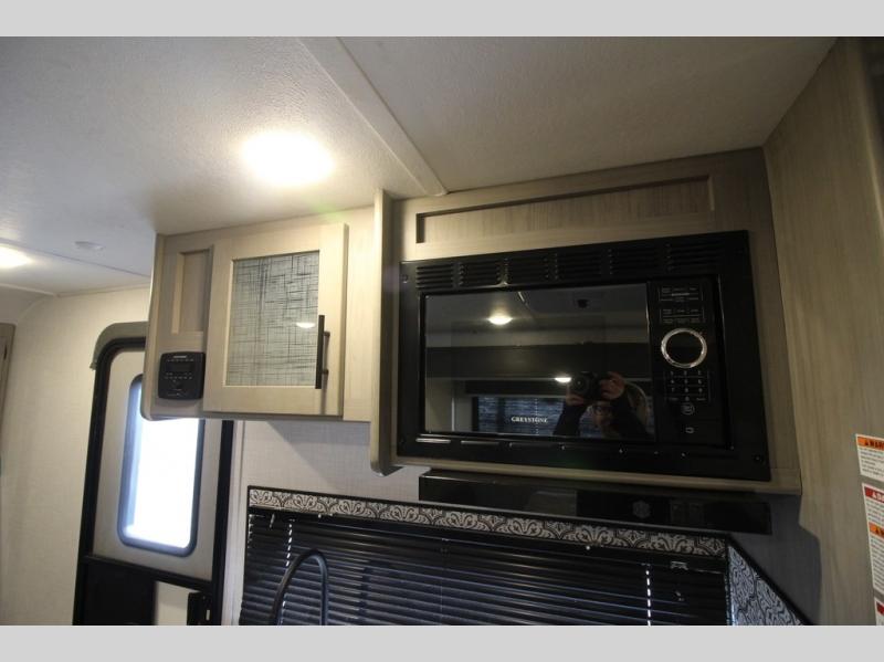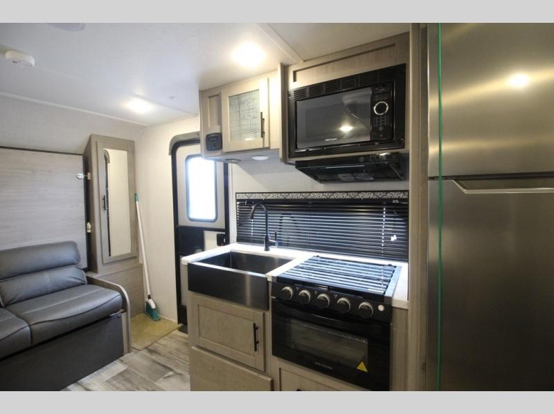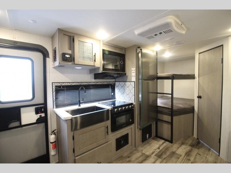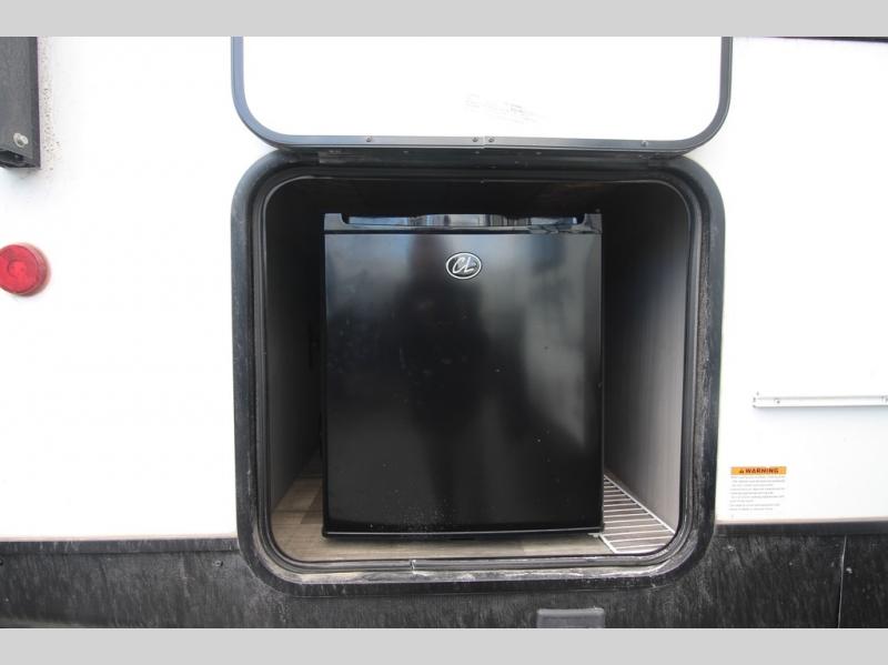 The Dutchmen Coleman Light travel trailer features an upgraded kitchen package with residential appliances, high-rise faucets, and a stainless steel farm-style sink. The fully enclosed underbelly allows all of your trailer's vital functions to be kept out of the freezing cold, and you'll have great stability as you enter your trailer by using the solid entry steps. Each model includes power stabilizer jacks, a power tongue jack, dual 20-LB propane tanks, a residential queen bed, and preparations for Wi-Fi 4G LTE. There is an aerodynamic front fiberglass cap, exterior speakers, solar charging connection, and aluminum wheels.