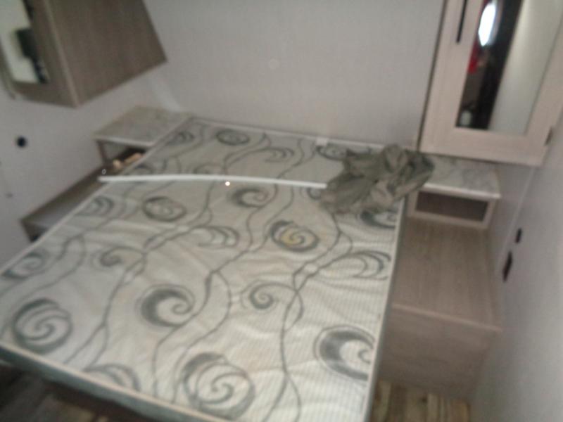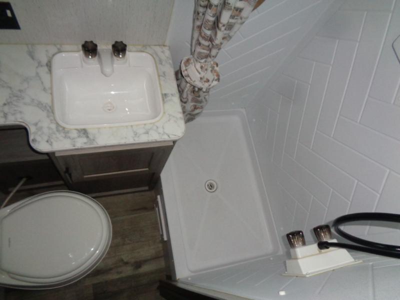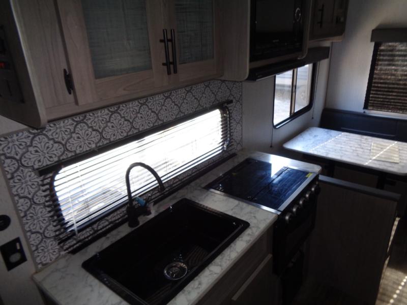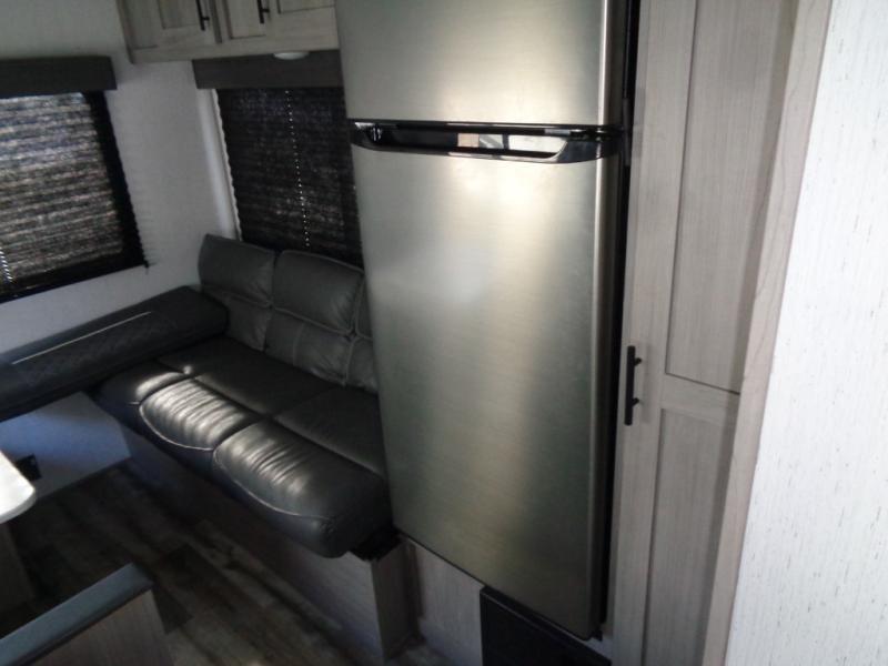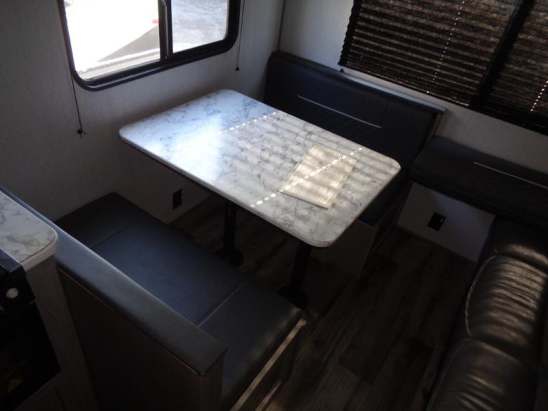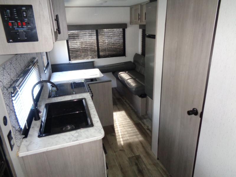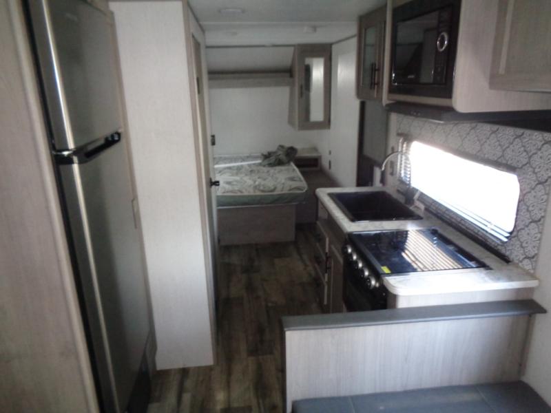 Your tent-camping days are over with this travel trailer in tow! Once you arrive at your destination, grab your fishing poles from the pass-through storage and head down to the lake. The full bath will allow you to freshen up when you return, plus there is a bath skylight for added standing space. The chef of your group can prepare dinner on the cooktop or oven, and perishables can be stored in the 7 cu. ft. refrigerator. There is a booth dinette where you can dine at, and a reclining sofa for extra seating space. You will love having your own queen bed up front with dual wardrobes on either side, and your guests can sleep on the furniture in the back!