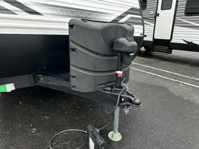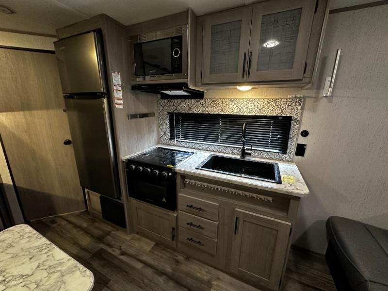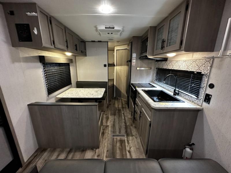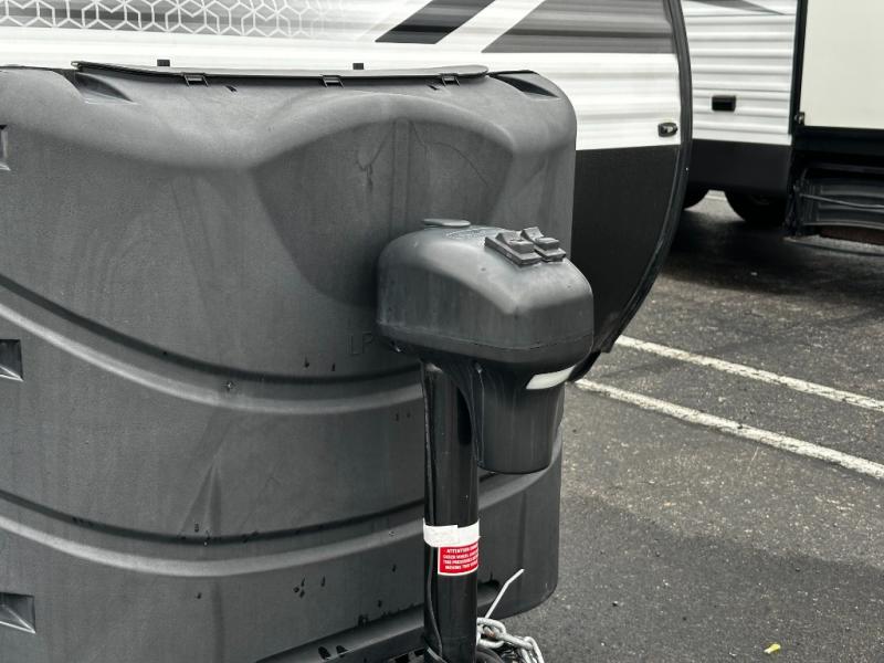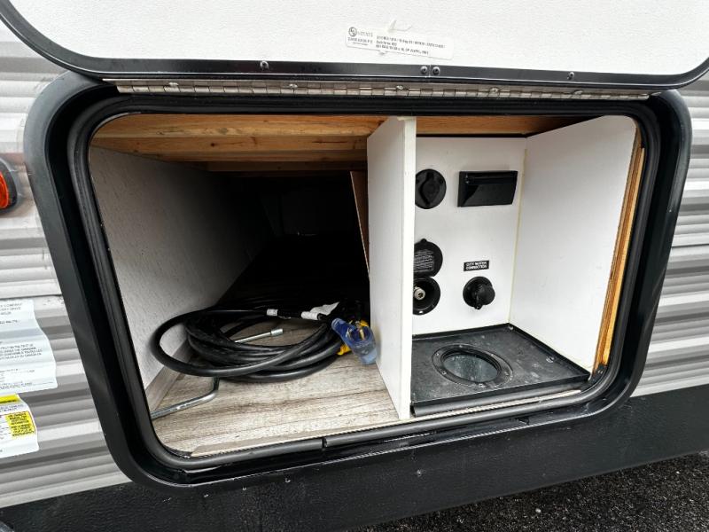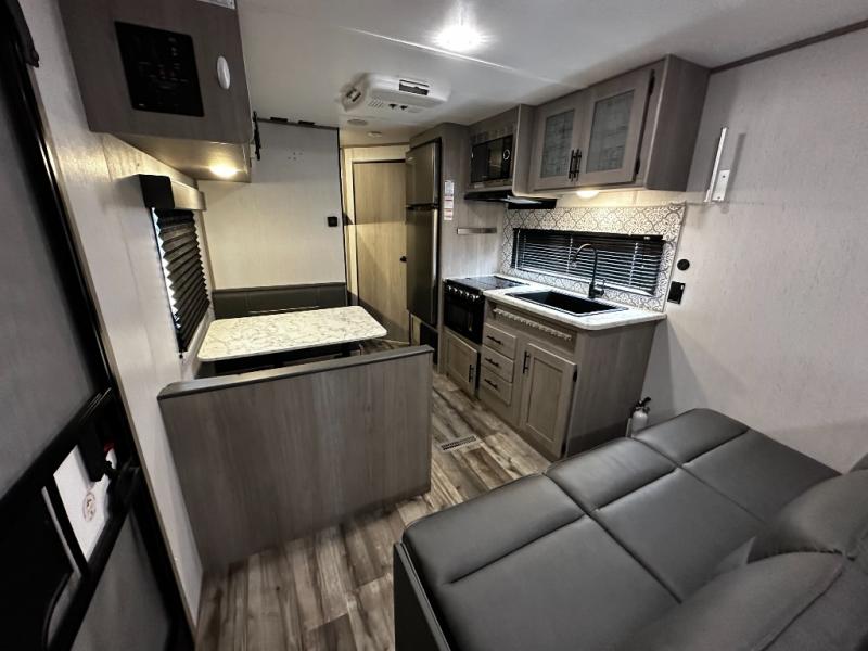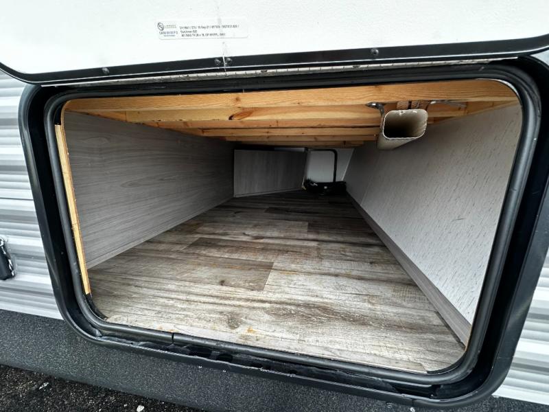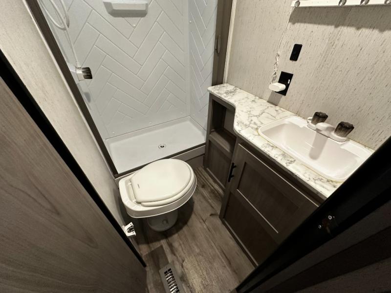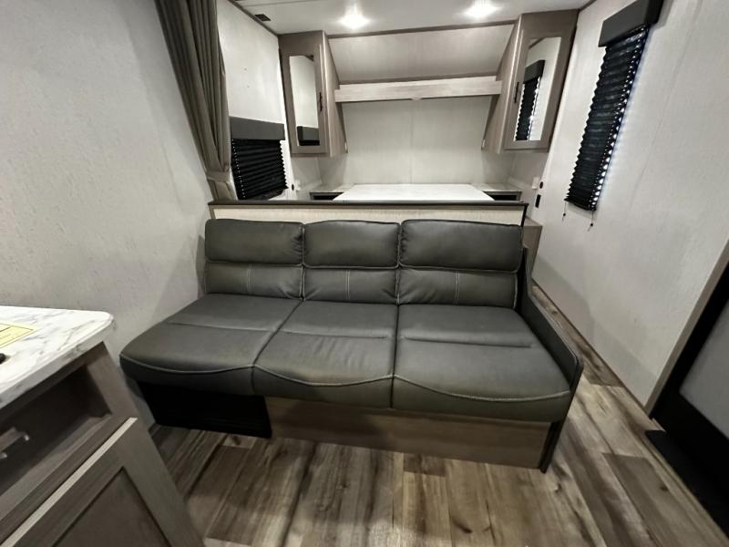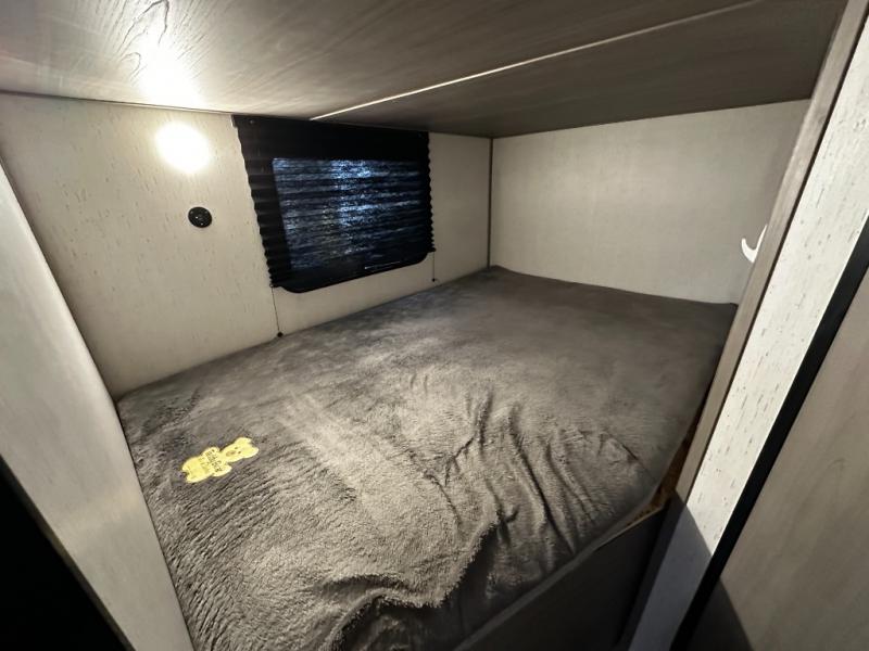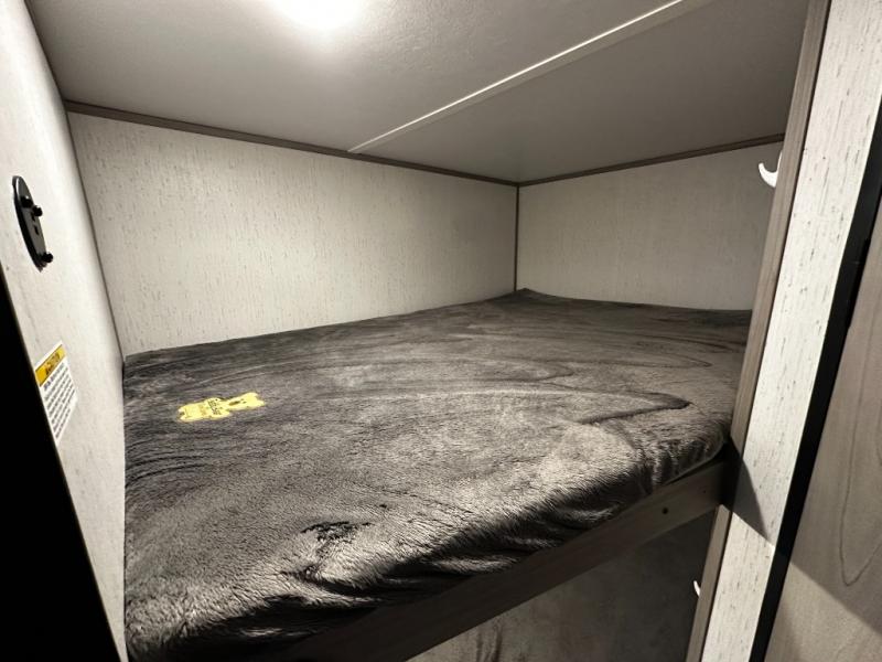 You can't go wrong with this travel trailer in tow! Whether you're relaxing under the 14' power awning, cooking in the full kitchen, or playing a game at the booth dinette, memories will be made. The double-size bunks provide more sleeping space, and the front bedroom will give you your own space to enjoy. This model also includes a full bath so you don't have to use the camp's facilities, and the bath fan will keep everything fresh. This model also incudes a 10 cu. ft. refrigerator, overhead compartments, and a pass-through storage for your larger camp gear!