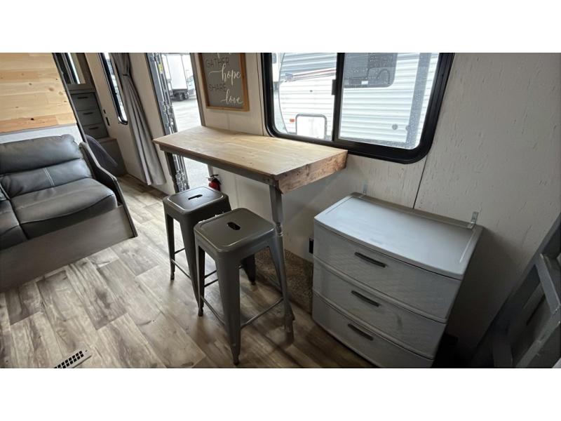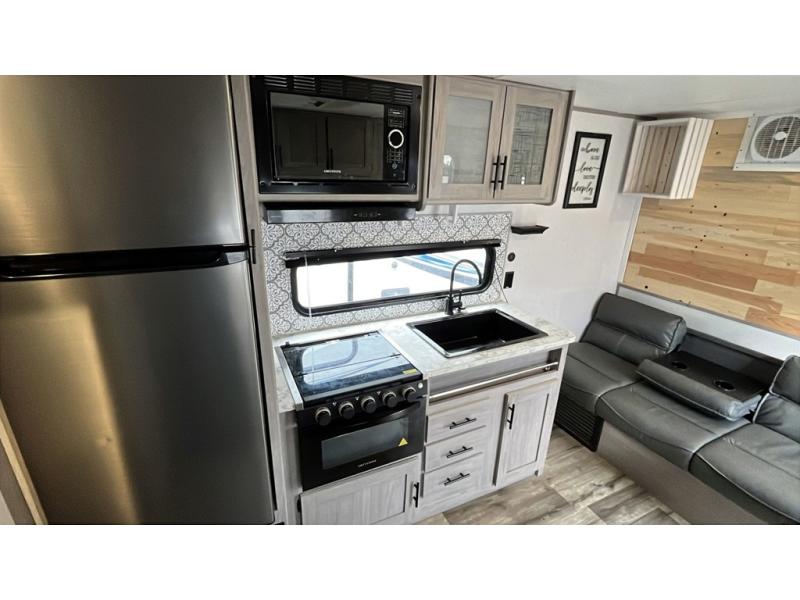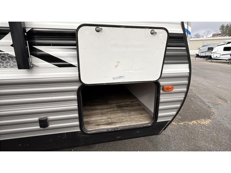 You can't go wrong with this travel trailer in tow! Whether you're relaxing under the 14' power awning, cooking in the full kitchen, or playing a game at the booth dinette, memories will be made. The double-size bunks provide more sleeping space, and the front bedroom will give you your own space to enjoy. This model also includes a full bath so you don't have to use the camp's facilities, and the bath fan will keep everything fresh. This model also incudes a 10 cu. ft. refrigerator, overhead compartments, and a pass-through storage for your larger camp gear!