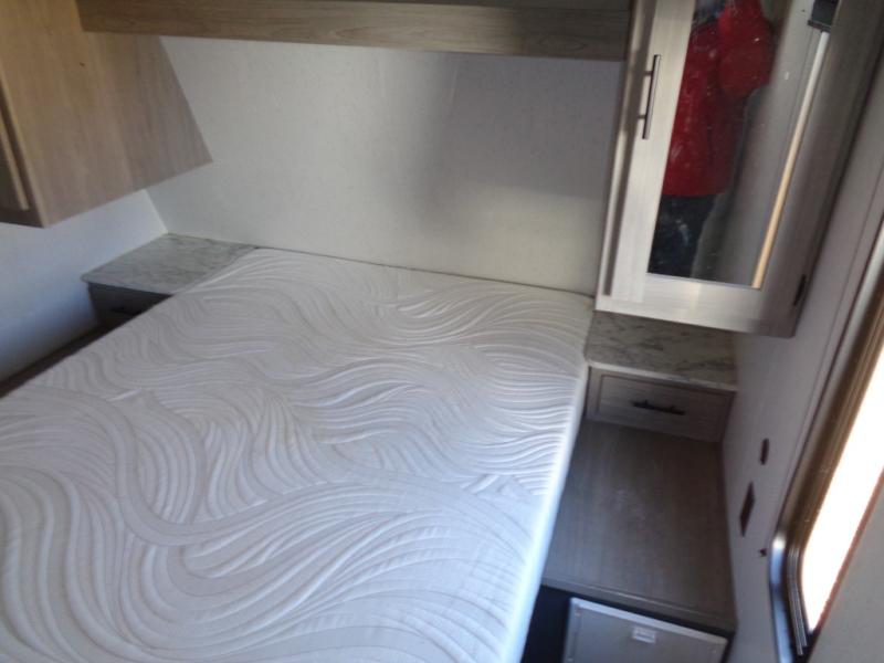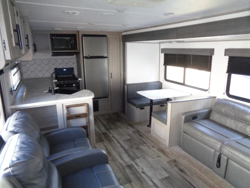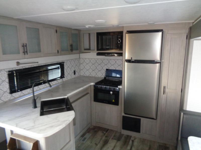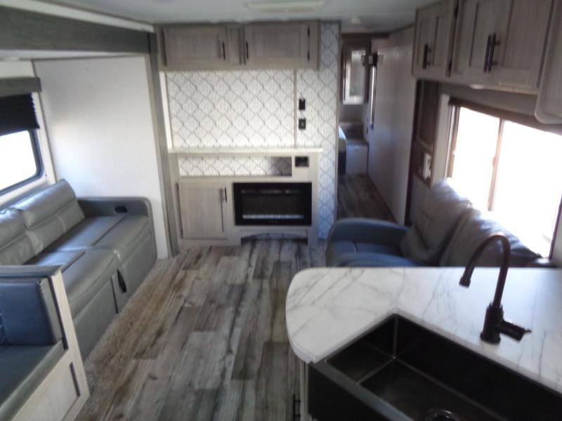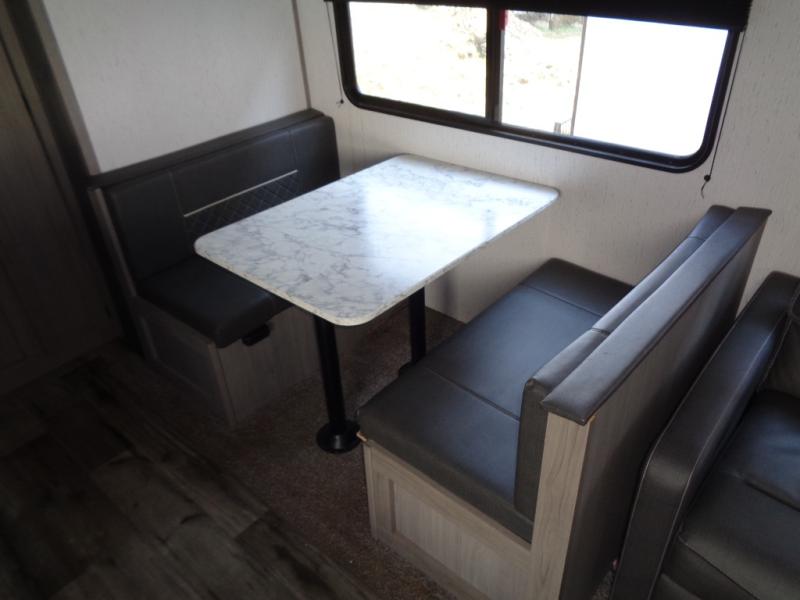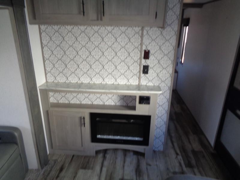 This rear kitchen trailer allows the cook limited interruptions when trying to whip up their famous camping meals! No need to squeeze in when someone needs by when the rear of the trailer includes the kitchen appliances, a U-shaped countertop and there is a slide out with the booth dinette and reclining sofa giving this combined area lots of floor space. Everyone can enjoy the fireplace, and the two swivel rockers will be popular seating. The full bathroom can help keep everyone refreshed and cleaned for bedtime or for the next adventure outdoors. And the 16' power awning offers an outdoor living area with LED light to be able to stay up late to enjoy the campsite. There is storage found throughout, plus the pass-through compartment allows for those longer items.