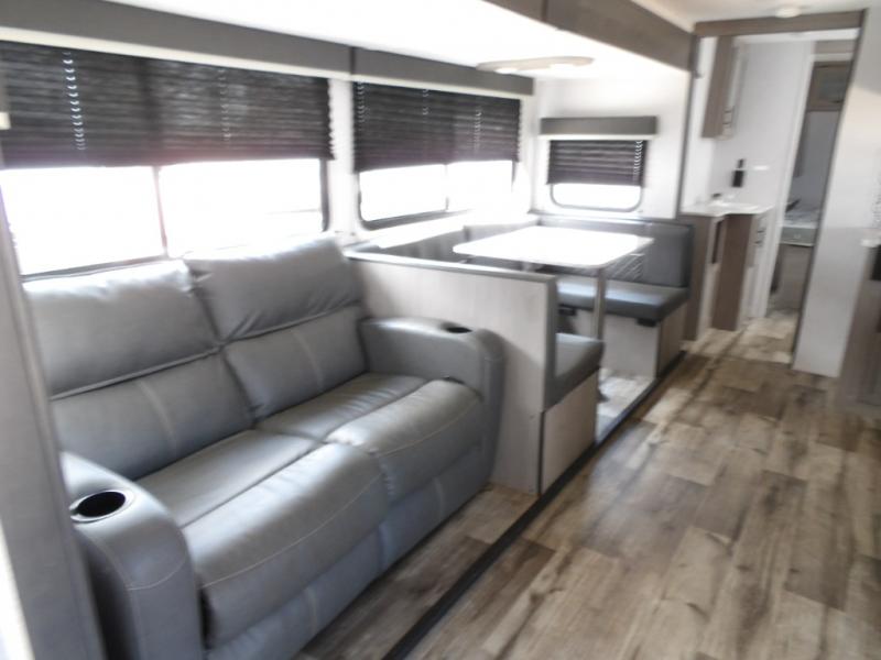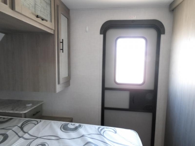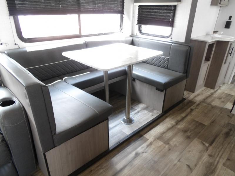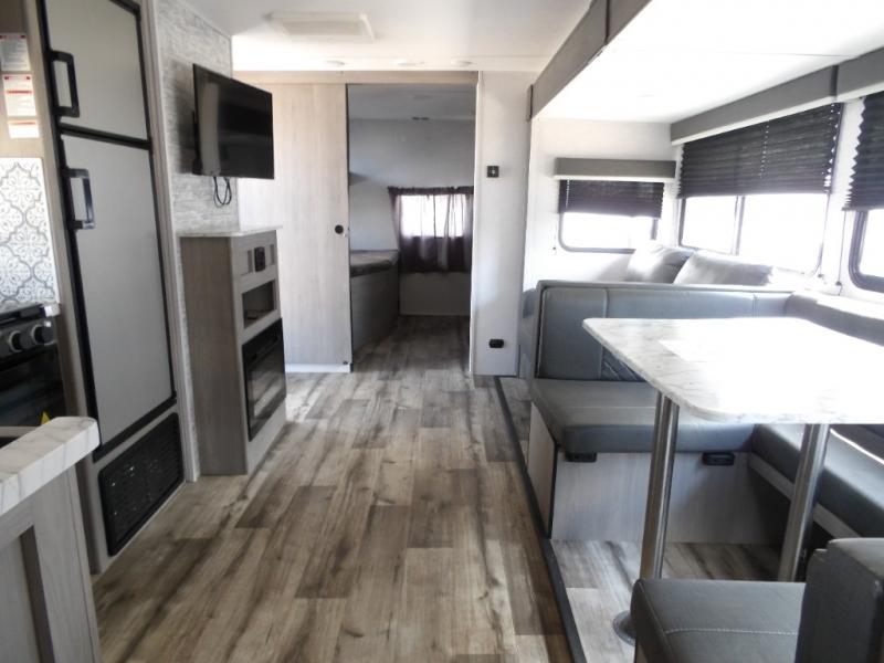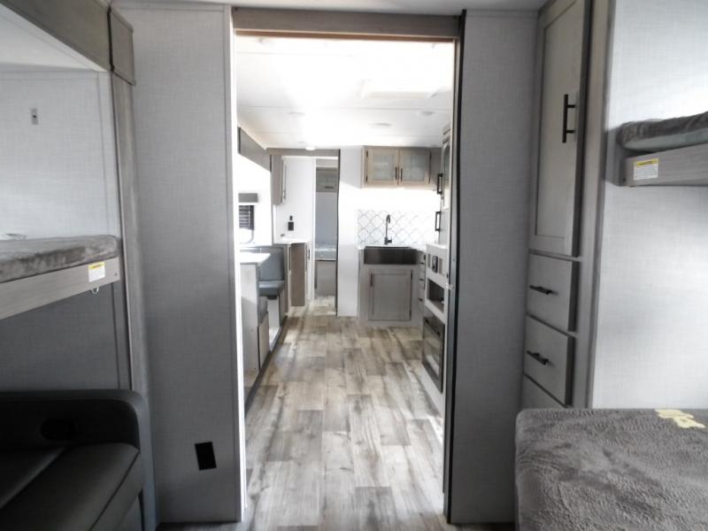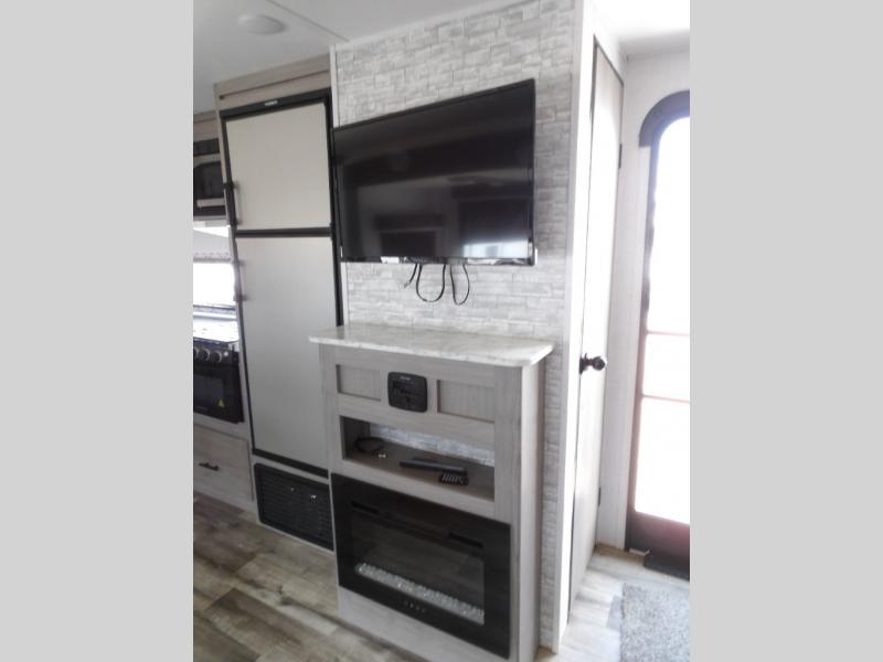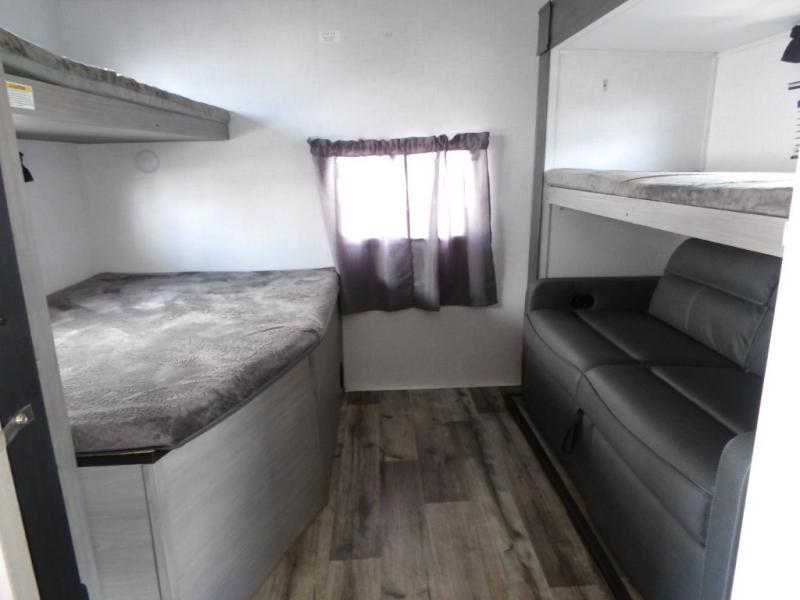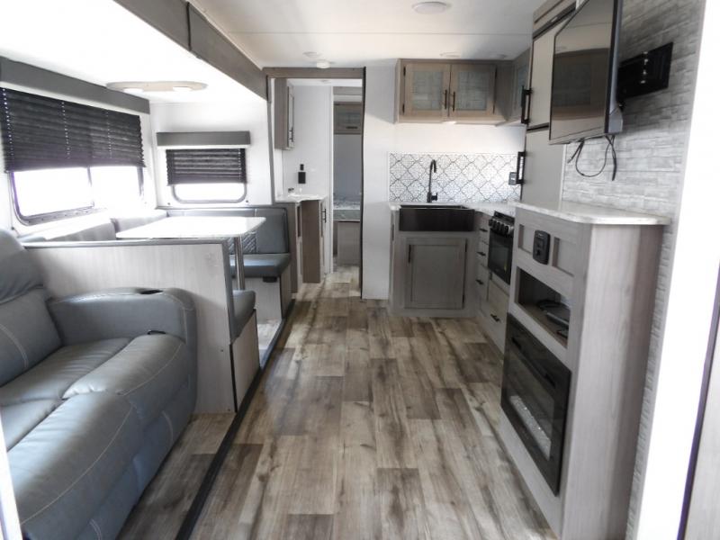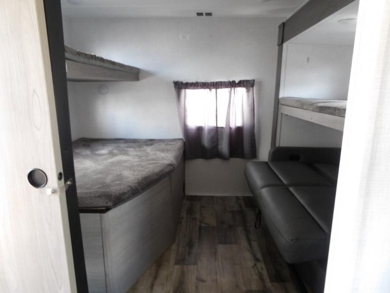 If you need a lot of space to sleep an entire family, this Coleman Light travel trailer is going to be your best choice! There is a private bunkhouse that has a flip-up bunk, sofa, a set of bunks, and a slide out, and there is also a private bedroom with a residential queen bed at the front of this trailer. You can even use the reclining sofa and U-shaped dinette as additional sleeping locations. The exterior is outfitted with excellent features, like an outside shower, outdoor kitchen, two entry doors, 18' power awning, and pass-through storage. Back on the interior, you'll find a fireplace to add a little extra heat on chilly evenings, and the walk-through bathroom can be accessed both from the main living area and the front bedroom.