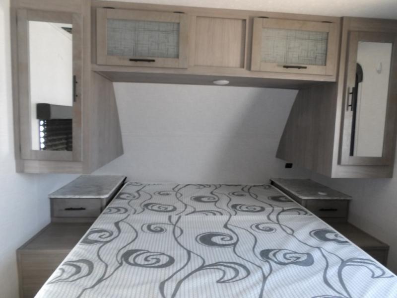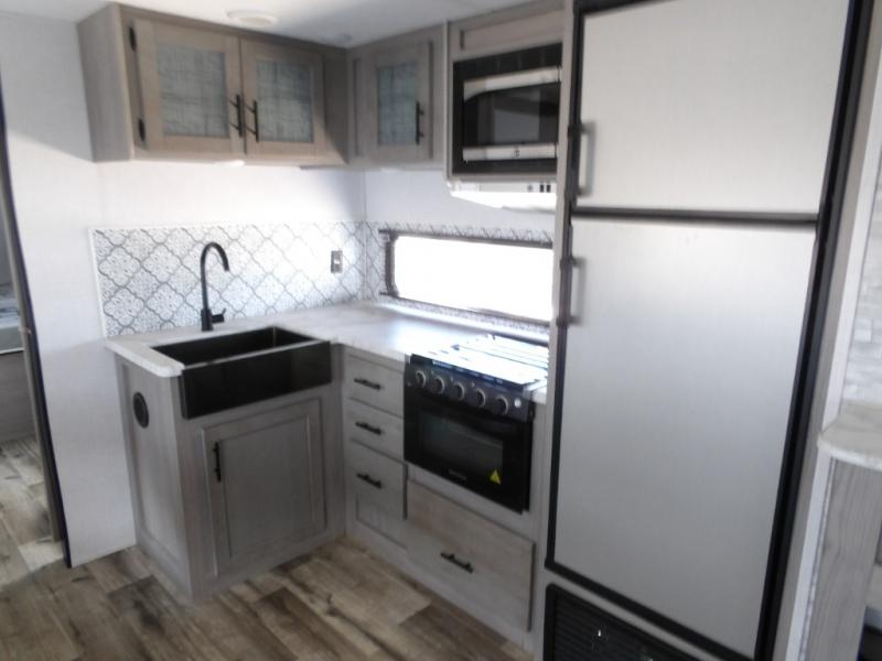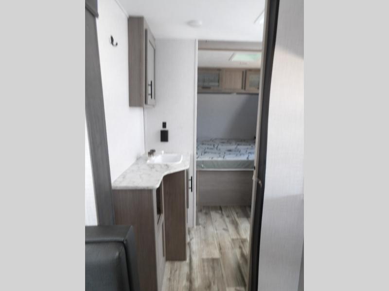 The Dutchmen Coleman Light travel trailer features an upgraded kitchen package with residential appliances, high-rise faucets, and a stainless steel farm-style sink. The fully enclosed underbelly allows all of your trailer's vital functions to be kept out of the freezing cold, and you'll have great stability as you enter your trailer by using the solid entry steps. Each model includes power stabilizer jacks, a power tongue jack, dual 20-LB propane tanks, a residential queen bed, and preparations for Wi-Fi 4G LTE. There is an aerodynamic front fiberglass cap, exterior speakers, solar charging connection, and aluminum wheels.
