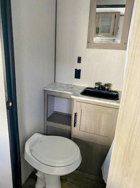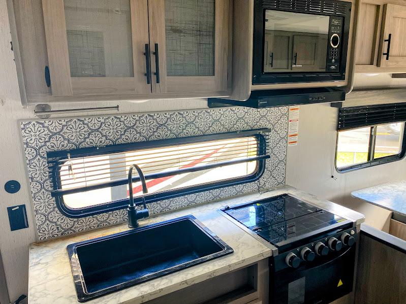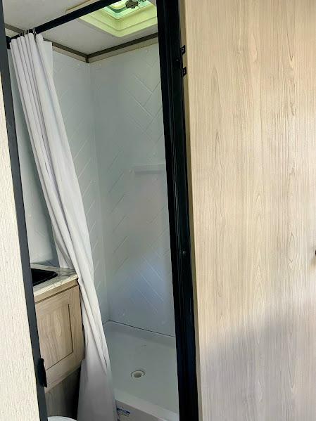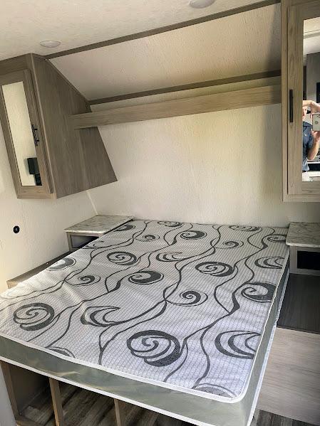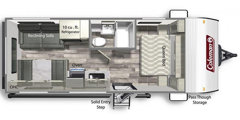 Your tent-camping days are over with this travel trailer in tow! Once you arrive at your destination, grab your fishing poles from the pass-through storage and head down to the lake. The full bath will allow you to freshen up when you return, plus there is a bath skylight for added standing space. The chef of your group can prepare dinner on the cooktop or oven, and perishables can be stored in the 10 cu. ft. refrigerator. There is a booth dinette where you can dine at, and a reclining sofa for extra seating space. You will love having your own queen bed up front with dual wardrobes on either side, and your guests can sleep on the furniture in the back!