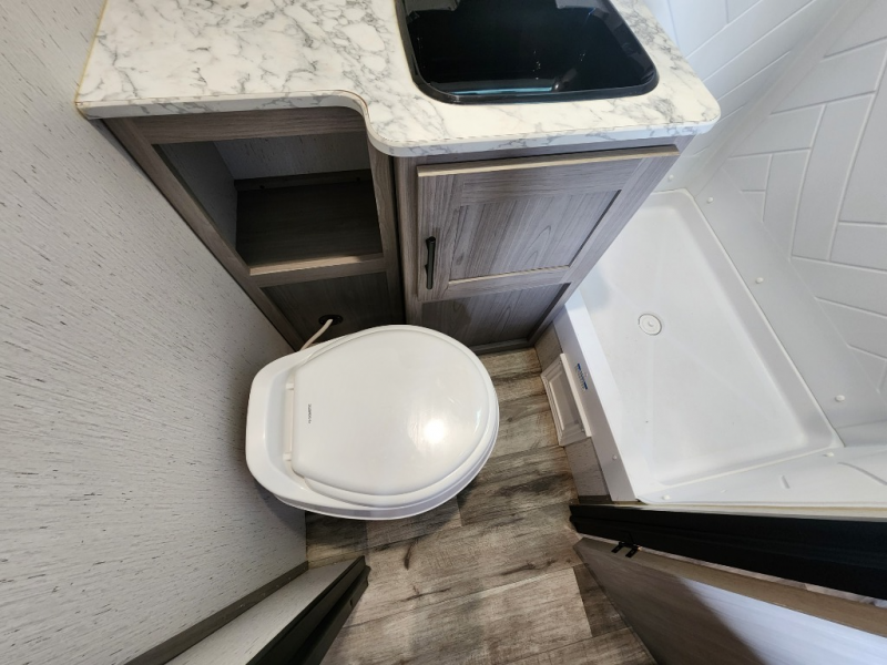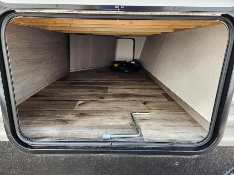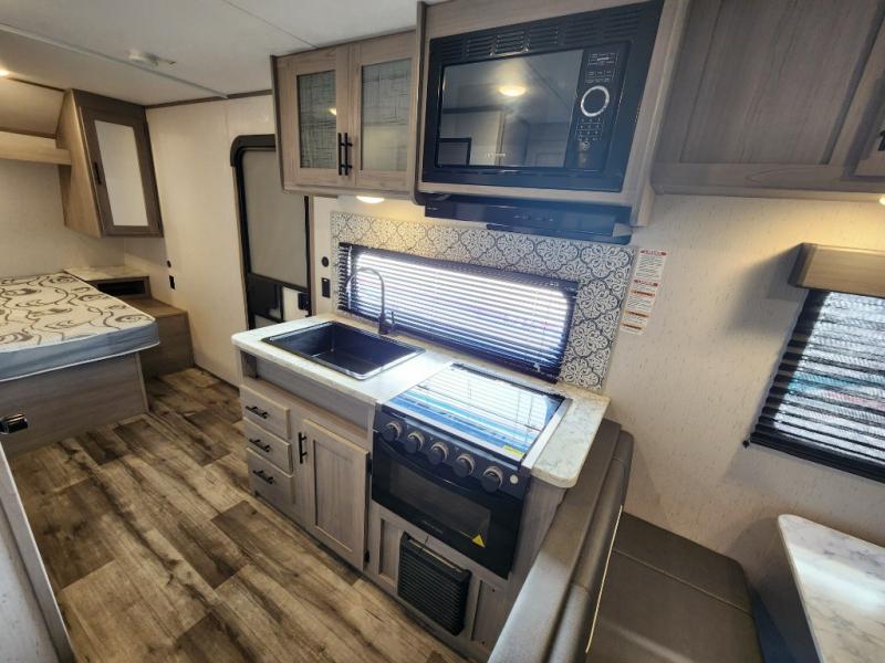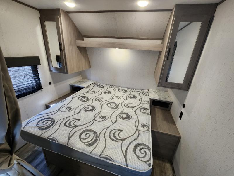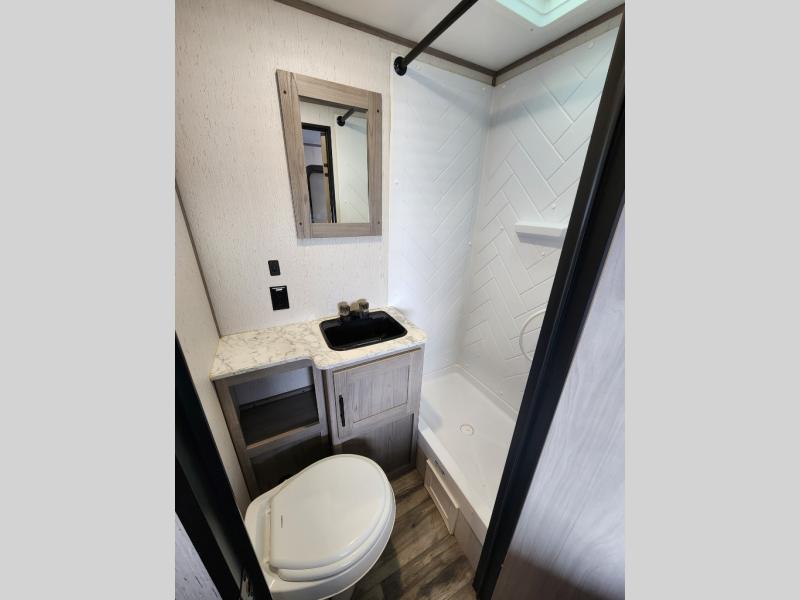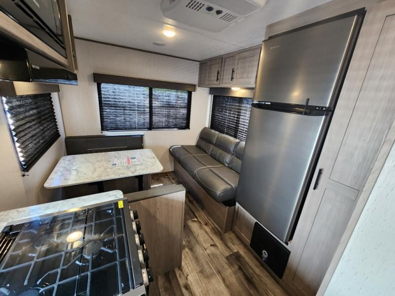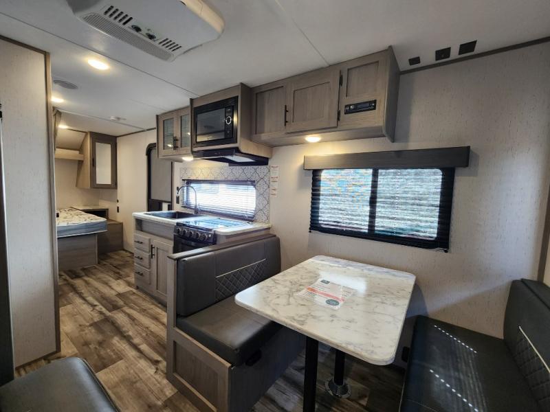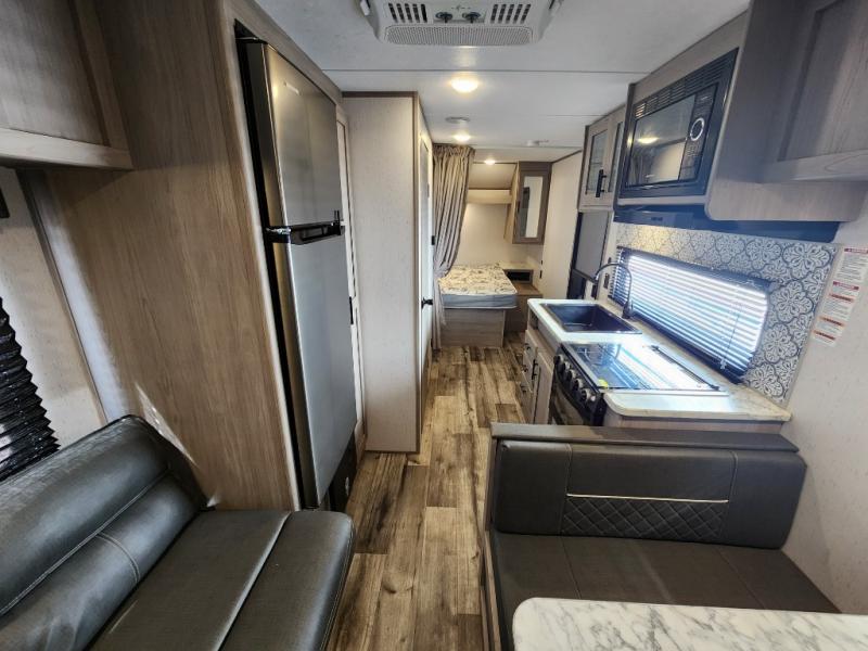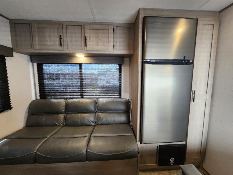 Your tent-camping days are over with this travel trailer in tow! Once you arrive at your destination, grab your fishing poles from the pass-through storage and head down to the lake. The full bath will allow you to freshen up when you return, plus there is a bath skylight for added standing space. The chef of your group can prepare dinner on the cooktop or oven, and perishables can be stored in the 10 cu. ft. refrigerator. There is a booth dinette where you can dine at, and a reclining sofa for extra seating space. You will love having your own queen bed up front with dual wardrobes on either side, and your guests can sleep on the furniture in the back!